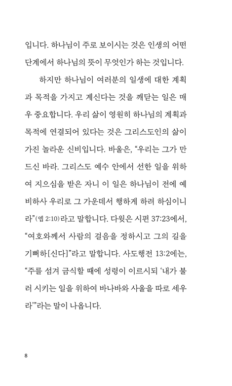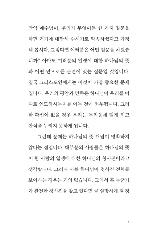 ¡ºÇϳª´ÔÀÇ ¶æÀ» ¾Ë·Á¸é¡»Àº ¡®Çϳª´ÔÀÇ ¶æ¡¯À̶ó´Â Àͼ÷ÇÏÁö¸¸ ¸ðÈ£ÇÑ °³³äÀ» Á¤¸®ÇØ ÁØ´Ù. ÁøÇÐ, Ãë¾÷, °áÈ¥ µî ¿ì¸®´Â »ì¸é¼­ ¼ö¸¹Àº ¼±ÅÃÀ» ÇØ¾ß Çϰí, ±×¸®½ºµµÀÎÀ̶ó¸é ±× ¼±ÅÃÀÌ Çϳª´ÔÀÇ ¶æ°ú ÀÏÄ¡Çϱ⸦ ¹Ù¶óÁö¸¸, Çϳª´ÔÀÇ ¶æÀ» ¾Ë±â¶õ ±×·¸°Ô ½±Áö ¾Ê´Ù. Çϳª´ÔÀÇ ¶æÀ̶ó´Â °³³ä¿¡ ´ëÇÑ ¿ÀÇØ¿Í È¥¶õ, ±×¸®°í Àεµ¸¦ ±¸ÇÏ´Â ÀÌÀÇ À߸øµÈ Àǵµ¿Í °íÁý µîÀÌ Çϳª´ÔÀÇ Àεµ¸¦ ¹Þ´Â °ÍÀ» ¹æÇØÇϱ⠶§¹®ÀÌ´Ù. ÀúÀÚ´Â ±×¸®½ºµµÀεéÀÌ ½±°Ô ¹üÇÏ´Â ¿À·ù¿Í ½Ç¼öµéÀ» Á¡°ËÇϰí, Çϳª´ÔÀÌ ÀεµÇϽô ¿ø¸®¸¦ Á¦½ÃÇÔÀ¸·Î½á °Ç°­ÇÏ°í ¼º°æÀûÀÎ ¹æ½ÄÀ¸·Î ±×ºÐÀÇ ¶æÀ» ã¾Æ°¥ ¼ö ÀÖµµ·Ï µ½´Â´Ù.