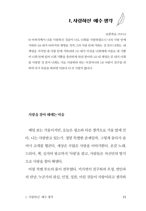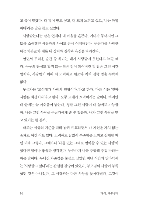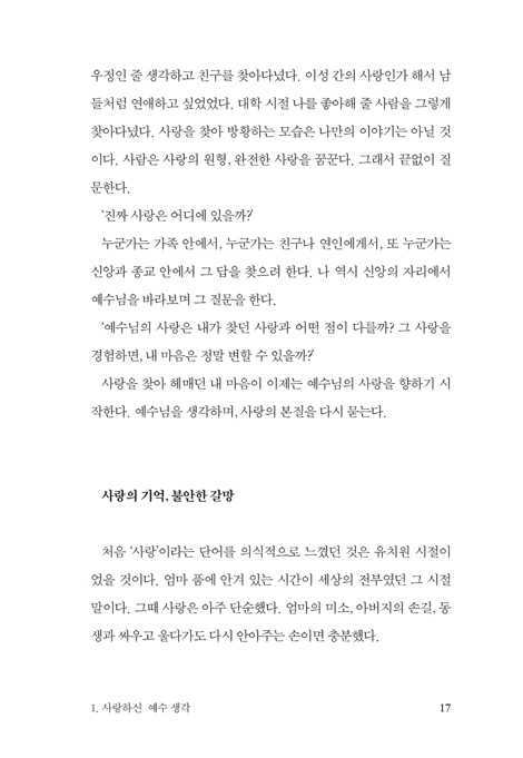 ¿¹¼ö´ÔÀÇ ¼ºÇ°À» »ý°¢ÇÏ¸é »ç¶ûÀÌ ¹«¾ùÀÎÁö ´Ù½Ã ¹¯°Ô µÈ´Ù. °â¼Õ, Àγ», ¼øÁ¾, °ø°¨-ÀÌ ¸ðµç °ÍÀº ¼º°æ ¼Ó¿¡ ¸Ó¹«´Â ´Ü¾î°¡ ¾Æ´Ï¶ó ¿¹¼ö´ÔÀÌ ³»°Ô ½ÇÁ¦·Î º¸¿©ÁֽŠ»îÀÇ ¸ð½ÀÀ̾ú´Ù. ³¡±îÁö »ç¶ûÇϽŠ¿¹¼ö´ÔÀ» ¶°¿Ã¸± ¶§¸é ³» ¾È¿¡ ¸ØÃç ÀÖ´ø ³»¸é¼¼°è°¡ ´Ù½Ã ¿òÁ÷À̱⠽ÃÀÛÇß´Ù. ³»°¡ Æ÷±âÇß´ø °ü°è, ¿Ü¸éÇß´ø ³» »óó, »ç¶ûÇϱ⸦ µÎ·Á¿öÇß´ø ¼ø°£µéÀÌ Á¶±Ý¾¿ ¿­¸®±â ½ÃÀÛÇß´Ù. ±×ºÐÀÇ »ç¶ûÀ» »ý°¢ÇÏÀÚ ´Ù½Ã ½ÃÀÛÇÒ ¿ë±â°¡ »ý°å´Ù.