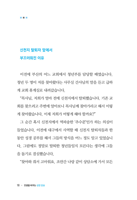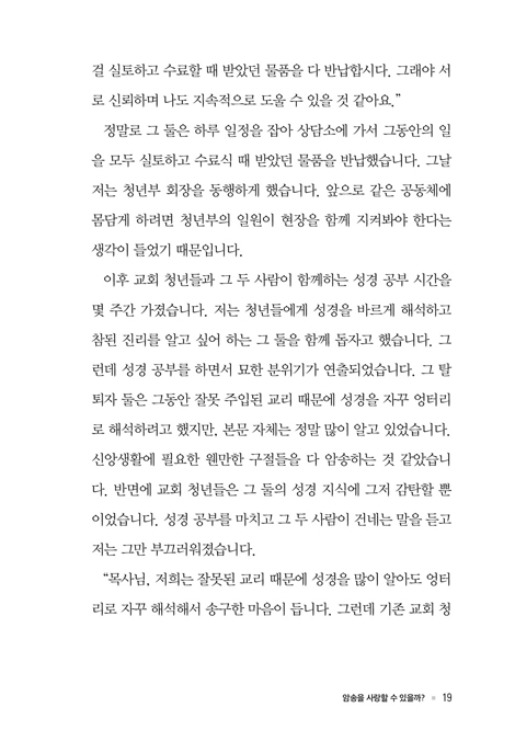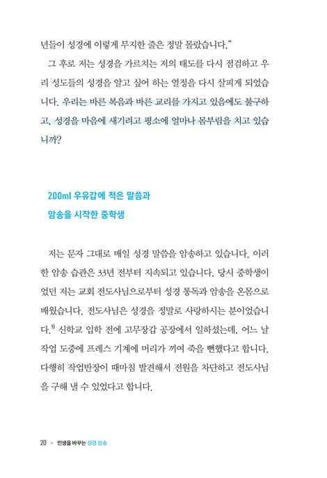 ô ½ºÀ©µ¹ ¸ñ»ç´Â ¡°±×¸®½ºµµÀÎÀÇ »î¿¡¼ ÃÖ°íÀÇ ÈÆ·ÃÀº ¼º°æ ¾Ï¼Û¡±À̶ó°í ¸»Çß°í, ±âµ¶±³ ¿µ¼º°¡ ´Þ¶ó½º ¿ù¶óµå ¹Ú»ç´Â ¡°¼º°æ ¾Ï¼ÛÀÌ ¿µÀû ¼ºÀåÀÇ Àý´ëÀû ±âÃÊ´Ù¡±¶ó°í Çß´Ù. ¼ºµµ¶ó¸é ¸ðµÎ°¡ »ý¸íÀÇ ¾ç½ÄÀÎ ¸»¾¸À» °¡±îÀÌÇØ¾ß ÇÒ Çʿ伺°ú Àǹ«¸¦ ´À³¤´Ù. ±×·¯³ª Çö½ÇÀº ¸Å³â ½ÇÆÐ¸¦ µÇÇ®ÀÌÇØ¼ °Åµì ´ÙÁüÇϱ⿡µµ ¹Î¸ÁÇÑ °ÍÀÌ ¼º°æ Åëµ¶°ú ¾Ï¼ÛÀÌ´Ù. ¸»¾¸À» »ó°íÇÏ´Â ´ë½Å ¾ÆÄ§¿¡ ´«À» ¶ßÀÚ¸¶ÀÚ ÈÞ´ëÆùÀ» È®ÀÎÇϰí, SNS¿Í µµÆÄ¹Î Áßµ¶¿¡ ºüÁ® Á¤½ÅÀû °øÇãÇÔÀ» ´À³¢´Â ÀÏÀÌ Çã´ÙÇÏ´Ù. ¹Ù»Û ÀÏ»ó°ú ÀÚ±ØÀûÀÎ ¼¼»óÀÇ ÄÜÅÙÃ÷¿¡ ½Ã°£À» »©¾Ñ°Ü ¼º°æÀ» ÀÐÁö ¾Ê´Â ÀÚ½ÅÀÇ »óŸ¦ ¸ð¸¥ ôÇÏ´Â ¼ºµµµéµµ ÀûÁö ¾Ê´Ù. ¡ºÀλýÀ» ¹Ù²Ù´Â ¼º°æ ¾Ï¼Û¡»Àº ÀÌ·¯ÇÑ ¿µÀû Ÿ¸À» ¹Ý¼ºÇϸç, ¸»¾¸ ¾Ï¼ÛÀ̾߸»·Î ¿ì¸® ÀλýÀÇ ±Ëµµ¸¦ ¹Ù²Ù¾î ÁÙ °·ÂÇÑ µµ±¸ÀÓÀ» ¼±¾ðÇÑ´Ù. ¾îÁ¦ ½ÇÆÐÇß´Ù¸é ¿À´Ã ´Ù½Ã ½ÃµµÇϰí, ´Ã µ¹ÀÌÄÑ °á½ÉÇØ¾ß ÇÒ °ÍÀÌ ¸»¾¸ »ýȰÀÌ´Ù. ¡ºÀλýÀ» ¹Ù²Ù´Â ¼º°æ ¾Ï¼Û¡»À» Àаí, ¼º°æÀÇ ¸Æ¶ôÀ» Àâ´Â ¡ºÀλýÀ» ¹Ù²Ù´Â 200±¸Àý¡»(½ÇõÆí)À» ÅëÇØ ¹æ¹ýÀ» µû¶óÇÏ´Ù º¸¸é ¾î´À»õ ¸»¾¸ÀÌ ³» »îÀ» ¿òÁ÷ÀÌ´Â ÀºÇýÀÇ Ã¼Çè¿¡ ÇÕ·ùÇÒ ¼ö ÀÖÀ» °ÍÀÌ´Ù.