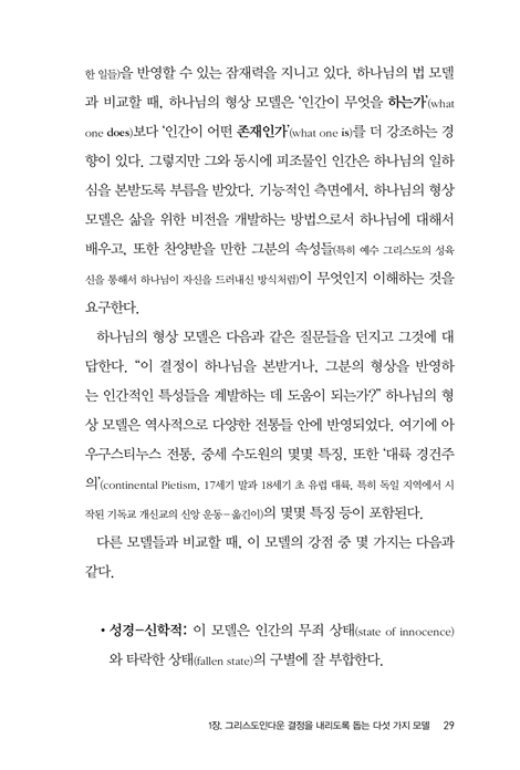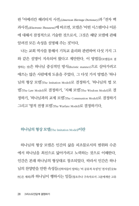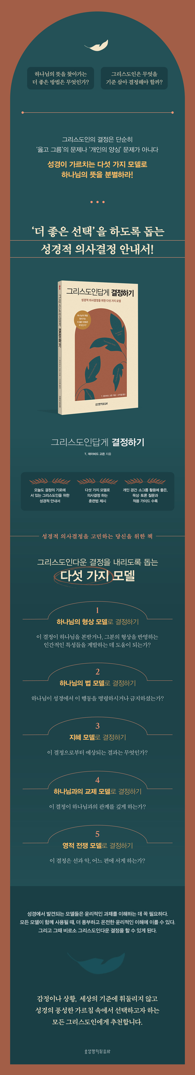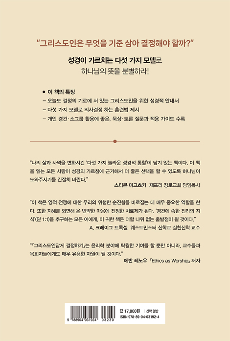 ÀÌ Ã¥Àº ÀÌ·¯ÇÑ °í¹ÎÀ» ¸¶ÁÖÇÏ´Â ±×¸®½ºµµÀεéÀ» À§ÇØ, ¼º°æ°ú ±âµ¶±³ ÀüÅë¿¡ ±Ù°ÅÇÑ ½ÇõÀû ÀÇ»ç°áÁ¤ÀÇ Æ²À» Á¦½ÃÇÑ´Ù. ÀúÀÚ T. µ¥À̺ñµå °íµçÀº ±×¸®½ºµµÀÎÀÇ °áÁ¤À» ´Ü¼øÈ÷ ¡®¿Ç°í ±×¸§¡¯ÀÇ ¹®Á¦³ª ¡®°³ÀÎÀÇ ¾ç½É¡¯ ¹®Á¦·Î Ãà¼ÒÇÏÁö ¾Ê´Â´Ù. ´ë½Å ¼º°æ Àüü¿¡ È帣´Â ´Ù¼¸ °¡Áö ¸ðµ¨(Çϳª´ÔÀÇ Çü»ó ¸ðµ¨, Çϳª´ÔÀÇ ¹ý ¸ðµ¨, ÁöÇý ¸ðµ¨, Çϳª´Ô°úÀÇ ±³Á¦ ¸ðµ¨, ¿µÀû ÀüÀï ¸ðµ¨)À» ÅëÇØ ±×¸®½ºµµÀÎÀÌ ¡®ÁÁÀº ¼±Åá¯À» ³Ñ¾î ¡®´õ ÁÁÀº ¼±Åá¯À» ºÐº°Çϵµ·Ï µ½´Â´Ù. ÀÌ ´Ù¼¸ ¸ðµ¨Àº ¼·Î¸¦ º¸¿ÏÇϸç ÇÔ²² ÀÛµ¿ÇÏ´Â ÅëÇÕÀû »ç°íÀÇ Æ²·Î¼, ¼±ÅÃÀÇ ¼ø°£¸¶´Ù Çϳª´Ô ¾Õ¿¡¼ ÁöÇý·Ó°Ô ÆÇ´ÜÇϵµ·Ï À̲ö´Ù.