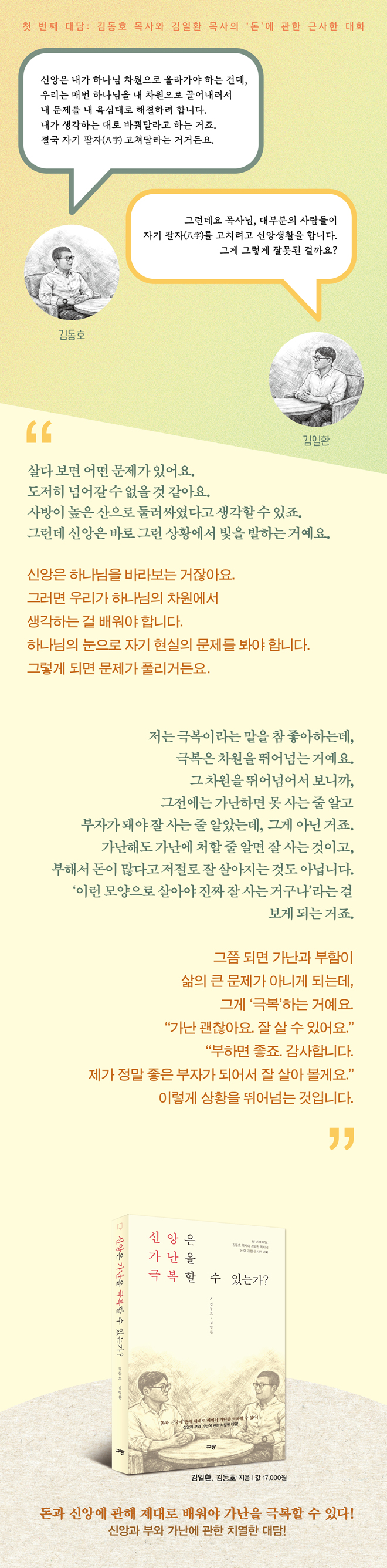 ÀÇ¹Ì ÀÖ´Â Àǹ®ÀÌ °Å¼¼µÈ ½Ã´ë¿¡¼, ¸¹Àº Å©¸®½ºÃµÀÌ ±èÀÏȯ ¸ñ»ç¿Í °°Àº Àǹ®À» ǰ°í ÀÖÀ¸¸®¶ó. ¿ì¸®°¡ ½Å¾ÓÀ̶ó°í ¹è¿ö¿Â °ÍµéÀº, Á¤³ç ÆÅÆÅÇÑ Çö½Ç¿¡¼ »îÀ» ±Øº¹Çس»´Â À¯È¿ÇÑ ±æÀÌ µÇ´Â°¡? ±×µéÀÇ ´ë´ã¿£ ¡®¹ÏÀ¸¸é ´Ù µÈ´Ù¡¯´Â ÇêµÈ ¼Ò¸ÁÀº ¾ø´Ù. ´ë½Å¿¡ µÑ·¯½Ñ »óȲ°ú »ó°ü¾øÀÌ ±Ù»çÇÑ »îÀ» »ì¾Æ³¾ ¼ö ÀÖ´Â Çö½ÇÀûÀÎ ÁöÇý¿Í ¿øÄ¢µéÀÌ ¹«¼öÈ÷ Á¦½ÃµÇ°í ÀÖ´Ù. °¡³Çصµ ºñ±¼ÇÏÁö ¾Ê°í ±Ù»çÇÏ°Ô »ç´Â ¹ý, ºÎÀ¯ÇÒ ¶§ ±³¸¸ÇÏÁö ¾Ê°í Çϳª´ÔÀÌ Áֽе·À» Àß ¾²´Â ¹ý, ½Å¾Ó°ú µ·¿¡ °üÇÑ ±Ù»çÇÑ ´ëȵéÀÌ ½¯ »õ ¾øÀÌ ÆîÃÄÁø´Ù.