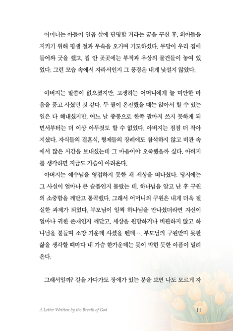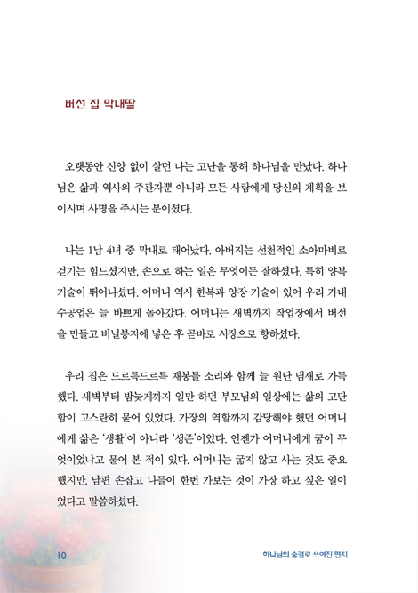 Ã¥À» ÀÐ¾î ³»·Á°¡´Ù º¸¸é Áý»ç´ÔÀÇ »îÀº °áÄÚ ¼øÅºÇÑ ±æ¸¸Àº ¾Æ´Ï¾úÀ½À» ¾Ë°Ô µË´Ï´Ù. Áúº´°ú ¾î·Á¿ò, °ü°èÀÇ ¾ÆÇİú °æÁ¦Àû °í³±îÁö, »ç¶÷À̶ó¸é ´©±¸³ª µÎ·Á¿öÇÒ ¼ø°£µéÀ» Áö³ª¿À¼Ì½À´Ï´Ù. ±×·¯³ª ±× ¸ðµç ±æ¸ñ¸¶´Ù, Çϳª´ÔÀº Áý»ç´ÔÀÇ ¼ÕÀ» °áÄÚ ³õÁö ¾ÊÀ¸¼Ì°í, ¿ÀÈ÷·Á ±× °úÁ¤À» ÅëÇØ ¹ÏÀ½À» ¿¬´ÜÇϰí, ÁÖ´ÔÀÇ ÀºÇý¸¦ ´õ¿í ±íÀÌ ±ú´Ý°Ô Çϼ̽À´Ï´Ù. Áý»ç´ÔÀº ÀÌ ¸ðµç À̾߱⸦ ¼ÖÁ÷ÇÏ°í ´ã¹éÇÏ°Ô ±â·ÏÇϸç, ±× ¼Ó¿¡¼ µå·¯³ Çϳª´ÔÀÇ ½Å½ÇÇϽÉÀ» °£ÁõÇϰí ÀÖ½À´Ï´Ù.