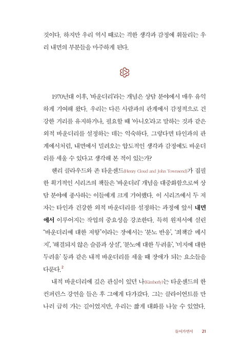 °³ÀÎÀÇ ¼ºÀåÀ» À§Çؼ´Â ´ëÀΰü°è¿¡ ¹Ù¿î´õ¸®¸¦ ¼¼¿ö¾ß ÇϵíÀÌ, ³»¸é¼¼°è¿¡µµ °Ç°ÇÑ ¹Ù¿î´õ¸®¸¦ ¼¼¿ö¾ß ÇÑ´Ù. ¿ì¸® ¿µÈ¥ÀÇ ´Ù¾çÇÑ ºÎºÐµéÀÌ ¼·Î ¿¬°áµÇ°í ÅëÇÕµÉ ¶§ ºñ·Î¼Ò ¿ì¸®´Â Ä¡À¯¸¦ °æÇèÇϰí, °ü°è¸¦ ¸ÎÀ¸¸ç, »î¿¡¼ ÃÖ»óÀÇ ±â´ÉÀ» ¹ßÈÖÇÒ ¼ö ÀÖ´Ù. ¾Ù¸®½¼ Äî(Alison Cook)°ú Å´¹ú¸® ¹Ð·¯(Kimberly Miller)´Â ÀÌ ¿©Á¤À» ¾î¶»°Ô ½ÇõÇÒ ¼ö ÀÖ´ÂÁö¿¡ °üÇØ ¸Å¿ì À¯ÀÍÇϰí Èï¹Ì·Î¿ì¸é¼µµ ½Ç¿ëÀûÀΠåÀ» ¼¼»ó¿¡ ³»³õ¾Ò´Ù.