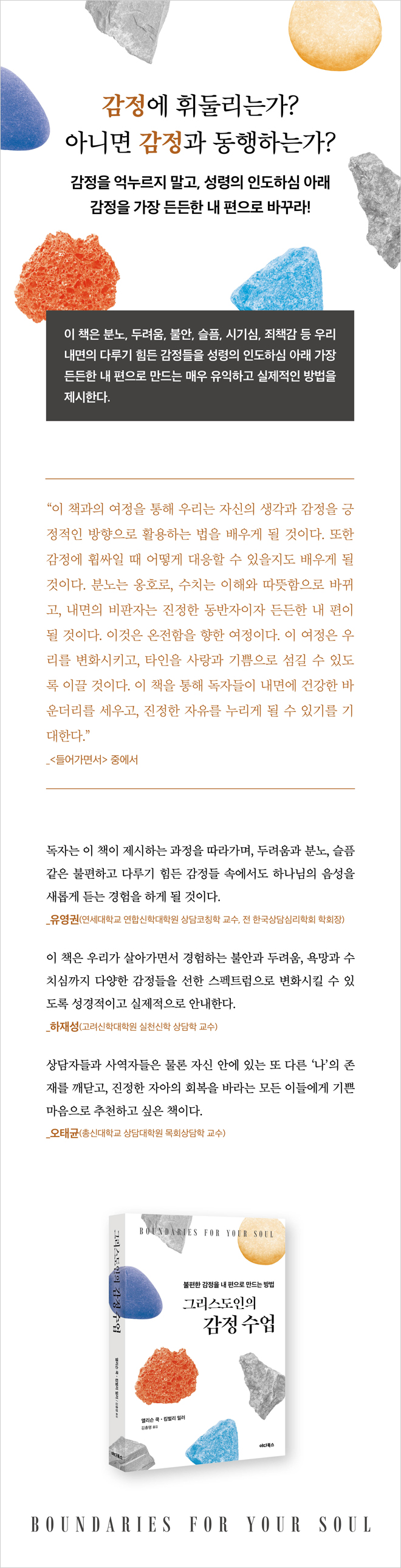 ¡°±×·±µ¥ ¾ÆÀÌ·¯´ÏÇϰԵµ ±«·Î¿î °¨Á¤À» ´Ù·ç´Â ¿ì¸®ÀÇ º»´ÉÀûÀÎ ¹æ½ÄÀÌ ¿ÀÈ÷·Á ¹®Á¦¸¦ ¾ÇȽÃŰ´Â °æ¿ì°¡ ¸¹´Ù. ¼±ÇÑ Àǵµ¸¦ °¡Áø »ç¶÷Àϼö·Ï ÀÚ½ÅÀÌ ½È¾îÇÏ´Â °¨Á¤À» ¾ï´©¸£°Å³ª ºÎÁ¤ÇÏ·Á ÇÑ´Ù. ¿øÄ¡ ¾Ê´Â Ãæµ¿¿¡ ´ëÇØ °¡Àå ÀÚÁÖ º¸ÀÌ´Â ¹ÝÀÀÀº ¡®ÀÌ°É ±Øº¹ÇØ¾ß ÇÑ´Ù¡¯ ¶Ç´Â ¡®ÀÌ·± »ý°¢À» ¸ØÃç¾ß ÇÑ´Ù¡¯¶ó´Â °ÍÀÌ´Ù. ÇÏÁö¸¸ »ó´ãÀڷμ ÀúÀÚÀÎ ¿ì¸®ÀÇ °æÇè¿¡ ºñÃß¾î º¼ ¶§, ÀÌ·¯ÇÑ Á¢±ÙÀº ´ëºÎºÐ È¿°ú°¡ ¾ø´Ù. ÀÌ Ã¥Àº °°Àº ¸ñÇ¥¸¦ ÇâÇ쵂 ´Ù¸¥ ±æÀ» Á¦½ÃÇÑ´Ù. ´õ ºü¸£°Ô °¡±â À§ÇØ ¿ÀÈ÷·Á õõÈ÷ °È´Â ¹æ½Ä, °ð ¡°¿À¶ó ¿ì¸®°¡ ¼·Î º¯·ÐÇÏÀÚ¡±(»ç1:18)¶ó´Â Á¢±ÙÀÌ´Ù. ÀÌ´Â ¿ì¸® ¿µÈ¥ÀÇ ¾ÆÇ ºÎºÐµéÀ» ÀÌÇØÇϰí, ³ª¾Æ°¡ ±×µé°ú Ä£ÇØÁö´Â ±æ·Î ¿ì¸®¸¦ À̲ö´Ù.¡± (23ÂÊ)