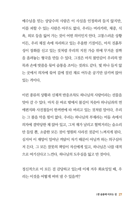 Çϳª´ÔÀº À̼ºÀÌ Èçµé¸®´Â °íÅëÀÌ ¾î¶°ÇÑ °ÍÀÎÁö Á÷Á¢ °æÇèÇØ º» »ç¶÷À» ¿ì¸®¿¡°Ô ¼³±³ÀÚ·Î Á̴ּÙ. _ 1Àå ¡°½½ÇÄ¿¡ À̸£´Â ±æ¡± ñé
