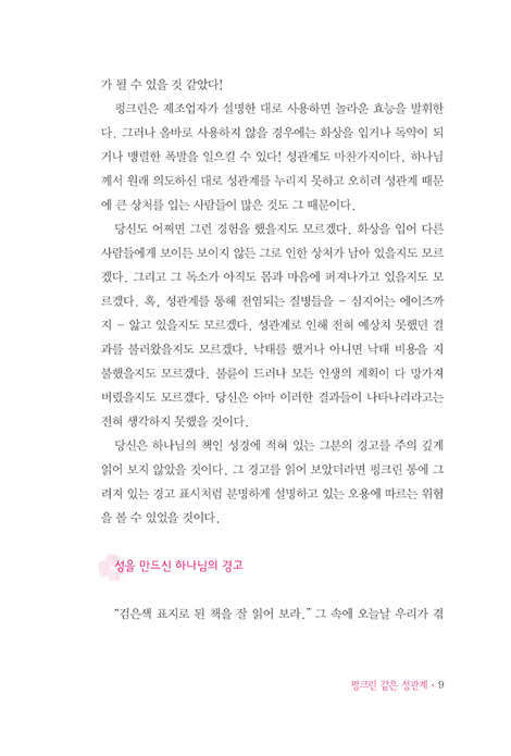 ÀÌ Ã¥Àº ´Ü¼øÇÑ ¼º±³À°¼°¡ ¾Æ´Ï¶ó, ½Å¾ÓÀÇ °üÁ¡¿¡¼ »îÀÇ °Å·èÇÔÀ» ȸº¹ÇÏ´Â ¿©Á¤¿¡ °üÇÑ Ã¥ÀÔ´Ï´Ù. ¼º(àõ)Àº Çϳª´Ô²²¼ ¼³°èÇϽŠ¾Æ¸§´ä°í °Å·èÇÑ ¼±¹°ÀÔ´Ï´Ù. ¼¼»óÀº ¼ºÀ» Äè¶ôÀ¸·Î ¿Ö°îÇÏÁö¸¸, ¼º°æÀº ±×°ÍÀ» »ç¶û°ú ¾ð¾àÀÇ Ç¥ÇöÀ¸·Î ¸»ÇÕ´Ï´Ù. ÄÉÀÌ ¾Æ´õ´Â ÀÌ Ã¥À» ÅëÇØ ¼ºÀº ´Ü¼øÇÑ À°Ã¼ÀÇ ¹®Á¦°¡ ¾Æ´Ï¶ó ¿µÀûÀÎ ¼øÁ¾ÀÇ ¹®Á¦¶ó°í °Á¶ÇÕ´Ï´Ù. ¼ø°áÀº ±Ý¿åÀÌ ¾Æ´Ï¶ó Çϳª´ÔÀ» ÇâÇÑ »ç¶û°ú °æ¿ÜÀÇ Ç¥ÇöÀÔ´Ï´Ù. È¥ÀÎ ¾È¿¡¼ ¼ºÀº °¡Àå ¾Æ¸§´ä°Ô ÇǾ¸ç, Çϳª´ÔÀÇ ÃູÀÌ ¸Ó¹´´Ï´Ù. ÀÌ Ã¥Àº ¼º¿¡ ´ëÇÑ ÁøÁöÇÑ ¼ºÂû°ú ÇÔ²², »î Àüü¸¦ Çϳª´Ô²² µå¸®´Â ±æÀ» º¸¿©ÁÝ´Ï´Ù.