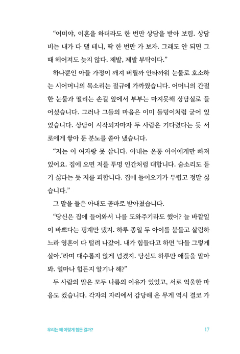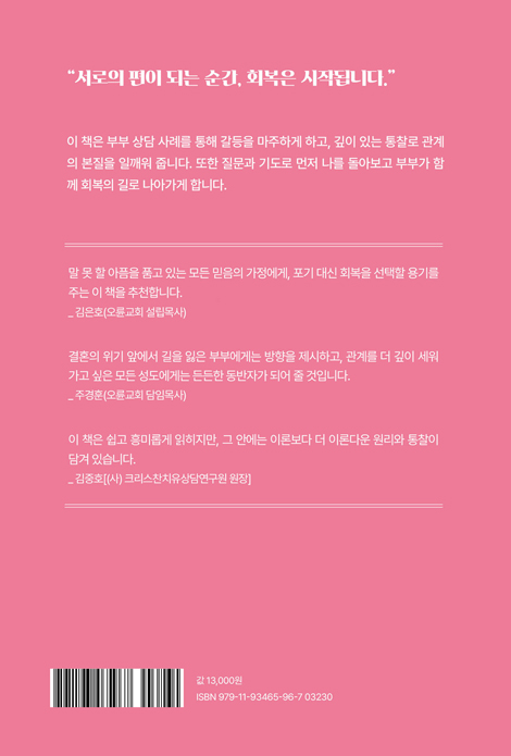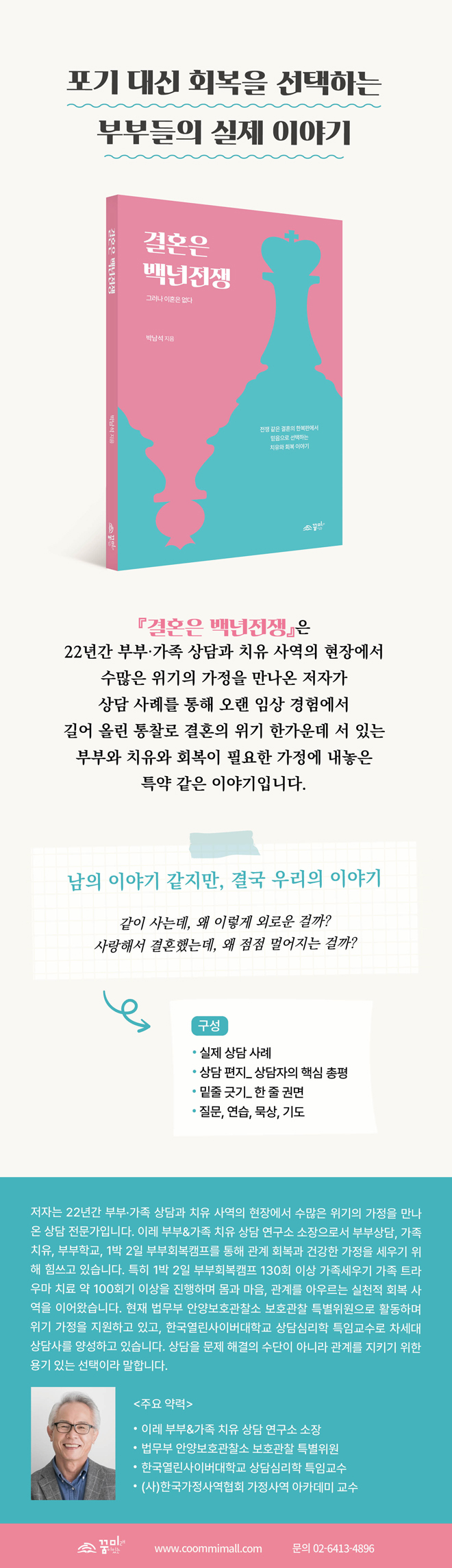 ÀúÀÚ´Â 22³â°£ ºÎºÎ¡¤°¡Á· »ó´ã°ú Ä¡À¯ »ç¿ªÀÇ ÇöÀå¿¡¼ ¼ö¸¹Àº À§±âÀÇ °¡Á¤À» ¸¸³ª¿Â »ó´ã Àü¹®°¡ÀÔ´Ï´Ù. ÀÌ·¹ ºÎºÎ&°¡Á· Ä¡À¯ »ó´ã ¿¬±¸¼Ò ¼ÒÀåÀ¸·Î¼ ºÎºÎ»ó´ã, °¡Á·Ä¡À¯, ºÎºÎÇб³, 1¹Ú 2ÀÏ ºÎºÎȸº¹Ä·ÇÁ¸¦ ÅëÇØ °ü°è ȸº¹°ú °Ç°ÇÑ °¡Á¤À» ¼¼¿ì±â À§ÇØ Èû¾²°í ÀÖ½À´Ï´Ù. ƯÈ÷ 1¹Ú 2ÀÏ ºÎºÎȸº¹Ä·ÇÁ 130ȸ ÀÌ»ó °¡Á·¼¼¿ì±â °¡Á· Æ®¶ó¿ì¸¶ Ä¡·á ¾à 100ȸ±â ÀÌ»óÀ» ÁøÇàÇÏ¸ç ¸ö°ú ¸¶À½, °ü°è¸¦ ¾Æ¿ì¸£´Â ½ÇõÀû ȸº¹ »ç¿ªÀ» À̾î¿Ô½À´Ï´Ù. ÇöÀç ¹ý¹«ºÎ ¾È¾çº¸È£°üÂû¼Ò º¸È£°üÂû Ưº°À§¿øÀ¸·Î Ȱµ¿Çϸç À§±â °¡Á¤À» Áö¿øÇϰí ÀÖ°í, Çѱ¹¿¸°»çÀ̹ö´ëÇб³ »ó´ã½É¸®ÇРƯÀÓ±³¼ö·Î Â÷¼¼´ë »ó´ã»ç¸¦ ¾ç¼ºÇϰí ÀÖ½À´Ï´Ù. »ó´ãÀ» ¹®Á¦ ÇØ°áÀÇ ¼ö´ÜÀÌ ¾Æ´Ï¶ó °ü°è¸¦ Áö۱â À§ÇÑ ¿ë±â ÀÖ´Â ¼±ÅÃÀÌ¶ó ¸»ÇÕ´Ï´Ù.