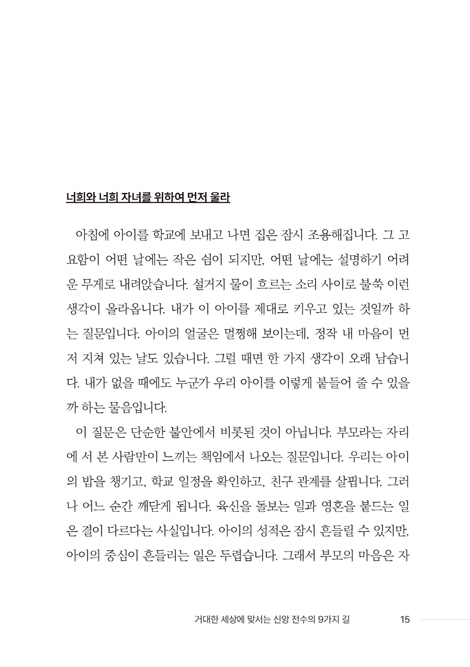 ½Å¾Ó Àü¼ö´Â ´Ü¼øÇÑ Áö½ÄÀÇ ±³À°ÀÌ ¾Æ´Ï¶ó °¡Á¤ ¾ÈÀÇ °ø±â¸¦ ÁöŰ´Â ÀÏÀÔ´Ï´Ù. Çϳª´ÔÀÌ ÇàÇϽŠÀÏÀ» °è¼Ó ¸»ÇÏ°í °í¹éÇϸç, ºÎ¸ð°¡ »îÀÇ °¥¸²±æ¿¡¼ ¸¸³ Çϳª´ÔÀÇ ÀεµÇϽÉÀ» À̾߱â·Î µé·ÁÁÙ ¶§ ¾ÆÀÌÀÇ ¿µÈ¥¿¡´Â ¡®¿µÀûÀÎ ¸À¡¯ÀÌ °¢Àε˴ϴÙ. 20³â ÀÌ»ó ºÎ¸ð ±³À°¿¡ ¸ÅÁøÇؿ Àü¹®°¡ÀÎ ÀúÀÚÀÇ ±íÀº ÅëÂûÀº, ¹Ùº§·ÐÀÇ ³í¸®°¡ Áö¹èÇÏ´Â ÀÌ ½Ã´ë ¼Ó¿¡¼ ºÎ¸ð°¡ ¾î¶»°Ô ½Å¾ÓÀÇ ³ªÄ§¹ÝÀÌ µÇ¾î¾ß ÇÏ´ÂÁö ¸íÈ®ÇÑ ±æÀ» Á¦½ÃÇØ ÁÝ´Ï´Ù.
