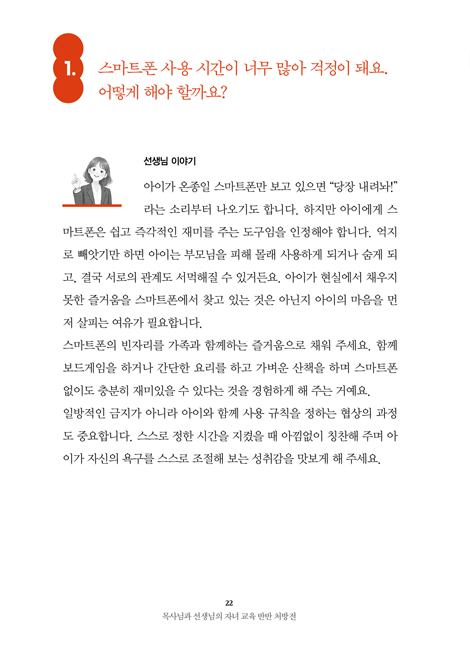 ÀÌ Ã¥ÀÇ °¡Àå Å« Ư¡ÀÌÀÚ ÀåÁ¡Àº ÇÑ °¡Áö Áú¹®¿¡ ´ëÇØ¼ ±³»ç¿Í ¸ñȸÀÚ°¡ °¢°¢ÀÇ ´äº¯À» ÁÖ´Â °ÍÀÔ´Ï´Ù. ¼±»ý´Ô ÀÔÀå¿¡¼ ¾ÆÀ̸¦ Àß ÀÌÇØÇÏ´Â ¹æ¹ýÀÇ ´äº¯°ú ¸ñ»ç´Ô ÀÔÀå¿¡¼ ½Å¾ÓÀ¸·Î Àß À̲ô´Â ¹æ¹ý¿¡ ´ëÇÑ ´äº¯À» µ¿½Ã¿¡ ÁÝ´Ï´Ù.