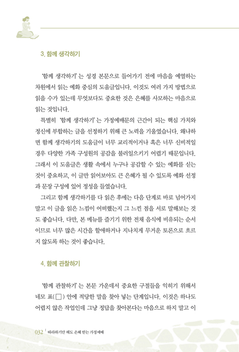 µÑ°, ÀÌ Ã¥ÀÇ °¡Á¤¿¹¹è¹®Àº ½±°í ÀÌÇØÇϱ⠽¬¿ï »Ó¸¸ ¾Æ´Ï¶ó ¾ÆÁÖ Èï¹Ì ÀÖ´Â Ç®ÅØ½ºÆ®·Î ±¸¼ºµÇ¾î ÀÖ¾î¼ ÀÚ³àµéµµ ÁÖü°¡ µÇ¾î °¡Á¤¿¹¹è¸¦ ÀεµÇÒ ¼ö ÀÖ´Ù. À̰ÍÀº ¿ì¸® ÀÚ³àµéÀÇ Àμº°ú »çȸ¼º ¹ß´Þ¿¡ Å« ÈÆ·ÃÀÌ µÈ´Ù.