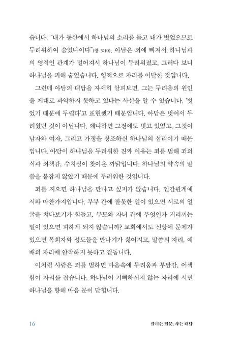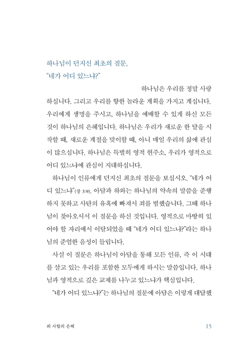 ±×·¯¸é Çϳª´ÔÀÌ ¿ì¸®¿¡°Ô ¸ÕÀú Áú¹®ÇϽô ÀÌÀ¯´Â ¹«¾ùÀΰ¡? ÀúÀÚ´Â Çϳª´ÔÀÌ Áú¹® ¼Ó¿¡¼ ¿ì¸® ½º½º·Î ¿µÀû »óŸ¦ Á¡°ËÇϰí Çϳª´Ô°ú ±³Á¦ÇÏ´Â ÀÚ¸®·Î µ¹¾Æ¿Àµµ·Ï À̲ô½Å´Ù°í ¸»ÇÑ´Ù. 1ºÎ¿¡¼´Â ¡®ÁË »çÇÔÀÇ ÀºÇý¡¯, ¡®³ªÀÇ ½Å¾Ó °í¹é¡¯, ¡®¹ÏÀ½ÀÇ È®½Å¡¯, ¡®½ÊÀÚ°¡ÀÇ ±æ¡¯ µîÀÇ ÁÖÁ¦¿¡ µû¶ó Çϳª´ÔÀÌ °¢ »ç¶÷¿¡°Ô ´øÁö½Å Áú¹®À» ´Ù·ç´Âµ¥, ±× ¼Ó¿¡¼ ¿ì¸®´Â ¡®Çϳª´ÔÀÇ »ç¶û¹Þ´Â Àڳ࡯¶ó´Â È®½ÅÀ» ¾ò°Ô µÈ´Ù. º»¹® Áß½ÉÀÇ ÇØ¼®, ´õ¾øÀÌ ºÐ¸íÇÏ°í ¸¶À½À» ±íÀÌ ÅÍÄ¡ÇÏ´Â ¸Þ½ÃÁö´Â Çϳª´ÔÀÇ Áú¹®À» ¿À´Ã ³ª¿¡°Ô ´øÁö´Â »ì¾Æ ÀÖ´Â ¸Þ½ÃÁö·Î ¹Þ°í ´ë´äÀ» ã°Ô ÇÑ´Ù.