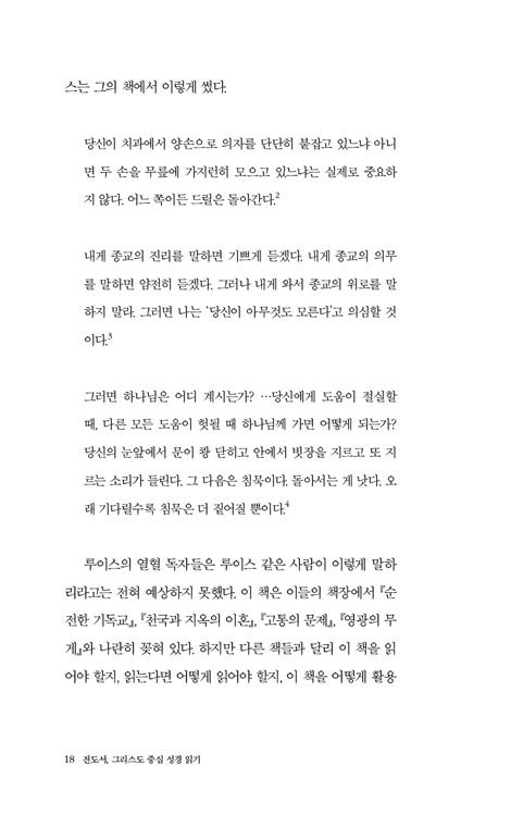 ¿ì¸®´Â Á¾Á¾ ²ûÂïÇÏ°Ô ¸Á°¡Áø Çö½Ç ¾Õ¿¡¼µµ "±âµµÇÏ¸é ´Ù ±¦Âú¾ÆÁø´Ù"´Â ½ÄÀÇ °ª½Ñ Á¾±³Àû À§·Î·Î ¿ì¸®ÀÇ ¾ÆÇÄÀ» Æ÷ÀåÇÏ·Á ÇÕ´Ï´Ù. ±×·¯³ª Àè ¿¡½º¿ÍÀÎÀÇ ¡ºÀüµµ¼, ±×¸®½ºµµ Á᫐ ¼º°æ Àб⡻´Â ÁøºÎÇÑ Á¾±³ ¾ð¾î·Î ¼²ºÎ¸¥ Á¤´äÀ» Á¦½ÃÇÏ´Â »ó¾ÆÅ¾ÀÇ »÷´Ô °°Àº Ã¥ÀÌ ¾Æ´Õ´Ï´Ù. ÀúÀÚ´Â ¸ñȸÀÚÀÌÀÚ ½ÃÀÎÀÇ ¾ð¾î·Î ¡®³¡¾øÀÌ °ÅÄ¥°í ³¸¼± °æÀ̰¡ ³ÑÄ¡´Â Àüµµ¼¶ó´Â ¼¼°è¡¯ ¼ÓÀ¸·Î µ¶ÀÚµéÀ» ¾È³»ÇÕ´Ï´Ù.