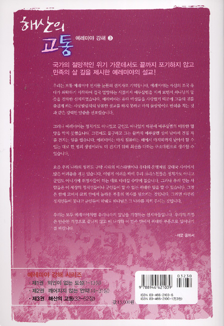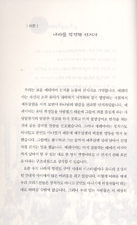 ¹ÎÁ·ÀÇ »ì ±æÀ» Á¦½ÃÇÑ ¿¹·¹¹Ì¾ßÀÇ ¼³±³! ¿ì¸®´Â º¸Åë ¿¹·¹¹Ì¾ß ¼±Áö¸¦ ´«¹°ÀÇ ¼±ÁöÀÚ·Î ±â¾ïÇÕ´Ï´Ù. ¿¹·¹¹Ì¾ß´Â ÀÚ½ÅÀÇ Á¶±¹ À¯´Ù°¡ ¼â¶ôÇϱ⠽ÃÀÛÇÏ¿© °á±¹ ¸ê¸ÁÇÏ´Â ½ÃÁ¡±îÁö ¿¹·ç »ì·½À» ÁöÄѺ¸¸é¼ Çϳª´ÔÀÇ ¸»¾¸À» ÀüÆÄÇÑ ¼±ÁöÀÚ¿´½À´Ï´Ù. ¿¹·¹¹Ì¾ß´Â À¯´Ù ¹é¼ºµéÀ» »ç¶ûÇ߱⠶§¹®¿¡ ±×µéÀÇ ±Í¸¦ Áñ°Ì°ÔÇÏ´Â »çÅÁ¹ß¸²½ÄÀÇ ´ÞÄÞÇÑ ¼³±³¸¦ ÇÏÁö ¸øÇÏ°í ¸¶Ä¡ ºÒ¹æ¸ÁÀÌ·Î ¹Ý¼®À» Ä¡´Â °Í°ú °°Àº °·ÂÇÑ ¸»¾¸À» ¼±Æ÷Çß½À´Ï´Ù. ±×·¯³ª ¿¹·¹¹Ì¾ß´Â Á¤Ä¡°¡µµ ¾Æ´Ï¾ú°í, ±ºÀεµ ¾Æ´Ï¾ú±â ¶§¹®¿¡ ¿¹·ç»ì·½ÀÇ ºñÂüÇÑ ¸ê¸ÁÀ» ¸·Áö ¸øÇß½À´Ï´Ù. ±×·³¿¡µµ ºÒ±¸ÇÏ°í ±×´Â ³¡±îÁö ¿¹·ç»ì·½¼º¿¡ ³²¾Æ¼ °ÇÁú ÀÚ¸¦ °ÇÁö´Â ÀÏÀ» Çß½À´Ï´Ù. ¿¹·¹¹Ì¾ß´Â ¸¶Ä¡ ħ¸ôÇÏ´Â ¹è¿¡¼ ¸¶Áö¸·±îÁö ³²¾Æ¼ ÇÒ ¼ö ÀÖ´Â ´ë·Î ÇÑ ¸íÀÇ »ý¸íÀÌ¶óµµ ´õ °ÇÁö±â À§ÇØ ÃÖ¼±À» ´ÙÇÏ´Â ±¸Á¶ ´ë¿øÀ¸·Î »ý°¢ÇÒ ¼ö ÀÖ°Ú½À´Ï´Ù. ¿äÁò ¿ì¸® ³ª¶óÀÇ ÇüÆíµµ ±¸¾à½Ã´ëÀÇ À̽º¶ó¿¤À̳ª À¯´ÙÀÇ ¿î¸íó·³ °´ë±¹ »çÀÌ¿¡¼ ¸¹Àº ¾î·Á¿òÀ» °Þ°í ÀÖ½À´Ï´Ù. ÀÌ·¸°Ô ¾î·Á¿î ¶§¿¡ ¿ì¸® Å©¸®½ºÃµµéÀº Á¤Ä¡°¡µµ ¾Æ´Ï°í ±ºÀεµ ¾Æ´Ï±â¿¡ À§Á¤ÀÚµéÀÌ ÇÏ´Â ´ë·Î µû¶ó°¥ ¼ö ¹Û¿¡ ¾ø½À´Ï´Ù. ±×·¯³ª ¿ì¸® ¹Ï´Â »ç¶÷µéÀº ÀÌ ¼¼»óÀÇ Á¤Ä¡ÀεéÀ̳ª ±ºÀεéÀÌ ÇÒ ¼ö ¾ø´Â À§´ëÇÑ ÀÏÀ» ÇÒ ¼ö ÀÖ½À´Ï´Ù. ±×°ÍÀº ÇÔ²² ¸ð¿©¼ ±³È¸ ¾È¿¡¼ ³î¶ó¿î ºÎÈïÀÇ ¿ª»ç¸¦ ÀÏÀ¸Å°´Â °ÍÀÔ´Ï´Ù. ±×·¯¸é ¾Æ¹«¸® Á¤Ä¡ÀεéÀÌ ¸ø³ª°í ±ºÀεéÀÌ ¾àÇØµµ Çϳª´ÔÀº ±× ³ª¶ó¸¦ ÁöÄÑ Áֽô °ÍÀÔ´Ï´Ù. ¿ì¸®´Â ¸ðµÎ ¿¹·¹¹Ì¾ßó·³ ¿ì¸®³ª¶óÀÇ ¾Õ³¯À» °ÆÁ¤ÇÏ´Â ¼±ÁöÀÚµéÀÔ´Ï´Ù. ¿ì¸®ÀÇ °ÆÁ¤Àº ´Ü¼øÇÑ °ÆÁ¤À¸·Î ³¡³ªÁö ¾Ê°í ÀÌ ³ª¶ó¿Í ÀÌ ¹ÎÁ· ¾È¿¡¼ À§´ëÇÑ ºÎÈïÀ¸·Î ÀϾ±â¸¦ ¹Ù¶ø´Ï´Ù - ¼¹®Áß¿¡¼ ***************************** ¿¹·¹¹Ì¾ß °ÇØ ½Ã¸®Áî Á¦1±Ç ÀÇÀÎÀÌ ¾ø´Â µµ¼º(1-13Àå) Á¦2±Ç ±ú¾îÁöÁö ¾Ê´Â ¾ð¾à(14-31Àå) Á¦3±Ç ÇØ»êÀÇ °íÅë(32-52Àå) ***************************** ÀúÀÚ ¹× ¿ªÀÚ ¼Ò°³