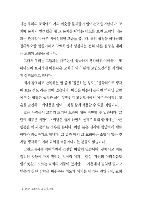 ÀÌ Ã¥¿¡¼ ÀúÀÚ´Â ÀÌ·¸°Ô ¸»ÇÑ´Ù. ¡°¡®±×¸®½ºµµÀÇ ¸¶À½À¸·Î¡¯ ¹ÏÀ½À» °í¹éÇϰí, ¡®±×¸®½ºµµÀÇ ¸¶À½À¸·Î »ç¶÷µéÀ» ´ëÇÏ°í »ê´Ù¡¯¸é ±³È¸¿Í ¼ºµµ´Â ½âÀº »ý¼± ³¿»õ°¡ ¾Æ´Ï¶ó ±×¸®½ºµµÀÇ ¸¶À½À¸·Î °¡µæÇÑ ÇâÀ¯ ³ª´Â ÁýÀÌ µÉ °ÍÀÔ´Ï´Ù. ±³È¸¿Í ¼ºµµ°¡ ´Ù½Ã »õ·Ó°Ô ÁöÇâÇØ¾ß ÇÒ °ÍÀº ¡®±×¸®½ºµµÀÇ ¸¶À½¡¯ÀÔ´Ï´Ù.¡±