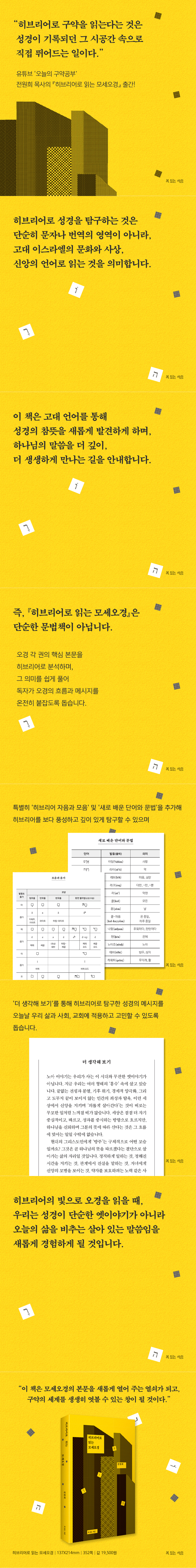 Àü¿øÈñ ¸ñ»çÀÇ ¡ºÈ÷ºê¸®¾î·Î Àд ¸ð¼¼¿À°æ¡»Àº â¼¼±âºÎÅÍ ½Å¸í±â±îÁö, À¯´ëÀΰú ±âµ¶±³ÀεéÀÌ ¼ÒÁßÇÏ°Ô ¿©±ä ±¸ÀýµéÀ» Â÷±ÙÂ÷±Ù Ç®¾î ¼³¸íÇϸ鼵µ, ´Ü¼øÇÑ ÇØ¼³¿¡ ±×Ä¡Áö ¾Ê°í, ±¸Àý ¼Ó¿¡ ´ã±ä È÷ºê¸®¾î ´Ü¾î¿Í Ç¥ÇöÀ» ¤¾î ÁÖ¾î ¸»¾¸ÀÇ Àǹ̸¦ ÇÑÃþ ±íÀÌ ÀÌÇØÇϵµ·Ï µ½½À´Ï´Ù. ¶ÇÇÑ ±³È¸¸¦ ÇâÇÑ µû¶æÇÑ Á¦¾ðÀ» ÅëÇØ ¸ñȸÀÚ¿Í ¼ºµµ ¸ðµÎ°¡ ¼º°æÀ» »õ·Ó°Ô ¹Ù¶óº¸´Â ±æÀ» ¿±´Ï´Ù. ´õºÒ¾î °¢ Àå ³¡¸Ó¸® ºÎºÐ¿¡¼ È÷ºê¸®¾î ´Ü¾î¿Í Áß¿äÇÑ ¹®¹ý ¼³¸íÀ» °£´ÜÇÏ°Ô µ¡ºÙ¿©, óÀ½ È÷ºê¸®¾î¸¦ ¹è¿ì´Â ºÐÀ̳ª ¹®¹ý °øºÎ¿¡ ¾î·Á¿òÀ» °Þ¾ú´ø ºÐµéµµ ºÎ´ã ¾øÀÌ ÀÌÇØÇÒ ¼ö ÀÖµµ·Ï ¹è·ÁÇÕ´Ï´Ù. ÀÌ Ã¥Àº ¼º°æÀ» ´õ ±íÀÌ ¾Ë°í ½Í¾îÇÏ´Â ¸ñȸÀÚ³ª, Æò½Åµµ ¸ðµÎ¿¡°Ô ÁÁÀº ±æÀâÀ̰¡ µÉ °ÍÀÔ´Ï´Ù.