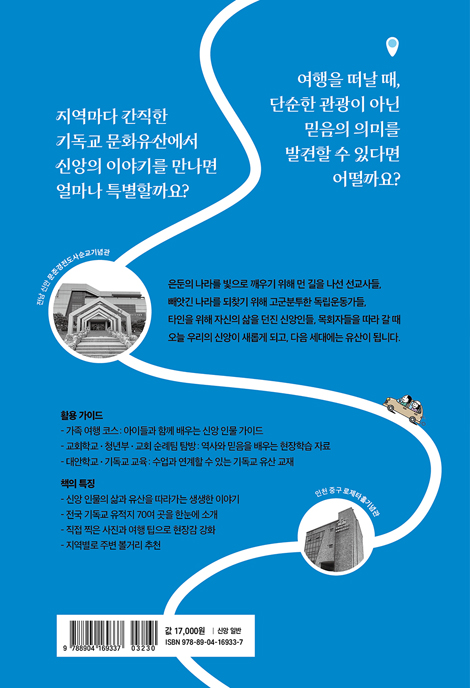 ÀÌ Ã¥Àº Çѱ¹ ±³È¸»çÀÇ ÁÖ¿ä Àι°µéÀ» µû¶ó°¡¸ç Àü±¹¿¡ ³²¾Æ ÀÖ´Â ±âµ¶±³ ¹®ÈÀ¯»ê 70¿© °÷À» ¼Ò°³ÇÕ´Ï´Ù. ¼±±³»ç, ¼ø±³ÀÚ, µ¶¸³¿îµ¿°¡, ±³À°ÀÚ, ¸ñȸÀÚ µî À¯¸íÇÑ ½Å¾Ó À§Àεé»Ó ¾Æ´Ï¶ó ¸¹ÀÌ ¾Ë·ÁÁöÁö ¾ÊÀº À§Àεé±îÁö, ±×µéÀÌ ³²±ä »îÀÇ ÈçÀûÀ» ÀúÀÚ°¡ Á÷Á¢ ´ä»çÇϰí, ÀÏ·¯½ºÆ®¸¦ ±×¸®¸ç, ±â·ÏÇß½À´Ï´Ù. ´Ü¼øÇÑ ¿©ÇàÁö ¾È³»¸¦ ³Ñ¾î, ÇöÀå¿¡¼ ±×µéÀÇ ½Å¾Ó°ú Çå½ÅÀ» »ý»ýÈ÷ üÇèÇÒ ¼ö ÀÖµµ·Ï µ½½À´Ï´Ù.