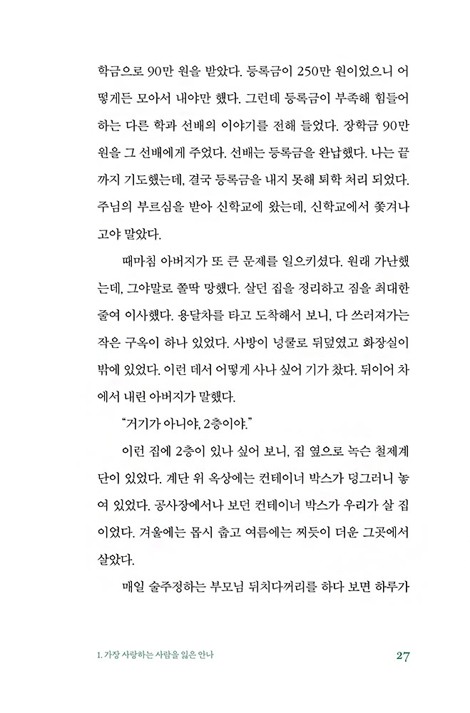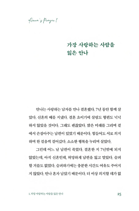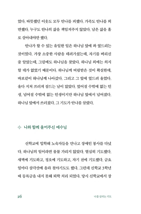 40³â µ¿¾È ±¤¾ß¸¦ °É¾î°¬´Ù. ±× ³¡¿¡¼ ¼º°æÀÇ ¾È³ª ¼±ÁöÀÚ¸¦ ¸¸³µ´Ù. ¾È³ª´Â À̸¥ ³ªÀÌ¿¡ °úºÎ°¡ µÇ°í, 60³âÀÌ ³Ñ´Â ¼¼¿ù ±¤¾ß¸¦ °É¾î°¬´Ù. ¾È³ª ¾Õ¿¡¼ ³»°¡ ´çÇÑ °í³Àº ¾Æ¹«°Íµµ ¾Æ´Ï¾ú´Ù. ¾È³ª´Â ¾î¶»°Ô ¹öÆ¿ ¼ö ÀÖ¾úÀ»±î? ¾È³ªÀÇ »îÀ» ¹¬»óÇÏ°í ¶Ç ¹¬»óÇß´Ù. ±×¶§ºÎÅÍ Çϳª´ÔÀÌ ³» ¸¶À½À» ¿©¼Ì´Ù. ¼º°æ¿¡ ´Ü ¼¼ ±¸Àý¹Û¿¡ ¾È µÇ´Â ¾È³ªÀÇ ¸ð½ÀÀÌ ³»°Ô dz¼ºÇÑ ÀºÇý·Î ´Ù°¡¿Ô´Ù. ¾È³ª¿Í ºñÇÒ ¼ö ¾øÁö¸¸, ºñ½ÁÇÑ »îÀÇ ±ËÀûµµ È®ÀÎÇß´Ù. ³»°Ô ¿ª»çÇϽŠÇϳª´ÔÀ» ¾È³ª À̾߱⿡¼µµ ãÀ» ¼ö ÀÖ¾ú´Ù. ¾îÁ¦³ª ¿À´ÃÀ̳ª µ¿ÀÏÇϽŠÇϳª´ÔÀ» ¸¸³µ´Ù. ¾È³ªÀÇ ±âµµ°¡ ¿À´Ã ¿ì¸®¿¡°Ôµµ Å« ¹è¿òÀÌÀÚ À¯ÀÍÀÓÀ» ¹ß°ßÇß´Ù. _¸Ó¸®¸» Áß¿¡¼