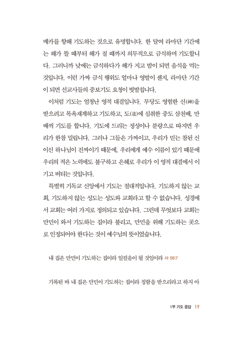 ±âµµÇÏ¸é ¼¼»óÀÌ ¹Ù²î°í, ±âµµÇϸé ÀüÀïÀÌ ±×Ä¡°í, ±âµµÇÏ¸é °ÆÚÇÑ ÀλýÀÌ È¸½ÉÇÏ°Ô µÇ°í, ±âµµÇÏ¸é ¼±±³ÁöÀÇ ¼±±³»ç´ÔÀÌ ÈûÀ» ¾ò°í, ±âµµÇÏ¸é ±âÀûÀ» °æÇèÇÑ´Ù°í ¹Ï½À´Ï´Ù. ±âµµÇÏ¸é ½Ãµé¾î°¡´Â ±³È¸°¡ ´Ù½Ã ¼Ò»ýÇÑ´Ù°í ¹Ï½À´Ï´Ù. ±âµµÇÏ¸é ±âÀûÀÌ »ó½ÄÀÌ µÉ ¼ö ÀÖ´Ù°í °¨È÷ ¹Ï½À´Ï´Ù. ±×·¡¼ Àú´Â ÁÖ´ÔÀ» ¹Ï´Â °ÍÀº °ð ±âµµ¸¦ ¹Ï´Â °ÍÀ̶ó°í »ý°¢ÇÕ´Ï´Ù. Çϳª´Ô²²¼ »ì¾Æ °è½Å ÂüµÈ ½ÅÀ̽ñ⿡, ¿ì¸®ÀÇ °£±¸¸¦ µéÀ¸½Å´Ù°í ¹Ï´Â °ÍÀÔ´Ï´Ù. p.10