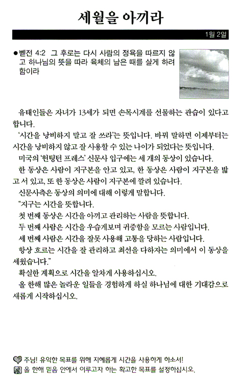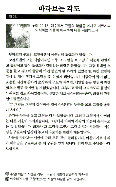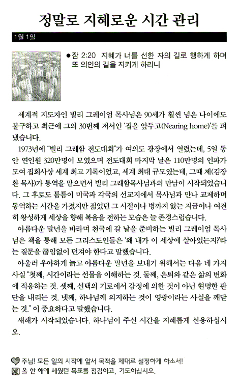 Çϳª´ÔÀÇ ÀºÇý°¡ ³ÑĨ´Ï´Ù ¿ì¸®´Â ¼ø°£¼ø°£ ¼ö¸¹Àº °ÍÀ» º¸¸ç »ì°í ÀÖ½À´Ï´Ù. ±×·¯³ª º¸°í ÀÖ´Â ±× ¼ö¸¹Àº °ÍµéÀº °á±¹ Çϳª´Ô ¾Æ´Ï¸é ¼¼»óÀÔ´Ï´Ù. ±×·±µ¥ ¼¼»óÀ» ¹Ù¶óº¸¸é ¿°·Á¿Í ÇѼû°ú Àý¸Á°ú °íÅëÀÔ´Ï´Ù. ±×·¯³ª Çϳª´ÔÀ» ¹Ù¶óº¸¸é Èñ¸Á°ú ÇØ°á°ú Æò¾È°ú ´É·ÂÀÔ´Ï´Ù. ¿ì¸®´Â Áö³ ¼¼¿ù°ú ºñ±³ÇÒ ¼ö ¾øÀ» Á¤µµ·Î ´õ ¸¹Àº °ÍÀ» ´©¸®°í, ´õ ¸¹Àº °ÍÀ» ¾òÁö¸¸, ¿µÈ¥ÀÇ »ý±â´Â Á¡Á¡ ÀҾ°í ÀÖ½À´Ï´Ù. ¼¼»óÀÇ À¯È¤ ¼Ó¿¡ Á¡Á¡ °Å¼¼Áö´Â ¸¶±ÍÀÇ °ø°ÝÀ¸·Î ±×¸®½ºµµÀÎµé ¿ª½Ã È¥¶õ ¼Ó¿¡ ºüÁú ¶§°¡ ¸¹½À´Ï´Ù. ÀÌ·± ½Ã´ëÀϼö·Ï ¿ì¸®´Â ´õ¿í ´õ °í°³¸¦ µé°í Çϳª´ÔÀ» ÇâÇØ ½Ã¼±À» °íÁ¤Çϰí Çϳª´ÔÀ» ¹Ù¶óºÁ¾ß ½Â¸® ÇÕ´Ï´Ù. ¡®Çϴÿ¡ °è½Ã´Â ÁÖ¿©, ³»°¡ ´«À» µé¾î ÁÖ²² ÇâÇϳªÀÌ´Ù ¡¦ ¿ì¸±ÀÇ ´«ÀÌ ¿©È£¿Í ¿ì¸® Çϳª´ÔÀ» ¹Ù¶óº¸¸ç, ¿ì¸®¿¡°Ô ÀºÇý º£Ç®¾î Áֽñ⸦ ±â´Ù¸®³ªÀÌ´Ù¡± (½ÃÆí 123Æí 1, 2Àý) Çϳª´ÔÀÇ ÀºÇý¸¦ °£±¸ÇÏ´Â ´ÙÀó·³ ¿ì¸®µµ Çϳª´ÔÀ» ¹Ù¶óº¸¸é µË´Ï´Ù. ÀÌ Ã¥ÀÌ ¸ÅÀÏ Çϳª´ÔÀ» ¹Ù¶óº¸¸ç »ç´Âµ¥ µµ¿òÀÌ µÇ±â¸¦ ±âµµÇÕ´Ï´Ù. - ¼¹® Áß¿¡¼ ¡°¸ÅÀÏ 5ºÐ¾¿¸¸ ¹¬»óÇϽʽÿÀ. ÁÖ´Ô²¾¼ ¼¼»óÀ» ÀÌ±æ °ÇÑ ¹ÏÀ½°ú ¼¼»ó¿¡¼ ¾òÁö ¸øÇÏ´Â Æò°À» ÁֽʴϴÙ.¡± ÀúÀÚ ¹× ¿ªÀÚ ¼Ò°³