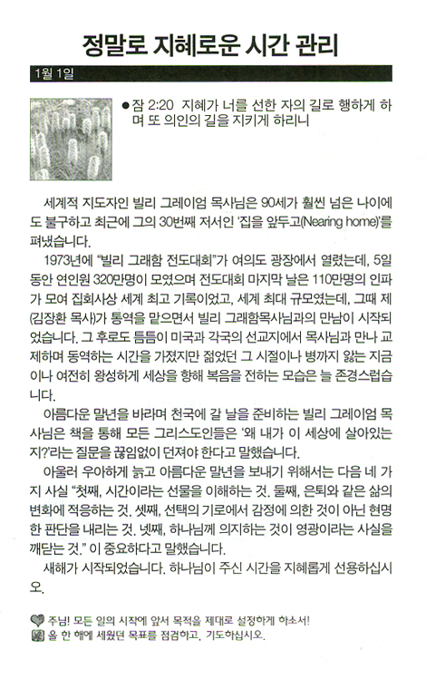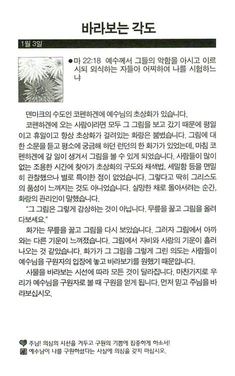 Çϳª´ÔÀ» ¹Ù¶óº¸¸é, Çϳª´ÔÀÇ ÀºÇý°¡ ³ÑĨ´Ï´Ù ¿ì¸®´Â ¼ø°£¼ø°£ ¼ö¸¹Àº °ÍÀ» º¸¸ç »ì°í ÀÖ½À´Ï´Ù. ±×·¯³ª º¸°í ÀÖ´Â ±× ¼ö¸¹Àº °ÍµéÀº °á±¹ Çϳª´Ô ¾Æ´Ï¸é ¼¼»óÀÔ´Ï´Ù. ±×·±µ¥ ¼¼»óÀ» ¹Ù¶óº¸¸é ¿°·Á¿Í ÇѼû°ú Àý¸Á°ú °íÅëÀÔ´Ï´Ù. ±×·¯³ª Çϳª´ÔÀ» ¹Ù¶óº¸¸é Èñ¸Á°ú ÇØ°á°ú Æò¾È°ú ´É·ÂÀÔ´Ï´Ù. ¿ì¸®´Â Áö³ ¼¼¿ù°ú ºñ±³ÇÒ ¼ö ¾øÀ» Á¤µµ·Î ´õ ¸¹Àº °ÍÀ» ´©¸®°í, ´õ ¸¹Àº °ÍÀ» ¾òÁö¸¸, ¿µÈ¥ÀÇ »ý±â´Â Á¡Á¡ ÀҾ°í ÀÖ½À´Ï´Ù. ¼¼»óÀÇ À¯È¤ ¼Ó¿¡ Á¡Á¡ °Å¼¼Áö´Â ¸¶±ÍÀÇ °ø°ÝÀ¸·Î ±×¸®½ºµµÀÎµé ¿ª½Ã È¥¶õ ¼Ó¿¡ ºüÁú ¶§°¡ ¸¹½À´Ï´Ù. ÀÌ·± ½Ã´ëÀϼö·Ï ¿ì¸®´Â ´õ¿í ´õ °í°³¸¦ µé°í Çϳª´ÔÀ» ÇâÇØ ½Ã¼±À» °íÁ¤Çϰí Çϳª´ÔÀ» ¹Ù¶óºÁ¾ß ½Â¸® ÇÕ´Ï´Ù. ¡®Çϴÿ¡ °è½Ã´Â ÁÖ¿©, ³»°¡ ´«À» µé¾î ÁÖ²² ÇâÇϳªÀÌ´Ù ¡¦ ¿ì¸±ÀÇ ´«ÀÌ ¿©È£¿Í ¿ì¸® Çϳª´ÔÀ» ¹Ù¶óº¸¸ç, ¿ì¸®¿¡°Ô ÀºÇý º£Ç®¾î Áֽñ⸦ ±â´Ù¸®³ªÀÌ´Ù¡± (½ÃÆí 123Æí 1, 2Àý) Çϳª´ÔÀÇ ÀºÇý¸¦ °£±¸ÇÏ´Â ´ÙÀó·³ ¿ì¸®µµ Çϳª´ÔÀ» ¹Ù¶óº¸¸é µË´Ï´Ù. ÀÌ Ã¥ÀÌ ¸ÅÀÏ Çϳª´ÔÀ» ¹Ù¶óº¸¸ç »ç´Âµ¥ µµ¿òÀÌ µÇ±â¸¦ ±âµµÇÕ´Ï´Ù. - ¼¹® Áß¿¡¼ ¡°¸ÅÀÏ 5ºÐ¾¿¸¸ ¹¬»óÇϽʽÿÀ. ÁÖ´Ô²¾¼ ¼¼»óÀ» ÀÌ±æ °ÇÑ ¹ÏÀ½°ú ¼¼»ó¿¡¼ ¾òÁö ¸øÇÏ´Â Æò°À» ÁֽʴϴÙ.¡± ÀúÀÚ ¹× ¿ªÀÚ ¼Ò°³