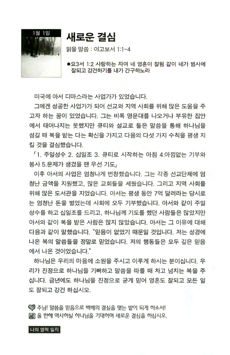 Á¸±ÍÇÑ »ç¶÷ÀÌ µÈ ¾ßº£½ºÃ³·³ ¿ì¸®µµ Çϳª´Ô²² ±âµµÇØ º¹¿¡ º¹À» ¹ÞÀ¾½Ã´Ù!¡± ¸ÅÀÏ 5ºÐ ¹¬»óÀ¸·Î »îÀ» ¹Ù²Ü ¼ö ÀÖ½À´Ï´Ù. ¡°³»°Ô º¹¿¡ º¹À» ´õÇÏ¿© ÁÖ¼Ò¼!¡± ¼º°æ ¿ª´ë»ó 4Àå 9Àý, 10Àý¿¡ º¸¸é ȯ³ Áß¿¡ ±âµµ·Î Çϳª´ÔÀÇ Å« º¹À» Àû±ØÀûÀ¸·Î ±¸ÇØ, º¹µµ ¹Þ°í Á¸±ÍÇÑ »ç¶÷À̶ó°í Æò°¡µµ ¹ÞÀº ¾ßº£½º¸¦ º¼ ¼ö ÀÖ½À´Ï´Ù. ±×´Â Çϳª´ÔÀÌ ÁÖ½Ç Å« º¹À» ±âµµ·Î ħ³ëÇÑ »ç¶÷ÀÔ´Ï´Ù. ¡°¾ßº£½º°¡ À̽º¶ó¿¤ Çϳª´Ô²² ¾Æ·Ú¾î °¡·ÎµÇ ¿øÄÁ´ë ÁÖ²²¼ ³»°Ô º¹¿¡ º¹À» ´õÇÏ»ç ³ªÀÇ Áö°æÀ» ³ÐÈ÷½Ã°í ÁÖÀÇ ¼ÕÀ¸·Î ³ª¸¦ µµ¿ì»ç ³ª·Î ȯ³À» ¹þ¾î³ª ±Ù½ÉÀÌ ¾ø°Ô ÇϿɼҼ ÇÏ¿´´õ´Ï Çϳª´ÔÀÌ ±× ±¸ÇÏ´Â °ÍÀ» Çã¶ôÇϼ̴õ¶ó.¡± (¿ª´ë»ó 4:10) ¿ì¸®µµ ¾ßº£½ºÃ³·³ Çϳª´Ô²² ±âµµÇØ º¹¿¡ º¹À» ¹ÞÀ¾½Ã´Ù. ³ªÀÇ Áö°æÀÌ ³ÐÇôÁö´Â º¹! ÁÖ´ÔÀÇ ¼ÕÀÌ ³ª¸¦ µµ¿ì½Ã´Â º¹! ȯ³ÀÌ ÇÇÇØ°¡´Â º¹! Æò¾ÈÀÌ ³ÑÄ¡´Â º¹! ÀÌ Ã¥ÀÌ... Çϳª´ÔÀÇ º¹¿¡ º¹À» ¹Þ´Âµ¥, ÁÖ´ÔÀÌ Áֽô dz¼ºÇÑ »îÀ» ´©¸®´Âµ¥, ±× ¹ÞÀº Å« º¹À» ÁÖ´ÔÀ» À§ÇØ ´Ù½Ã µ¹·Áµå¸®´Âµ¥... ¾²¿©Áö±æ ±âµµÇÕ´Ï´Ù. _¼¹® Áß¿¡¼ ¡°¸ÅÀÏ 5ºÐ¾¿¸¸ ¹¬»óÇϽʽÿÀ. ÁÖ´Ô²²¼ ¼¼»óÀ» ÀÌ±æ °ÇÑ ¹ÏÀ½°ú ¼¼»ó¿¡¼ ¾òÁö ¸øÇÏ´Â Æò°À» ÁֽʴϴÙ.¡± ÀúÀÚ ¹× ¿ªÀÚ ¼Ò°³