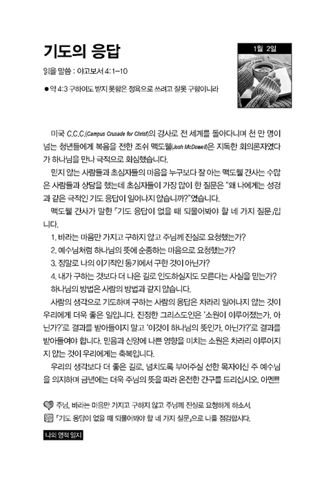 »õÇØÀÇ ±âµµ ÀÐÀ» ¸»¾¸ : ¿¹·¹¹Ì¾ß¾Ö°¡ 3:17-23 ¾Ö 3:22,23 ¿©È£¿ÍÀÇ ÀÚºñ¿Í ±àÈáÀÌ ¹«±ÃÇϽùǷΠ¿ì¸®°¡ Áø¸êµÇÁö ¾Æ´ÏÇÔÀÌ´ÏÀÌ´Ù À̰ÍÀÌ ¾ÆÄ§¸¶´Ù »õ·Î¿ì´Ï ÁÖÀÇ ¼º½ÇÀÌ Å©µµ¼ÒÀÌ´Ù ¡º»õÇØ¸¦ ½ÃÀÛÇÏ¸é¼ ´õ¿í °æ°ÇÇÑ ¸¶À½À¸·Î ÁÖ´Ô²² ±âµµÇÕ´Ï´Ù. ¡°³ªÀÇ ÁÖ ³ªÀÇ ±¸¼¼ÁÖ¿©, ÁÖ´ÔÀÇ ¾î¶² ÀÏÀ̵çÁö ³ª¸¦ ½áÁֽÿɼҼ. ¸ðµç ÀÏ¿¡ ¾î¶² ¹æ¹ýÀ¸·Îµç Àú¸¦ ¿ä±¸ÇÏ¿© ÁֿɼҼ. ÀúÀÇ °¡³ÇÑ ½É·ÉÀ» µå¸®¿É´Ï´Ù. ºó ±×¸©ÀÎ Àú¸¦ ÁÖ´ÔÀÇ ¿µ±¤À¸·Î ä¿ö Áֽðí Á˽º·´°í ¹ø¹ÎÇÏ´Â ½É·ÉÀ» ¾þÀ¸»ç ÁÖ´ÔÀÇ »ç¶ûÀ¸·Î »õ·Ó°Ô ÇϿɼҼ. ÁÖ´ÔÀÌ °è½Å °÷¿¡ Á¦ ¸¶À½ÀÌ Àֱ⸦ ¿øÇÕ´Ï´Ù. ÁÖ´ÔÀÇ ¿µ±¤À» ³Î¸® ¾Ë¸®´Â ÀÏ¿¡ Á¦ ÀÔ¼úÀ» »ç¿ëÇØ ÁÖ¼Ò¼. ÀúÀÇ ¸ðµç ¸¶À½°ú ÈûÀ» ÁÖ´Ô²² ÀÇÁöÇÏ¸ç µå¸®±æ ¿øÇϿɴϴÙ. Èçµé¸² ¾ø´Â ½Å¾ÓÀ» ÁÖ½Ã°í º¹À½À» ÀüÇÏ´Â À̵éÀÌ ÁÖ´ÔÀ» ÀǽÉÇÏÁö ¾Ê°í ¿µÁ¢ÇÏ´Â ³î¶ó¿î ÀÏÀÌ ÀϾ°Ô ÇÏ¿©ÁÖ¼Ò¼. ¾Æ¸à.¡± Á¦°¡ ÀÚÁÖ °¡¼ ¼³±³Çß´ø ¹Ì±¹ Moody Bible InstituteÀÇ ¸àÅäÀÎ ´ë ÀüµµÀÚ ¹«µð(Dwight Lyman Moody)ÀÇ ¡¸¸ÅÀÏ ¾ÆÄ§ ±âµµ¹®¡¹ÀÔ´Ï´Ù. ·çÅÍ´Â ¡°³ª´Â ÇØ¾ß ÇÒ ÀÏÀÌ ¸¹±â ¶§¹®¿¡ ÇÑ ½Ã°£ ´õ ÀÏÂï ÀϾ ±âµµÇÑ´Ù¡±¶ó°í ¸»Çß½À´Ï´Ù. ±Ý³â¿¡µµ Çϳª´Ô²² Å©°Ô ¾²ÀÓ ¹Þ±â¸¦ ¿øÇÏ¸ç ±âµµÇÒ ½Ã°£À» ´õ¿í ³»¾ß°Ú½À´Ï´Ù.¡» - ¡¸±èÀåȯ ¸ñ»çÀÇ Àλý ¸Þ¸ð¡¹ Áß¿¡¼ ±âµµ °¡¿îµ¥ ÀÏÇϽðí, ±âµµ °¡¿îµ¥ ½É·ÉÀ» ȸº¹½ÃÄÑÁֽô Çϳª´ÔÀ» °æÇèÇϸç dz¼ºÇÑ ¿¸Å¸¦ µå¸®´Â ÇÑ ÇØ°¡ µÇ½Ê½Ã¿À. ¾Æ¸à!!! ÁÖ´Ô, ±Ý³â¿¡´Â ´õ¿í ÁÖ´ÔÀÇ ¾î¶² ÀÏÀ̵ç Àú¸¦ »ç¿ëÇØ ÁÖ¼Ò¼. ±Ý³â¿¡´Â ´õ¿í ÁÖ´Ô²² ¿µ±¤ µ¹¸®±â À§ÇØ ³ë·ÂÇϰí ÀÖ´ÂÁö »ìÆìº¾½Ã´Ù. 1¿ù 2ÀÏ ±âµµÀÇ ÀÀ´ä ÀÐÀ» ¸»¾¸ : ¾ß°íº¸¼ 4:1-10 ¾à 4:3 ±¸ÇÏ¿©µµ ¹ÞÁö ¸øÇÔÀº Á¤¿åÀ¸·Î ¾²·Á°í À߸ø ±¸ÇÔÀ̴϶ó ¹Ì±¹ C.C.C.(Campus Crusade for Christ)ÀÇ °»ç·Î Àü ¼¼°è¸¦ µ¹¾Æ´Ù´Ï¸ç õ ¸¸ ¸íÀÌ ³Ñ´Â û³âµé¿¡°Ô º¹À½À» ÀüÇÑ Á¶½¬ ¸ÆµµÀ£(Josh McDowell)Àº Áöµ¶ÇÑ È¸ÀÇ·ÐÀÚ¿´´Ù°¡ Çϳª´ÔÀ» ¸¸³ª ±ØÀûÀ¸·Î ȸ½ÉÇß½À´Ï´Ù. ¹ÏÁö ¾Ê´Â »ç¶÷µé°ú ÃʽÉÀÚµéÀÇ ¸¶À½À» ´©±¸º¸´Ù Àß ¾Æ´Â ¸ÆµµÀ£ °£»ç´Â ¼ö¸¹Àº »ç¶÷µé°ú »ó´ãÀ» Çߴµ¥ ÃʽÉÀÚµéÀÌ °¡Àå ¸¹ÀÌ ÇÑ Áú¹®Àº ¡°¿Ö ³ª¿¡°Ô´Â ¼º°æ°ú °°Àº ±ØÀûÀÎ ±âµµ ÀÀ´äÀÌ ÀϾÁö ¾Ê½À´Ï±î?¡±¿´½À´Ï´Ù. ¸ÆµµÀ£ °£»ç°¡ ¸»ÇÑ ¡¸±âµµ ÀÀ´äÀÌ ¾øÀ» ¶§ µÇ¹°¾îºÁ¾ß ÇÒ ³× °¡Áö Áú¹®¡¹ÀÔ´Ï´Ù. 1. ¹Ù¶ó´Â ¸¶À½¸¸ °¡Áö°í ±¸ÇÏÁö ¾Ê°í ÁÖ´Ô²² Áø½Ç·Î ¿äûÇߴ°¡? 2. ¿¹¼ö´Ôó·³ Çϳª´ÔÀÇ ¶æ¿¡ ¼øÁ¾ÇÏ´Â ¸¶À½À¸·Î ¿äûÇߴ°¡? 3. Á¤¸»·Î ³ªÀÇ À̱âÀûÀÎ µ¿±â¿¡¼ ±¸ÇÑ °ÍÀÌ ¾Æ´Ñ°¡? 4. ³»°¡ ±¸ÇÏ´Â °Íº¸´Ù ´õ ³ªÀº ±æ·Î ÀεµÇϽÇÁöµµ ¸ð¸¥´Ù´Â »ç½ÇÀ» ¹Ï´Â°¡? Çϳª´ÔÀÇ ¹æ¹ýÀº »ç¶÷ÀÇ ¹æ¹ý°ú °°Áö ¾Ê½À´Ï´Ù. »ç¶÷ÀÇ »ý°¢À¸·Î ±âµµÇÏ¸ç ±¸ÇÏ´Â »ç¶÷ÀÇ ÀÀ´äÀº Â÷¶ó¸® ÀϾÁö ¾Ê´Â °ÍÀÌ ¿ì¸®¿¡°Ô ´õ¿í ÁÁÀº ÀÏÀÔ´Ï´Ù. ÁøÁ¤ÇÑ ±×¸®½ºµµÀÎÀº ¡®¼Ò¿øÀÌ ÀÌ·ç¾îÁ³´Â°¡, ¾Æ´Ñ°¡?¡¯·Î °á°ú¸¦ ¹Þ¾ÆµéÀÌÁö ¸»°í ¡®À̰ÍÀÌ Çϳª´ÔÀÇ ¶æÀΰ¡, ¾Æ´Ñ°¡?¡¯·Î °á°ú¸¦ ¹Þ¾Æµé¿©¾ß ÇÕ´Ï´Ù. ¹ÏÀ½°ú ½Å¾Ó¿¡ ³ª»Û ¿µÇâÀ» ¹ÌÄ¡´Â ¼Ò¿øÀº Â÷¶ó¸® ÀÌ·ç¾îÁöÁö ¾Ê´Â °ÍÀÌ ¿ì¸®¿¡°Ô´Â ÃູÀÔ´Ï´Ù. ¿ì¸®ÀÇ »ý°¢º¸´Ù ´õ ÁÁÀº ±æ·Î, ³ÑÄ¡µµ·Ï ºÎ¾îÁÖ½Ç ¼±ÇÑ ¸ñÀÚÀ̽ŠÁÖ ¿¹¼ö´ÔÀ» ÀÇÁöÇÏ¸ç ±Ý³â¿¡´Â ´õ¿í ÁÖ´ÔÀÇ ¶æÀ» µû¶ó ¿ÂÀüÇÑ °£±¸¸¦ µå¸®½Ê½Ã¿À. ¾Æ¸à!!! ÁÖ´Ô, ¹Ù¶ó´Â ¸¶À½¸¸ °¡Áö°í ±¸ÇÏÁö ¾Ê°í ÁÖ´Ô²² Áø½Ç·Î ¿äûÇÏ°Ô ÇϼҼ. ¡¸±âµµ ÀÀ´äÀÌ ¾øÀ» ¶§ µÇ¹°¾îºÁ¾ß ÇÒ ³× °¡Áö Áú¹®¡¹À¸·Î ³ª¸¦ Á¡°ËÇսôÙ. °ü·Ã À̹ÌÁö