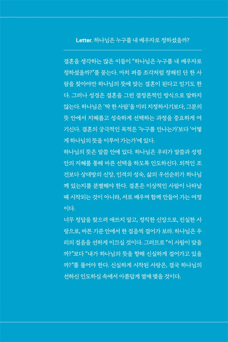 ¸¹Àº ½ÅÈ¥ ºÎºÎµéÀ» ±³È¸ ¾È¿¡¼­ ¸¸³ª°í ±×µéÀ» ¾çÀ°Çϸ鼭 Àý½ÇÈ÷ ±ú´Ý´Â °ÍÀÌ ÀÖ½À´Ï´Ù. ½ÅÈ¥ °¡Á¤µéÀ» ¼¼¿ì±â À§ÇØ À¯¿ëÇÑ ¸¹Àº Áö½Äµé°ú ¼¼»óÀûÀΠó¹æÀüµéÀÌ ÇÊ¿äÇÏÁö¸¸, ±Ã±ØÀûÀ¸·Î ÇÊ¿äÇÑ °ÍÀº Çϳª´Ô ¸»¾¸À̶ó´Â »ç½ÇÀÔ´Ï´Ù. Çϳª´Ô ¸»¾¸À» ±íÀÌ ¹¬»óÇÏ¸ç ±¸Ã¼ÀûÀÎ Àû¿ëÀ» µ½´Â ¹Ý°¡¿î Ã¥À» ¸¸³µ½À´Ï´Ù. ÇູÇÑ °¡Á¤À» ²Þ²Ù´Â ¸ðµç û³âµé¿¡°Ô ÀÌ Ã¥À» ¾È°Ü ÁÖ°í ½ÍÀº ¸¶À½ÀÌ °£ÀýÇÕ´Ï´Ù.
