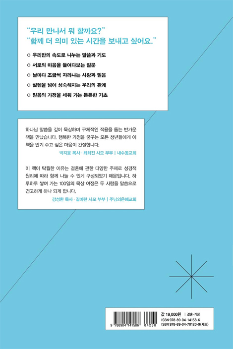 ÀþÀºÀ̵éÀº µÎ±Ù°Å¸®´Â ¸¶À½À¸·Î °áÈ¥ÀÇ ÇູÀ» ²Þ²ß´Ï´Ù. ±×·¯³ª °áÈ¥À» ÇâÇÑ Çϳª´ÔÀÇ ¸¶À½À» ±íÀÌ »ý°¢ÇÏ´Â Ä¿ÇÃÀº ¸¹Áö ¾Ê½À´Ï´Ù. ¿©±â º¸¼® °°Àº Ä¿Çà 100ÀÏ ¹¬»óÁýÀ» °­·Â! ÃßõÇÕ´Ï´Ù. ÀÌ Ã¥ÀÌ Å¹¿ùÇÑ ÀÌÀ¯´Â °áÈ¥¿¡ °üÇÑ ´Ù¾çÇÑ ÁÖÁ¦·Î ¼º°æÀû ¿ø¸®¿¡ µû¶ó ÇÔ²² ³ª´­ ¼ö ÀÖ°Ô ±¸¼ºµÇ¾ú±â ¶§¹®ÀÔ´Ï´Ù. ÇÏ·çÇÏ·ç ½×¿© °¡´Â 100ÀÏÀÇ ¹¬»ó ¿©Á¤Àº µÎ »ç¶÷À» ¸»¾¸À¸·Î °ß°íÇÏ°Ô Çϳª µÇ°Ô ÇÕ´Ï´Ù. ¶ÇÇÑ ¾Æ¸§´Ù¿î °ü°è¸¦ ²Þ²Ù´Â Ä¿ÇÃÀÇ Áø¼ÖÇÑ ´ëÈ­¿Í ±âµµÀÇ ±³Á¦´Â Çϳª´ÔÀÌ ±â»µÇϽô °áÈ¥À» ÁغñÇÏ°Ô ÇÒ °ÍÀÔ´Ï´Ù.