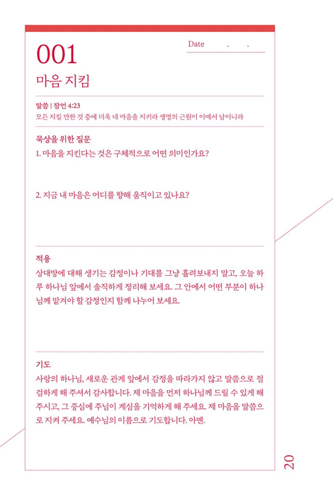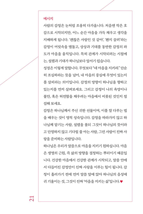ºÎ´ã½º·´Áö ¾ÊÀº ÇÏ·ç ºÐ·®À¸·Î ¸¶À½Àº °¡º±°Ô, °ü°è´Â ´õ ±í¾îÁö°Ô µË´Ï´Ù. ¸ÕÀú ¸»¾¸À» ÀÐ°í ¹¬»ó Áú¹®¿¡ ´äÇÑ ÈÄ, Àû¿ë°ú ±âµµ·Î ÀÌ¾î °¡¸ç, ´ÙÀ½ ÆäÀÌÁöÀÇ ¸Þ½ÃÁö·Î ¸¶¹«¸®ÇØ º¸¼¼¿ä. ±×·¸°Ô ÇÏ·çÇÏ·ç ¿ì¸®ÀÇ »ç¶ûÀÌ ¹ÏÀ½ ¾È¿¡¼ ¼º¼÷ÇØÁý´Ï´Ù.
