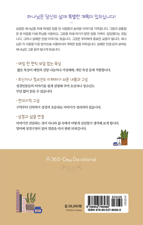 ¼º°æÀÇ Áø¸®¸¦ µüµüÇÑ ±³¸® ¼³¸íÀÌ ¾Æ´Ñ À̾߱â Çü½ÄÀ¸·Î Ç®¾î³» ½±°Ô ¹¬»óÇÒ ¼ö ÀÖ´Â 365ÀÏ ¹¬»óÁýÀÌ´Ù. ¼º°æÀÇ ÇÙ½É Áø¸®¿Í ±×¸®½ºµµÀÎÀÇ »îÀÇ °¡Ä¡¸¦ Èï¹Ì·Ó°í ÀÌÇØÇϱ⠽±°Ô ÀüÇÏ´Â °ÍÀÌ ÀÌ Ã¥ÀÇ Æ¯Â¡ÀÌ´Ù. ÀÏ¹Ý ¼ºµµ´Â ¹°·Ð ÃʽÅÀÚ, û¼Ò³âÀÌ º¸±â¿¡µµ ÁÁ´Ù. ¹ÏÀ½Àº ¾î·ÆÁö ¾ÊÀ¸¸ç, ¿ì¸®ÀÇ ÀÏ»ó ¼Ó¿¡¼ »ì¾Æ ¿òÁ÷Àδٴ ¸Þ½ÃÁö¸¦ ÀüÇϸç, µ¶ÀÚ°¡ Çϳª´ÔÀ» ÀΰÝÀûÀ¸·Î ¾Ë¾Æ°¡µµ·Ï µ½´Â´Ù.