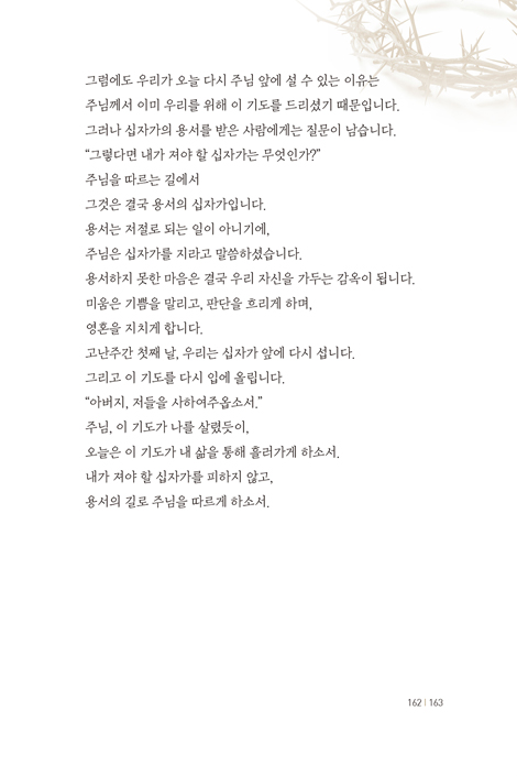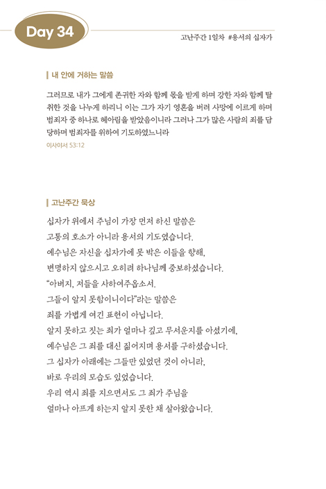 ¿ì¸®¸¦ À§ÇÏ¿© ÀúÁÖ¹ÞÀ¸½Å ÁÖ´ÔÀ» ¹¬»óÇß½À´Ï´Ù. ±×·Î ÀÎÇØ ¿ì¸®°¡ °áÄÚ Çϳª´Ô²² ¹ö¸²¹ÞÁö ¾ÊÀ» °Í°ú ´Ù¸¥ À̵éÀÇ À§·ÎÀÚ¿Í ¹öÆÀ¸ñÀ¸·Î ºÎ¸§¹Þ¾Ò´Ù´Â »ç½Ç¿¡ °¨»çÇß½À´Ï´Ù. ¹«¾ùº¸´Ùµµ °¨»çÇÑ °ÍÀº À̰ÍÀÌ ´Ü¼øÇÑ Áö½ÄÀÌ ¾Æ´Ï¶ó Á¦ °í¹éÀÌ µÇ¾ú´Ù´Â »ç½ÇÀÔ´Ï´Ù. p.51 ħ¹¬ ¼Ó¿¡ ±¤¾ß¸¦ °ÉÀ¸¸ç ¡®¿¹¼ö´Ô¸¸ ÇÔ²²ÇÏ½Ã¸é ±¤¾ß¶óµµ »ó°ü¾ø½À´Ï´Ù¡¯¶ó°í °í¹éÇÒ ¼ö ÀÖ´ÂÁö ÀÚ½ÅÀÇ ¹ÏÀ½À» Á¡°ËÇØº¸¾Ò½À´Ï´Ù. ±¤¾ß ¿¹¹è¸¦ µå¸®°í ³ª¿À¸é¼ ¾î¶² óÁö¿Í ÇüÆí¿¡¼µµ ÁÖ´Ô¸¸ ¹Ï°í »ê´Ù´Â °ÍÀÌ ¹«¾ùÀÎÁö ´«ÀÌ ¿¸®´Â °Í °°¾Ò½À´Ï´Ù. Á×¾î¶ó ¿¹¼ö´Ô¸¸ µû¶ó »ç´Â °ÍÀÔ´Ï´Ù. ±¤¾ß¿¡¼ µå¸®´Â ÁÖÀÏ¿¹¹è´Â ³Ê¹«³ª ¿µ°¨ÀÌ ÀÖ¾ú½À´Ï´Ù. p.157 ½ÊÀÚ°¡´Â ³ª¸¦ ÁÖ´Ô²²·Î¸¸ ÀεµÇÏ´Â °ÍÀÌ ¾Æ´Ï¶ó, ¼·Î¸¦ º¸´Â ´«µµ ¿¾îÁֽʴϴÙ. ÁÖ´Ô, ½ÊÀÚ°¡¿¡¼ ÁֽŠÀÌ ¸»¾¸À» ¿Ü¸éÇÏÁö ¾Ê°Ô ÇϼҼ. ³»°¡ »ç¶ûÀÇ ½ÊÀÚ°¡¸¦ ÇÇÇÏÁö ¾Ê°Ô ÇϽðí, ±³È¸ ¾ÈÀÇ Áö±ØÈ÷ ÀÛÀº ÀÚ¸¦ ¿¹¼ö´ÔÀ» ´ëÇÏµí º¸°Ô ÇϼҼ. ³»°Ô ¸Ã±â½Å »ç¶÷µéÀ» ºÎ´ãÀÌ ¾Æ´Ï¶ó ÀºÇý·Î ¹Þ¾Æµé¿©, ÁÖ´ÔÀÇ °¡Á·À» »ç¶ûÀ¸·Î ¼¼¿ì°Ô ÇϼҼ p.171 ¼ººÎ Çϳª´Ô°ú ¿µ¿øÈ÷ Çϳª¿´´ø ¿¹¼ö´ÔÀÌ, ÁËÀÎÀ» ´ë½ÅÇÏ¿© ¹ö¸²¹ÞÀº °Íó·³ ´À³¢´Â ÀÚ¸®±îÁö ³»·Á°¡¼Ì½À´Ï´Ù. ¿ì¸®°¡ Áö¿ÁÀ¸·Î ¶³¾îÁö¸ç ¿ÜÃÄ¾ß ÇÒ ºñ¸íÀ», ¿¹¼ö´ÔÀÌ ½ÊÀÚ°¡¿¡¼ ´ë½Å ¿ÜÄ¡½Å °ÍÀÔ´Ï´Ù. ±×·¡¼ ¿¹¼ö´Ô ¾È¿¡ ÀÖ´Â ¿ì¸®´Â ¾î¶² ÇüÆí¿¡¼µµ ³¡³» ¹ö¸²¹ÞÁö ¾Ê´Â´Ù´Â È®½ÅÀ» ¾ò°Ô µÇ¾ú½À´Ï´Ù. p.174-175 ¿À´ÃÀº ¼ºÅä¿äÀÏ, ½Â¸®´Â ¼±Æ÷µÇ¾úÀ¸³ª ¾ÆÁ÷ ºÎȰÀÇ ¾ÆÄ§Àº ¿ÀÁö ¾ÊÀº ³¯ÀÔ´Ï´Ù. ¸»À» ÁÙÀ̰í, ÇØ¼®À» ¸ØÃß°í, ½ÊÀÚ°¡ÀÇ »ç¶ûÀÌ ¸¶À½ ±íÀº °÷¿¡ °¡¶ó¾Éµµ·Ï ÀáÀáÈ÷ ¸Ó¹«´Â ½Ã°£ÀÔ´Ï´Ù. ºÎȰÀÇ ¾ÆÄ§Àº ½ÊÀÚ°¡¸¦ Åë°úÇÑ Àڵ鿡°Ô Çã¶ôÇϽŠÇϳª´ÔÀÌ Áֽô ÀÀ´äÀÔ´Ï´Ù. p.187 °ü·Ã À̹ÌÁö