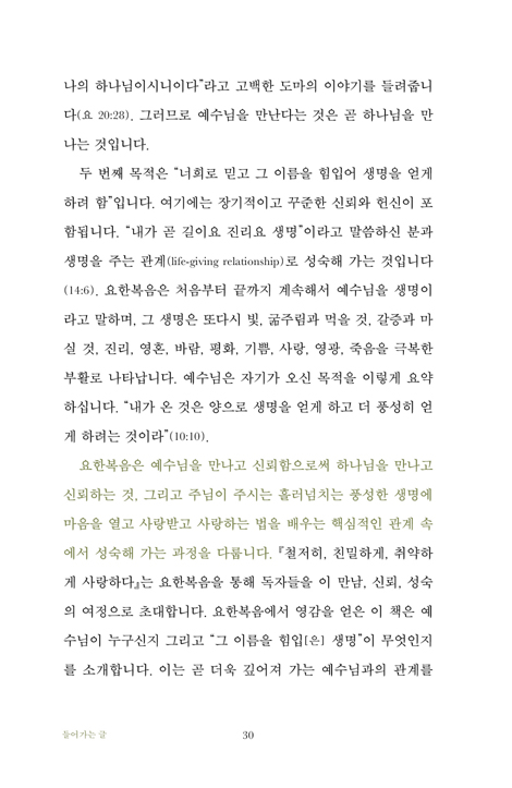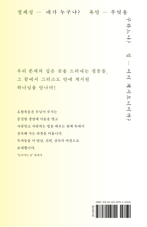 ÀÌ Ã¥¿¡´Â ÀúÀÚÀÇ ¿äÇѺ¹À½ ¿¬±¸, ±âµµ, ¹¬»ó, ÇÔ²² Àб⠰æÇèÀÇ Á¤¼ö°¡ ¸í·áÇÏ°íµµ ±íÀÌ ÀÖ°Ô ´ã°Ü ÀÖ¾î¼ ¿ì¸®¸¦ Çϳª´Ô°úÀÇ ¸¸³²À¸·Î ÀεµÇÑ´Ù. ¿äÇѺ¹À½ ¸ðµç ÀåÀÇ Á߽ɿ¡´Â ¿¹¼ö´ÔÀÌ °è½Å´Ù. ±×ºÐ ¾È¿¡ ³ªÅ¸³ Àڱ⸦ ³»¾î Áֽô »ç¶ûÀ» ÅëÇØ¼ ¿ì¸®°¡ Çϳª´ÔÀ» ¾Ë°Ô µÇ±â ¶§¹®ÀÌ´Ù. ¿¹¼ö´ÔÀ» ¾Ë¾Æ °¥ ¶§ ¿ì¸®´Â ÀÚ±â ÀÚ½Å, ³»¸é¿¡ ´ëÇÑ Å½»ö, ³ªÀÇ ¿å¸Á, ¡®Áý¡¯¿¡ ´ëÇÑ °¥¸ÁÀ» ¶ÇÇÑ ¹ß°ßÇØ °£´Ù. ÀÌ ¸ðµÎ´Â ¿ì¸®¿Í ÇÔ²² °è½Ã°í ¿ì¸®¸¦ À§ÇϽô Çϳª´ÔÀÇ Ç³¼ºÇÑ ÇöÁ¸ °¡¿îµ¥ µå·¯³ª¸ç ±× ¾È¿¡¼ ÀÀ´äµÈ´Ù.
