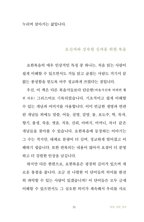 ÀÌ Ã¥Àº ¿¹¼ö´Ô°úÀÇ ¸¸³²¿¡ ÃÊÁ¡À» ¸ÂÃá ÃÖ»óÀÇ ¼º°æ °øºÎ ¼ö¾÷°ú ±íÀÌ ÀÖ´Â ¹¬»ó, dzºÎÇÑ ¼Ò±×·ì °æÇèÀ» Á¦°øÇÑ´Ù. ¿äÇѺ¹À½¿¡ ³ªÅ¸³ ¿ì¸®¸¦ ÇâÇÑ Çϳª´ÔÀÇ Æ¯º°ÇÑ »ç¶û¿¡ ´ëÇÑ ÀúÀÚÀÇ °¨ÅºÀº ±¸Ã¼ÀûÀÌ°í ¾Æ¸§´Ù¿ì¸ç Àü¿°¼ºÀÌ °ÇÏ´Ù. ºñ¹üÇÑ ¿µ°¨À» ÁÖ´Â ¾È³»ÀÚ°¡ À̲ô´Â, Çϳª´ÔÀÇ ¸¶À½ ±íÀº °÷À¸·Î µé¾î°¡´Â ³î¶ó¿î ¿©Á¤ÀÌ´Ù.