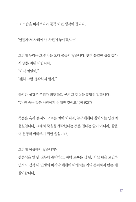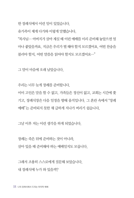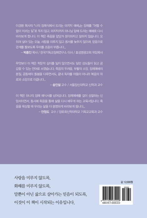 À̰æÈ¯ ¸ñ»çÀÇ ¡º³ªÀÇ Àå·Ê½Ä¿¡¼ µå¸®´Â ¸¶Áö¸· ¿¹¹è¡»´Â Àå·Ê¸¦ ¡°¾î¿ ¼ö ¾øÀÌ Ä¡¸£´Â ÀÏ¡±·Î µÎÁö ¾Ê°í, ¸¶Áö¸·±îÁö Çϳª´Ô ¾Õ¿¡ µå¸®´Â ¿¹¹è·Î ´Ù½Ã ¹Ù¶óº¸°Ô ÇÕ´Ï´Ù. ÀÌ Ã¥Àº Á×À½À» ¾Õ´ç°Ü »ý°¢ÇÏÀÚ°í ¸»ÇÏÁö ¾Ê½À´Ï´Ù. ¿ÀÈ÷·Á »ì¾Æ ÀÖ´Â ¿À´Ã, »ç¶ûÀ» ¹Ì·çÁö ¾Ê°í ¿ë¼¸¦ ´ÊÃßÁö ¾ÊÀ¸¸ç, ¹ÏÀ½À¸·Î °ü°è¸¦ µ¹º¸µµ·Ï ¿ì¸®¸¦ Á¶¿ëÈ÷ ºÎ¸¨´Ï´Ù.