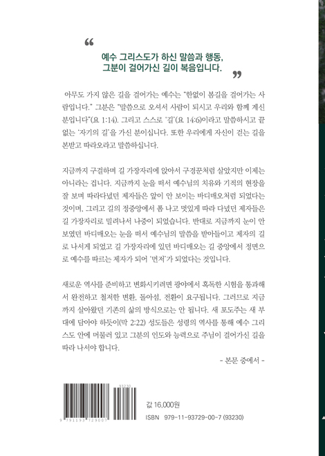 ÀÌÁ¦ ¿¹¼ö´ÔÀº ±æÀÌ ¾ø¾î ³«½ÉÇÏ´Â »ç¶÷µé, °¡´Â ±æÀÌ Çè³ÇÏ´Ù°í ÁÖÀú¾É´Â »ç¶÷µé, Æ÷±âÇÏ°í ½Í¾î ÇÏ´Â »ç¶÷µé¿¡°Ô ³»°¡ °ð ±æÀÌ´Ï ¡®³ª¸¦ µû¶ó¿À¶ó¡¯°í ¸»¾¸ÇϽŴÙ. ¸¸ÀÏ ¿ì¸®°¡ ¡®³ª¸¦ µû¶ó¿À¶ó¡¯´Â ¿¹¼ö´ÔÀÇ ¸»¾¸¿¡ ¼øÁ¾ÇÏ°í ¿¹¼ö´ÔÀÇ ¼ÕÀ» Àâ°í ¿¹¼ö´ÔÀ» µû¶ó°¡¸é ±×¶§ºÎÅÍ´Â ³»°¡ »ç´Â Àλý±æÀÌ ¾Æ´Ñ, ¿¹¼ö´ÔÀÌ ³ª¸¦ »ç´Â ¿¹¼öÀÇ ±æÀ» °È°Ô µÉ °ÍÀÌ´Ù. ÀúÀÚ´Â ¡º±æ À§¿¡¼ ¸¸³ ¿¹¼ö¡»¶ó´Â ÀÌ Ã¥À» ÅëÇØ ÀÌ »ç½ÇÀ» ²÷ÀÓ¾øÀÌ ¸»Çϰí Àд µ¶ÀÚµéÀ» ¼³µæÇÑ´Ù. »ý¸íÀÇ ±æ, »ì ¼ö ÀÖ´Â ±æÀÌ ÀÖÀ¸´Ï Æ÷±âÇÏÁö ¸»¶ó°í ¸»ÀÌ´Ù.