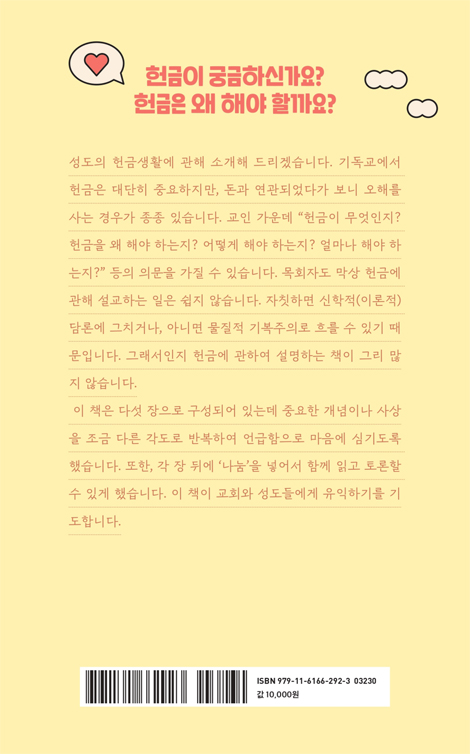±³È¸¿Í ½Å¾ÓÀ» ÀÌÇØÇÏ´Â »õ ½ÅÀÚ GUIDE 9¹øÂ° Ã¥ÀÔ´Ï´Ù. ¼ºµµÀÇ Çå±Ý»ýȰ¿¡ °üÇØ ªÁö¸¸ ±íÀº ÀÌÇØ¸¦ ´ã°í ÀÖ½À´Ï´Ù. ±³È¸¿Í »ç¿ªÀڵ鿡°Ô´Â ¸¹Àº µµ¿òÀ», »õ°¡Á·µé¿¡°Ô´Â Å« À¯ÀÍÀ» ÁÙ °ÍÀÔ´Ï´Ù. ¡°Çå±ÝÀÌ ¹«¾ùÀÎÁö? Çå±ÝÀ» ¿Ö ÇØ¾ß ÇÏ´ÂÁö? ¾î¶»°Ô ÇØ¾ß ÇÏ´ÂÁö? ¾ó¸¶³ª ÇØ¾ß ÇÏ´ÂÁö?¡± µî ½Å¾Ó»ýȰÀ» óÀ½ ½ÃÀÛÇϰųª ½Å¾Ó»ýȰÀ» ¾î´À Á¤µµ Çß´õ¶óµµ Çå±Ý¿¡ °üÇÑ Àǹ®À» °¡Áú ¼ö ÀÖ½À´Ï´Ù. ¶ÇÇÑ Çå±Ý¿¡ ´ëÇÑ ºÎ´ãÀ¸·Î ±³È¸¿¡ ³ª¿À±â°¡ Èûµé´Ù´Â À̾߱⸦ °£È¤ µè±âµµ ÇÕ´Ï´Ù. ÀÌ´Â ¸Å¿ì ¾ÈŸ±î¿î ÀÏÀÔ´Ï´Ù. Çå±ÝÀ» ¹Ù·Î ¹è¿ü´õ¶ó¸é ÀÌ·± ÀÏÀÌ »ý±âÁö ¾ÊÀ» °ÍÀÔ´Ï´Ù. ±×·¡¼ Çå±ÝÀÇ Àǹ̸¦ ¹Ù¸£°Ô ¾Æ´Â °ÍÀº ´ë´ÜÈ÷ Áß¿äÇÕ´Ï´Ù. ÇÏÁö¸¸ Çå±Ý¿¡ °üÇÑ À̾߱â´Â ÀÚÄ©ÇÏ¸é ½ÅÇÐÀû(ÀÌ·ÐÀû) ´ã·Ð¿¡ ±×Ä¡°Å³ª, ¾Æ´Ï¸é ¹°ÁúÀû ±âº¹ÁÖÀÇ·Î È带 ¼ö Àֱ⠶§¹®¿¡ ½±°Ô ²¨³»±â ¾î·Æ½À´Ï´Ù. ±×·¡¼ÀÎÁö Çå±Ý¿¡ °üÇÏ¿© ¼³¸íÇÏ´Â µµ¼°¡ ±×¸® ¸¹Áö ¾Ê½À´Ï´Ù. ÀÌ Ã¥Àº ¼º°æÀÌ Çå±Ý¿¡ °üÇÏ¿© ¹«¾ùÀ» ¸»ÇÏ´ÂÁö, ±×¸®°í ±³È¸¹ý°ú ±³È¸ ÀüÅëÀÌ Çå±ÝÀ» ¾î¶»°Ô ´Ù·ç°í ÀÖ´ÂÁö¸¦ »ó¼¼È÷ ¼Ò°³ÇÕ´Ï´Ù. ƯÈ÷ Çѱ¹±³È¸ »óȲÀ» ÃæºÐÈ÷ °í·ÁÇÏ¿´°í, Áß¿äÇÑ °³³äÀ̳ª »ç»óÀ» Á¶±Ý ´Ù¸¥ °¢µµ·Î ¹Ýº¹ÇÏ¿© ¾ð±ÞÇÔÀ¸·Î ¸¶À½¿¡ ½É±âµµ·Ï Çß½À´Ï´Ù. ¶ÇÇÑ, °¢ Àå µÚ¿¡ ¡®³ª´®¡¯À» ³Ö¾î¼ ÇÔ²² Àаí Åä·ÐÇÒ ¼ö ÀÖ°Ô Çß½À´Ï´Ù. ÀÌ Ã¥ÀÌ ±³È¸¿Í ¼ºµµµé¿¡°Ô À¯ÀÍÇϱ⸦ ¼Ò¸ÁÇϸç Çѱ¹±³È¸ ¸ðµç ¸ñȸÀÚ¿Í ¼ºµµµé²² ±ÇÇÕ´Ï´Ù.