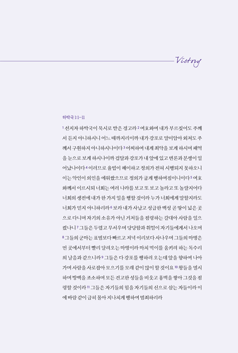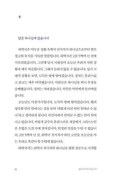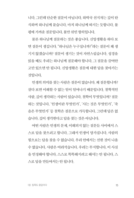 ¼¼»ó »ç¶÷µéÀº Àý¸ÁÀ» ºÎÁ¤ÀûÀ¸·Î »ý°¢ÇÕ´Ï´Ù. ±×·¯³ª ¹ÏÀ½ÀÇ ¼¼°è, ½Å¾ÓÀÇ ±æ¿¡¼´Â Àý¸ÁÀÌ ³ª»Û °ÍÀÌ ¾Æ´Õ´Ï´Ù. Àý¸ÁÀ» °æÇèÇØ¾ß ÇÕ´Ï´Ù. Àý¸ÁÀ» ÅëÇØ Çϳª´Ô²² ³ª¾Æ°¡´Â ¹ýÀ» ¹è¿ó´Ï´Ù. Àý¸Á ÀÌÈİ¡ Áß¿äÇÕ´Ï´Ù. ¼¼»ó¿¡¼´Â Àý¸ÁÀÌ Àý¸ÁÀ¸·Î ³¡³³´Ï´Ù. ±×·¯³ª ½ÅÀÚ´Â ´Ù¸¨´Ï´Ù. ¿ì¸®ÀÇ ³¡Àº ¿ì¸® ¼Õ¿¡ ÀÖÁö ¾Ê±â ¶§¹®ÀÔ´Ï´Ù. ¸ðµç °ÍÀº Çϳª´ÔÀÇ ¼Õ¿¡ ÀÖ½À´Ï´Ù. Çϳª´ÔÀÌ Ä§¹¬ÇÏ½Ã¸é ¿ì¸®´Â ¾Æ¹«°Íµµ ÇÒ ¼ö ¾ø½À´Ï´Ù. ±×·¯³ª Çϳª´ÔÀÇ Ä§¹¬ÀÌ Çϳª´ÔÀÇ ºÎÀç(Üôî¤)´Â ¾Æ´Õ´Ï´Ù. ħ¹¬µµ Çϳª´ÔÀÇ ÀÓÀç ¹æ½ÄÀÔ´Ï´Ù. Çϳª´ÔÀº »ý°¢Áö ¸øÇÑ ¹æ½ÄÀ¸·Î ÀÀ´äÇÏ½Ç ¶§°¡ ÀÖ½À´Ï´Ù. Áö±ÝÀÇ »óȲº¸´Ù ´õ ÁÁÁö ¾ÊÀº »óȲÀ¸·Î ¸ô¾Æ°¡½Ã±âµµ ÇÕ´Ï´Ù. Çϳª´ÔÀÇ °èȹÀÌ ¹«¾ùÀÎÁö ¾Ë ¼ö ¾ø½À´Ï´Ù. ¿ì¸®´Â ³¡À̶ó°í »ý°¢ÇÏÁö¸¸ Çϳª´ÔÀÇ °èȹÀº °è¼Ó ÁøÇàµË´Ï´Ù. ±×·¯¹Ç·Î ³» ¶æ´ë·Î¸¸ µÇ¾î¾ß ÇÑ´Ù°í »ý°¢Çؼ´Â ¾È µË´Ï´Ù. ¿ì¸®´Â ÀλýÀÇ ÁÖÀÎÀÌ µÉ ¼ö ¾ø½À´Ï´Ù. ÁÖÀÎÀÌ µÇ¾î¼µµ ¾È µË´Ï´Ù. ³» ÀλýÀÇ ÁÖÀÎÀÌ ³»°¡ ¾Æ´Ï¿ä Çϳª´ÔÀ̽ÉÀ» °í¹éÇØ¾ß ÇÕ´Ï´Ù. 81-82ÂÊ Áß¿¡¼ Çϳª´ÔÀº Àü¼³À̳ª µ¿È ¼Ó Àι°ÀÌ ¾Æ´Õ´Ï´Ù. ¼Ò¹® ¼Ó¿¡¸¸ Á¸ÀçÇÏ´Â Àι°µµ ¾Æ´Õ´Ï´Ù. Çϳª´ÔÀº °ú°Å¿¡ ¹ÚÁ¦µÇ¾î ÀÖÁö ¾Ê½À´Ï´Ù. Áö±Ýµµ ¿©ÀüÈ÷ ¿ª»çÇϽʴϴÙ. Çϳª´ÔÀº ¾ðÁ¦³ª ÇöÀçÇüÀ̽ʴϴÙ. ¿µ¿ø ÀüºÎÅÍ ¿µ¿ø±îÁö Çϳª´ÔÀº Çϳª´ÔÀ̽ʴϴÙ. Çϳª´ÔÀº ½Ã°øÀ» ÃÊ¿ùÇÏ¿© ¿ª»çÇϽʴϴÙ. ±×·¯¹Ç·Î Çϳª´ÔÀº ÃÊ¿ùÀÚÀ̽ʴϴÙ. ½Å¾ÓÀº Çâ¼ö¿¡ Á¥¾î Ãß¾ïÇÏ°í ±â³äÇÏ´Â °ÍÀÌ ¾Æ´Õ´Ï´Ù. ÀÌÀüÀ¸·Î µ¹¾Æ°¡·Á°í ÇØ¼´Â ¾È µË´Ï´Ù. ÀÌÀüÀÇ ÀÏÀÌ ¾Æ´Ï¶ó ÇöÀçÀÇ ÀÏÀ» °£ÁõÇØ¾ß ÇÕ´Ï´Ù. Áö±Ý ³ª¿¡°Ô ¿ª»çÇϽôÂ, »ì¾Æ °è½Å Çϳª´ÔÀ» À̾߱âÇØ¾ß ÇÕ´Ï´Ù. ¸ÅÀÏÀÇ »î ¼Ó¿¡¼ Çϳª´ÔÀ» °æÇèÇØ¾ß ÇÕ´Ï´Ù. 129-131ÂÊ Áß¿¡¼ ¸ðµç º¹Àº Çϳª´Ô°úÀÇ °ü°è¸¦ ÅëÇØ ÁÖ¾îÁý´Ï´Ù. ¹ÏÀ½À¸·Î Çϳª´Ô°ú ÈÆòÇÑ °ü°è¸¦ ÀÌ·ê ¼ö ÀÖ½À´Ï´Ù. ±×·¯¹Ç·Î ¹ÏÀ½ÀÌ º¹ÀÔ´Ï´Ù. ¹ÏÀ½Àº Çϳª´ÔÀÇ ÀºÇýÀÔ´Ï´Ù. Çϳª´ÔÀÇ ¼±¹°ÀÔ´Ï´Ù. ½Å¾Ó»ýȰÀº ±×¸®½ºµµ ¾È¿¡¼ ÁÖ¾îÁø °ÍÀ» ´©¸®´Â °ÍÀÔ´Ï´Ù. ±×·¯¹Ç·Î Àû±ØÀûÀ¸·Î ½Å¾Ó»ýȰ ÇØ¾ß ÇÕ´Ï´Ù. Áö±Ý Çϳª´ÔÀÇ ³ª¶ó¸¦ ´©·Á¾ß ÇÕ´Ï´Ù. ĪÀÇ(öàëù) ±³¸®¸¦ ÀÌÇØÇÏ´Â °ÍÀ¸·Î ¸¸Á·Çؼ´Â ¾È µË´Ï´Ù. Çϳª´Ô°ú ȸº¹µÈ °ü°è¸¦ ´©·Á¾ß ÇÕ´Ï´Ù. Çϳª´Ô°ú ÈÆòÀ» ´©·Á¾ß ÇÕ´Ï´Ù. Çϳª´ÔÀÌ ³» ÆíÀ̽ʴϴÙ. ¾ó¸¶³ª ³î¶ó¿î ÀÏÀԴϱî? ±×·¯¹Ç·Î Èûµé°í ¾î·Á¿î ¶§ ¿ì¸®´Â Çϳª´Ô²² ÇÇÇØ¾ß ÇÕ´Ï´Ù. Çϳª´Ô²² ÇÇÇÏ´Â °ÍÀÌ ¹ÏÀ½ÀÔ´Ï´Ù. Çϳª´Ô²² ÇÇÇÒ ¶§ ¿ì¸®ÀÇ ¸¶À½Àº Æò¾ÈÇØÁý´Ï´Ù. 192-193ÂÊ Áß¿¡¼ ¿¹¼ö´ÔÀº ±¤¾ß¿¡ °¡½Ç ÀÌÀ¯°¡ ¾øÀ¸¼Ì½À´Ï´Ù. ±×·±µ¥ ¿¹¼ö´ÔÀº ¼º·É¿¡°Ô À̲ø¸®¾î ±¤¾ß·Î °¡¼Ì½À´Ï´Ù. ¼º·ÉÀÌ ¿¹¼ö´ÔÀ» ±¤¾ß·Î ¸ô¾Æ³»¼Ì½À´Ï´Ù(¸· 1:12). ¿¹¼ö´ÔÀº ¿ì¸® ´ë½Å ±¤¾ß¿¡¼ ¸¶±ÍÀÇ ½ÃÇèÀ» ¹ÞÀ¸¼Ì°í À̱â¼Ì½À´Ï´Ù. À̽º¶ó¿¤ ¹é¼ºµéÀº ±¤¾ß¿¡¼ ½ÇÆÐÇßÁö¸¸ ¿¹¼ö´ÔÀº ½Â¸®Çϼ̽À´Ï´Ù. ±×¸®°í Çϳª´ÔÀÇ ³ª¶ó¸¦ ¼¼¿ì¼Ì½À´Ï´Ù. ¿©±â¼ ¿ì¸®´Â µÎ °¡Áö¸¦ »ý°¢ÇØ º¸¾Æ¾ß ÇÕ´Ï´Ù. ¡®À̽º¶ó¿¤ ¹é¼ºµéÀÌ ±¤¾ß¿¡¼ ¿Ö ½ÇÆÐÇߴ°¡?¡¯, ±×¸®°í ¡®¿¹¼ö´ÔÀº ±¤¾ß¿¡¼ ¾î¶»°Ô ½Â¸®Çϼ̴°¡?¡¯ÀÔ´Ï´Ù. ±¤¾ß´Â ½ÃÇèÀÇ Àå¼ÒÀÔ´Ï´Ù. ¿ì¸®´Â ÀÌ ¼¼»ó¿¡ »ç´Â µ¿¾È ½ÃÇèÀ» °è¼Ó °æÇèÇÕ´Ï´Ù. ÀÏÆò»ý ¸¶±Í¿Í ½Î¿ö¾ß ÇÕ´Ï´Ù. ±¤¾ß¿Í °°Àº ¼¼»ó¿¡¼ »ç´Â µ¿¾È ½ÃÇèÀÌ ¾ø±â¸¦ ¹Ù¶ó¸é ¾È µË´Ï´Ù. ½ÃÇèÀ» °æÇèÇÏ´Â °ÍÀ» ´ç¿¬ÇÏ°Ô »ý°¢ÇØ¾ß ÇÕ´Ï´Ù. ½ÃÇèÀº ¾î·Æ½À´Ï´Ù. ¸¸¸¸ÇÏ°Ô »ý°¢ÇÒ ¼ö ¾ø½À´Ï´Ù. ½ÃÇèÀ» ÀÌ±ä »ç¶÷Àº ´ë¼ö·ÓÁö ¾Ê°Ô »ý°¢ÇÒ ¼ö ÀÖ½À´Ï´Ù. ±×·¯³ª ½ÃÇèÀ» À̱âÁö ¸øÇÑ »ç¶÷Àº ±×¸¸Å ´ë°¡¸¦ Ä¡¸¨´Ï´Ù. ½ÃÇèÀ» À̱âÁö ¸øÇϸé Çϳª´ÔÀÇ Àڳడ ´©¸®´Â ¿µÀû Ư±ÇÀ» ´©¸®Áö ¸øÇÕ´Ï´Ù. ±×·¯¹Ç·Î Çϳª´ÔÀÇ ÀÚ³à´Â ½ÃÇèÀ» ¹Ýµå½Ã ÀÌ°Ü¾ß ÇÕ´Ï´Ù. 262-263ÂÊ Áß¿¡¼ ¼¼»óÀº ¿µÀû ÀüÀïÅÍÀÔ´Ï´Ù. Çϳª´ÔÀÇ ³ª¶ó¿Í »çźÀÇ ³ª¶ó °£ÀÇ ÀüÀïÀÌ ¹ú¾îÁö°í ÀÖ½À´Ï´Ù. °¥¼ö·Ï ½Î¿òÀº Ä¡¿ÇØÁý´Ï´Ù. À̶§ ¿ì¸®´Â ¿ì¸®°¡ ¾îµð¿¡ ¼ÓÇߴ°¡¸¦ ±â¾ïÇØ¾ß ÇÕ´Ï´Ù. ¿ì¸®´Â Çϳª´Ô ³ª¶ó¿¡ ¼ÓÇÑ Çϳª´ÔÀÇ »ç¶÷ÀÔ´Ï´Ù. ¿ì¸®´Â ¿µ¿øÀ» À§ÇØ »ð´Ï´Ù. ¿ì¸®´Â Çϳª´Ô ¾È¿¡¼ ¾È½ÄÇÒ ¼ö ÀÖ½À´Ï´Ù. ¿ì¸®´Â ¿ÀÁ÷ Çϳª´ÔÀ¸·Î ¸¸Á·ÇÒ ¼ö ÀÖ½À´Ï´Ù. ¿¹¹è´Â Çϳª´Ô ¾È¿¡¼ ½¬´Â °