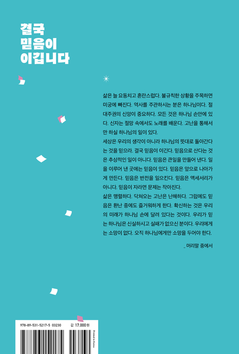 ¿ª»ç¸¦ ÁÖ°üÇϽô Çϳª´ÔÀÌ, ¸ðµç °ÍÀÌ Çϳª´Ô ¼Õ¾È¿¡ ÀÖ´Ù´Â ¹ÏÀ½ÀÌ °á±¹ ¹ÏÀ½ÀÇ ¼±ÇÑ ½Î¿ò¿¡¼ ½Â¸®ÇÏ°Ô ÇÏ´Â ´É·ÂÀÌ µÈ´Ù ¿À´Ã³¯ ¸¹Àº ±×¸®½ºµµÀÎÀÌ ÆÐ¹èÀǽĿ¡ Á¥¾î ¿µÀû Ȱ·ÂÀ» ÀÒ°í ÀÖ´Ù. ½Å¾ÓÀÇ ¿¬Á¶´Â ½×ÀÌÁö¸¸ ¿µÀû ¹«±â·Â°ú ħü ¼Ó¿¡¼ ÇÑ °ÉÀ½µµ ¾ÕÀ¸·Î ³ª¾Æ°¡Áö ¸øÇÑ Ã¤ ½ÇÆÐ¸¦ ´ç¿¬ÇÏ°Ô ¿©±ä´Ù. ±×·¯³ª ±×¸®½ºµµÀÎÀÇ ±æÀº ±¤¾ß °°¾Æµµ ½ÇÆÐ°¡ ¾Æ´Ï¶ó ½Â¸®·Î ä¿öÁ®¾ß ÇÑ´Ù. ÀÌ¹Ì ¿¹¼ö ±×¸®½ºµµ²²¼ ½Â¸®Çϼ̰í, ±× ½Â¸®°¡ ¿ì¸®¿¡°Ôµµ º¸ÁõµÇ¾ú±â ¶§¹®ÀÌ´Ù. ÀÌ Ã¥Àº ½Â¸®ÀÇ »îÀÌ ¡®¿µÀû ±âº»±â¡¯¿¡¼ ½ÃÀÛµÊÀ» °Á¶ÇÑ´Ù. ¸»¾¸Àº È¥¶õ½º·¯¿î Çö½ÇÀ» À̰ܳ»´Â °¡Àå È®½ÇÇÑ ±æÀ̸ç, ¼º·ÉÀº ¸»¾¸À» ÅëÇØ ½ÅÀÚ¸¦ ½Â¸®·Î À̲ô½Å´Ù. Àΰ£ÀÇ ¿½É°ú ´É·Â¸¸À¸·Î´Â ±¤¾ß °°Àº ÀλýÀ» °Ç³Î ¼ö ¾ø´Ù. ÀÚ½ÅÀÇ ¹«´ÉÀ» ÀÎÁ¤ÇÏ°í ¼º·ÉÀÇ µµ¿ì½ÉÀ» ±¸ÇÒ ¶§ ½Å¾ÓÀº ±í¾îÁö°í »îÀº dz¼ºÇØÁø´Ù. Àͼ÷ÇÑ Á¾±³ »ýȰ¿¡ ¸Ó¹°Áö ¸»°í, ¸»¾¸°ú ¼º·ÉÀÇ Àεµ ¼Ó¿¡¼ ³¯¸¶´Ù »õ·Î¿öÁö´Â ½Â¸®ÀÇ ¿©Á¤À¸·Î ³ª¾Æ°¡¾ß ÇÑ´Ù. ÀÌ Ã¥Àº ±× ½Â¸®ÀÇ ±æÀ» ȸº¹, ¼º¼÷, ½Â¸®¶ó´Â ¼¼ ´Ü°è·Î ¼³¸íÇÑ´Ù. ±×¸®°í ÀÌ ¸ðµç ³»¿ëÀ» °üÅëÇÏ¿© ½Ã¼±À» Çϳª´Ô¿¡°Ô·Î ÁýÁßÇÏ°Ô ÇÑ´Ù. ¿ª»ç¸¦ ÁÖ°üÇϽô Çϳª´ÔÀÇ ¼Õ¿¡ ¸ðµç °ÍÀÌ ÀÖ´Ù´Â ¹ÏÀ½À¸·Î, Àý¸Á ¼Ó¿¡¼µµ Âù¼ÛÀ» ÀÒÁö ¾Ê°í °í³À» ÅëÇØ ÀÌ·ç½Ç Çϳª´ÔÀÇ ¿ª»ç¸¦ ±â´ëÇÏ°Ô ÇÑ´Ù. ¡°¼¼»óÀº ¿ì¸®ÀÇ »ý°¢ÀÌ ¾Æ´Ï¶ó Çϳª´ÔÀÇ ¶æ´ë·Î µ¹¾Æ°£´Ù´Â °ÍÀ» ¹ÏÀ¸¶ó. °á±¹ ¹ÏÀ½ÀÌ À̱ä´Ù. ¹ÏÀ½À¸·Î »ê´Ù´Â °ÍÀº Ãß»óÀûÀÎ ÀÏÀÌ ¾Æ´Ï´Ù. ¹ÏÀ½Àº Å«ÀÏÀ» ¸¸µé¾î ³½´Ù. ÀÏÀ» ÀÌ·ç¾î ³½ °÷¿¡´Â ¹ÏÀ½ÀÌ ÀÖ´Ù. ¹ÏÀ½Àº ¾ÕÀ¸·Î ³ª¾Æ°¡°Ô ¸¸µç´Ù. ¹ÏÀ½Àº ¹ÝÀüÀ» ÀÏÀ¸Å²´Ù. ¹ÏÀ½Àº ¾×¼¼¼¸®°¡ ¾Æ´Ï´Ù. ¹ÏÀ½ÀÌ ÀÚ¶ó¸é ¹®Á¦´Â ÀÛ¾ÆÁø´Ù.¡± _ ¸Ó¸®¸» Áß¿¡¼ ÀúÀÚ ¹× ¿ªÀÚ ¼Ò°³
