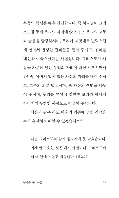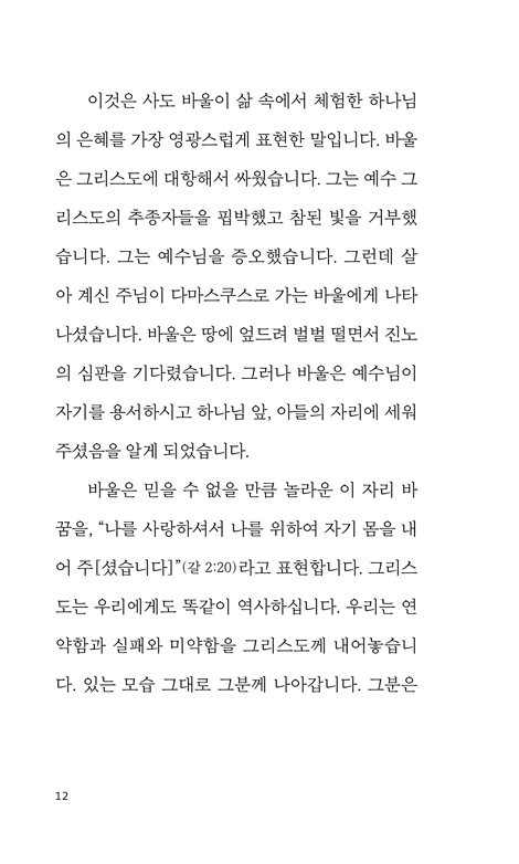 °ú°Å¸¦ ±×¸®½ºµµ²² ¸Ã±â°Å³ª ¹Ì·¡ÀÇ ¿µ»ýÀ» ±×ºÐ²² ÀÇŹÇÏ´Â °ÍÀº ±×¸® ¾î·ÆÁö ¾Ê½À´Ï´Ù. ±×·¯³ª ¿ì¸®°¡ Áö±Ý °Þ°í ÀÖ´Â ¾î·Á¿ò°ú ¹®Á¬°Å¸®µéÀ» ¸Ã±â´Â ÀÏÀº ÂüÀ¸·Î ¾î·Æ½À´Ï´Ù. ±×·±µ¥ ±×ºÐÀÌ ¿ì¸®¿Í ÀÚ¸®¸¦ ¹Ù²Ù¾î Áֽô ÀÏÀº ÇöÀç ÀϾ´Â ÀÏÀÔ´Ï´Ù. p. 25, ³»¾î ¸Ã±è »îÀ» ±×¸®½ºµµ²² µå¸° ÈÄ¿¡´Â ³ªÀÇ »îÀÌ ÀÌÁ¦ ±×ºÐ²² ¼ÓÇØ ÀÖ´Ù´Â »ç½ÇÀ» ¹Þ¾Æµé¿©¾ß ÇÕ´Ï´Ù. (±×¸®½ºµµ¿ÍÀÇ) °è¾à¿¡ µû¶ó ¹ÏÀ½À¸·Î ³ª ÀÚ½ÅÀ» »õ·Î¿î °¢µµ¿¡¼ ¹Ù¶óº¸°Ô µË´Ï´Ù. ³ª´Â ´õ ÀÌ»ó ³ªÀÇ ¼ÒÀ¯°¡ ¾Æ´Õ´Ï´Ù. ³ª´Â Çϳª´Ô²² ¼ÓÇß½À´Ï´Ù. °ð ±×ºÐÀÇ ¼ÒÀ¯ÀÔ´Ï´Ù. ³» ¸ð½À ÀÌ´ë·Î, ±×¸®°í ³»°¡ °¡Áø ¸ðµç °ÍÀÌ ´Ù ±×ºÐÀÇ ¼ÒÀ¯ÀÔ´Ï´Ù. ³» ½Ã°£µµ ÀÌÁ¨ ³» °ÍÀÌ ¾Æ´Õ´Ï´Ù. ³ªÀÇ °Åó¿Í Á÷¾÷µµ ±×ºÐÀÌ ¼±ÅÃÇÏ¼Å¾ß ÇÒ °ÍÀÔ´Ï´Ù. p. 33, ½Å·Ú ¿¹¼ö ±×¸®½ºµµ´Â ¿ì¸® ¾È¿¡¼ »ç½Ã°í ±×ºÐ ÀÚ½ÅÀ» ³»¾î ÁֽʴϴÙ. ±×·¯³ª ¿ì¸®°¡ ±âȸ¸¦ µå¸± ¸¸Å ±×ºÐÀ» ½Å·ÚÇÏÁö ¸øÇÑ´Ù¸é, ±×ºÐÀº ¿ì¸®¿¡°Ô ÀÚ½ÅÀ» ÁÖ½Ç ¼ö ¾ø½À´Ï´Ù. ±×ºÐÀÌ ¿ì¸®¿Í ¾à¼ÓÇϽаÍÀ» ¹Ýµå½Ã ÀÌ·ç½Å´Ù´Â ¹ÏÀ½¸¸ ÀÖ´Ù¸é, ±×ºÐÀº ¿ì¸®¿Í ÀÚ¸®¸¦ ¹Ù²Ù½Ç °ÍÀÔ´Ï´Ù. °ü·Ã À̹ÌÁö