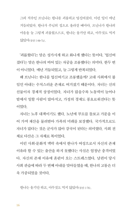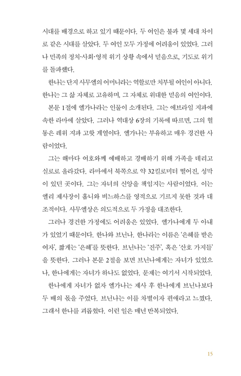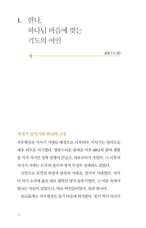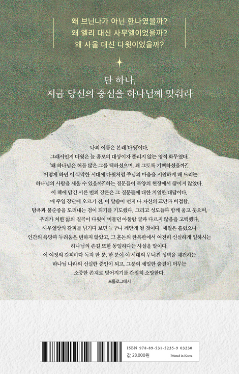 ÀÌ Ã¥¿¡¼ ¿ì¸®´Â ¸¹Àº Àι°µéÀ» ¸¸³ª°Ô µÈ´Ù. Çѳª, »ç¹«¿¤, ´ÙÀ°ú °°ÀÌ Çϳª´ÔÀÇ ¸¶À½¿¡ ¸Â´Â À̵µ ÀÖ°í, ºê´Ñ³ª, È©´Ï¿Í ºñ´ÀÇϽº, »ç¿ï°ú °°ÀÌ ±×·¸Áö ¸øÇÑ À̵鵵 ÀÖ´Ù. ±×·¯³ª ±×µé ¸ðµÎ óÀ½ºÎÅÍ Çϳª´ÔÀÇ ¸¶À½¿¡ ¸Â´Â »ç¶÷À̾ú°Å³ª ±×·¸Áö ¾Ê´Ù°í ¿©°ÜÁ³´ø °ÍÀº ¾Æ´Ï´Ù. ¸Å¼ø°£ ±×µéÀÇ Á߽ɿ¡ Çϳª´ÔÀÌ ÀÖ¾ú´ÂÁö°¡ Çϳª´ÔÀÇ ¸¶À½¿¡ ¸Â´Â »ç¶÷À¸·Î¼ÀÇ ÁÖ¿äÇÑ ¿ä°ÇÀ̾ú´Ù. ÀÌ Ã¥À» ÅëÇØ Áö±Ý ´ç½ÅÀÇ Á߽ɿ¡´Â Çϳª´ÔÀÌ ÀÖ´ÂÁö, ¾Æ´Ï¸é ÀÚ½ÅÀÇ ¿å¸ÁÀÌ ÀÖ´ÂÁö »ìÆìº¸¶ó. Çϳª´ÔÀÌ ÀλýÀÇ ±âÁØÀÌ µÉ ¶§, Çϳª´ÔÀÇ ¸¶À½¿¡µµ ´ç½ÅÀÌ ÀÖÀ» °ÍÀÌ´Ù.