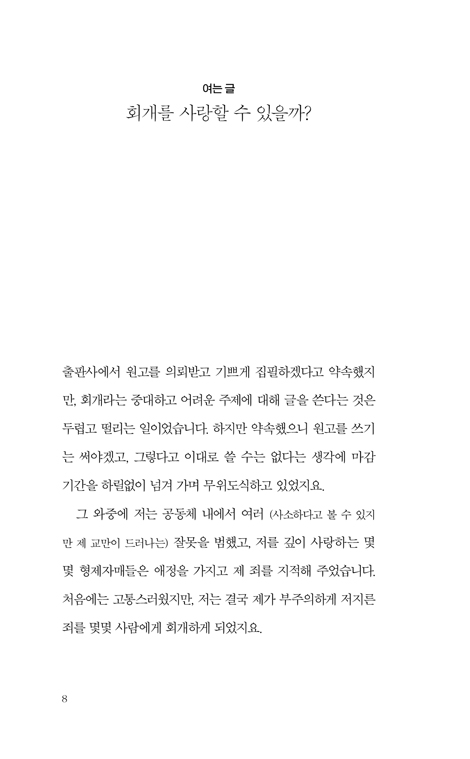 ¿©´Â ±Û: ȸ°³¸¦ »ç¶ûÇÒ ¼ö ÀÖÀ»±î? • 8 1Àå ȸ°³¿Í ¼ÓÁË: ȸ°³ÀÇ ÀÇ¹Ì • 13 2Àå Çϳª´ÔÀº ȸ°³¸¦ ¿ä±¸Çϼž߸¸ ÇÑ´Ù, ¿Ö?: ȸ°³ÀÇ ÀÌÀ¯ • 33 3Àå ȸ°³ÇÏ´Â ¸¶À½Àº ÀÎÀÚÇϽɿ¡ ±â´í´Ù: ¾î¶»°Ô ȸ°³ÇÒ °ÍÀΰ¡ - ½ÇÁ¦ ¿¹ (1) • 47 4Àå ȸ°³ÇÏ´Â ¸¶À½Àº ȸº¹À» ¼Ò¸ÁÇÑ´Ù: ¾î¶»°Ô ȸ°³ÇÒ °ÍÀΰ¡ - ½ÇÁ¦ ¿¹ (2) • 65 5Àå Çϳª´Ô²² ȸ°³Çϸé ÀÌ¿ôÀ» »ç¶ûÇÏ°Ô µÈ´Ù: ȸ°³ÀÇ ¿¸Å • 85 ´Ý´Â ±Û: »ç¶ûÀÇ ¹æÇâÀ» µ¹ÀÌŰ¶ó • 101 ȸ°³ °ü·Ã Ãßõµµ¼¿Í ¾î·Ï • 106 ¹ÌÁÖ¿Í Âü°í¹®Çå • 111 Ã¥ ¼ÓÀ¸·Î