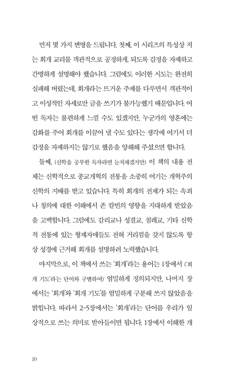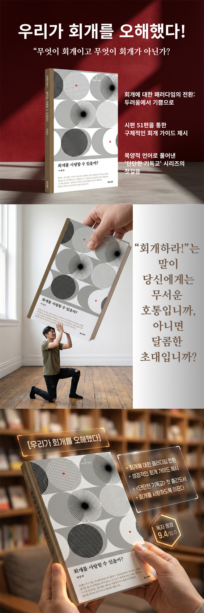 - ¿©´Â ±Û: ȸ°³¸¦ »ç¶ûÇÒ ¼ö ÀÖÀ»±î? ¿¹¼ö´Ô²²¼ ½ÅÀÚ¿¡°Ô ¿©ÀüÈ÷ ȸ°³Ç϶ó°í ¸»¾¸ÇÏ½Ç ¶§, ±×°ÍÀº °íÇàÇ϶ó°í ¶°¹Ì´Â °Íµµ ¾Æ´Ï°í ±«·ÓÈ÷½Ã´Â °Íµµ ¾Æ´Õ´Ï´Ù. ±×°ÍÀº ¼¼»ó¿¡¼ °¡Àå ´ÞÄÞÇÑ ¼Ò¸®ÀÌ¸ç ºÎµå·¯¿î À½¼ºÀÔ´Ï´Ù. ¿ì¸® ±¸ÁÖ²²¼ ½ÅÀÚ¿¡°Ô ¡°ÀÌ¹Ì ³»°¡ ½ÊÀÚ°¡¿Í ºÎȰ·Î ³× Á˸¦ ´Ù »ç¸éÇÏ°í ³Ê¸¦ ÀÇ·Ó´Ù°í ¼±Æ÷ÇÒ ±Ù°Å¸¦ ¸¶·ÃÇØ ³õ¾Ò´Ù. ±×·¯´Ï ÀÌÁ¦ ´õ ÀÌ»ó ÁË¿¡ ºüÁ® »ìÁö ¸»°í ³»°Ô·Î ¿Í¼ ´Ù½Ã Çϳª´Ô°úÀÇ ÀºÇý·Î¿î ±³Á¦¸¦ ȸº¹ÇÏ·Á¹«³ª¡±¶ó°í ¸»¾¸ÇϽô °ÍÀÔ´Ï´Ù. - 1Àå ȸ°³¿Í ¼ÓÁË Çϳª´ÔÀÌ ¾Æ´Ï¶ó Çϳª´ÔÀÇ Çü¹úÀÌ µÎ·Á¿ö¼ Çϴ ȸ°³´Â ÂüµÈ ȸ°³°¡ ¾Æ´Õ´Ï´Ù. ÀÌ·¯ÇÑ È¸°³·Î´Â ¿ì¸®ÀÇ ¸¶À½À» Çϳª´Ô²²·Î µ¹ÀÌų ¼ö ¾ø½À´Ï´Ù. ¡¦ º¹À½Àû ȸ°³´Â Çϳª´ÔÀ» ´Ù½Ã »ç¶ûÇϰí ÈÇØÇϸç Áñ°Å¿öÇϱâ À§ÇÑ È¸°³ÀÔ´Ï´Ù. ¹Ý¸é¿¡ À²¹ýÀû ȸ°³´Â ²÷ÀÓ¾øÀÌ Àڱ⸦ Áõ¸íÇϱâ À§ÇÑ °íÇàÀÏ »ÓÀÔ´Ï´Ù. º¹À½Àû ȸ°³ÀÇ ³¡¿¡ ¿ë¼¿Í ȸñÀÌ ÀÖ´Ù¸é, À²¹ýÀû ȸ°³ÀÇ ³¡¿¡´Â ±³¸¸°ú ºÒ¸¸Á·°ú °ÅÀý°¨¸¸ ÀÖ½À´Ï´Ù. - 2Àå Çϳª´ÔÀº ȸ°³¸¦ ¿ä±¸Çϼž߸¸ ÇÑ´Ù, ¿Ö? ´ÙÀÀº Áö±Ý ¡°Á¦°¡ Á˶õ ÁË´Â ¸ù¶¥ Áö¾úÀ¸³ª ±×°ÍµéÀ» Çϳªµµ ³²±è ¾øÀÌ ¿ë¼ÇØ ÁֽʽÿÀ¡±¶ó°í °£±¸Çϰí ÀÖ½À´Ï´Ù. ¡¦ ¿ì¸®°¡ »ì¾Æ°¡¸é¼ Çϳª´ÔÀÇ ÀºÇý¸¦ °£ÀýÈ÷ ±¸ÇÏÁö ¾Ê´Â ÀÌÀ¯´Â, ´ëü·Î ¿ì¸®°¡ ¾ó¸¶³ª Ä¿´Ù¶õ Á˸¦ Áþ°í »ç´ÂÁö¿¡ ¹«½ÉÇϱ⠶§¹®ÀÔ´Ï´Ù. ¸¹Àº ÁËÀϼö·Ï Å« ÀºÇý°¡ ÇÊ¿äÇÑ ¹ýÀÔ´Ï´Ù. - 3Àå ȸ°³ÇÏ´Â ¸¶À½Àº ÀÎÀÚÇϽɿ¡ ±â´í´Ù °³ÀÎÀÇ ÁË´Â °³Àο¡°Ô¼ ³¡³ªÁö ¾Ê°í °¡Á¤À̳ª ±³È¸ µî °øµ¿Ã¼ Àüü¿¡ ÇØ¸¦ ³¢Ä¡¹Ç·Î, ÂüµÈ ȸ°³´Â °øµ¿Ã¼ÀÇ È¸º¹À» ±¸ÇÏ´Â µ¥±îÁö ³ª¾Æ°¡¾ß ÇÕ´Ï´Ù. ¡¦ ȸ°³´Â Çü¹úÀ» ÇÇÇϱâ À§ÇÑ ¼ö´ÜÀÌ ¾Æ´Ï¶ó, Çϳª´ÔÀ» »ç¶ûÇÏ°í ±×ºÐ°ú ±³Á¦ÇÏ´Â ±â»ÝÀ¸·ÎÀÇ ÃÊ´ëÀÔ´Ï´Ù. - 4 Àå ¡®È¸°³ÇÏ´Â ¸¶À½Àº ȸº¹À» ¼Ò¸ÁÇѴ٠ȸ°³´Â °á±¹ ÀÚ±âÁ߽ɼº¿¡¼ Å»ÃâÇÏ´Â °ÍÀ̰í, µû¶ó¼ ÂüµÈ ȸ°³´Â ÀÌ¿ô »ç¶ûÀ¸·Î µå·¯³ª°Ô µÇ¾î ÀÖ½À´Ï´Ù. ÂüµÈ ȸ°³¸¦ Ãß±¸ÇÏ´Â »ç¶÷µéÀº ÀÌ¿ôÀ» »ç¶ûÇϸç Àڱ⸸ À§ÇÏ´Â »îÀ» °ÅºÎÇÒ ¼ö¹Û¿¡ ¾ø±â ¶§¹®ÀÔ´Ï´Ù. ¡¦ Çϳª´Ô »ç¶û°ú ÀÌ¿ô »ç¶ûÀÌ ¿¬°áµÇ¾î ÀÖµí, Çϳª´Ô²²·Î µ¹ÀÌŰ´Â »ç¶÷Àº ¹Ýµå½Ã ÀÌ¿ô¿¡°Ô ÁöÀº Á˵µ °âÇãÈ÷ ȸ°³ÇÏ¸ç µ¹ÀÌŰ°Ô µÇ¾î ÀÖ½À´Ï´Ù. - 5Àå Çϳª´Ô²² ȸ°³Çϸé ÀÌ¿ôÀ» »ç¶ûÇÏ°Ô µÈ´Ù, °ü·Ã À̹ÌÁö