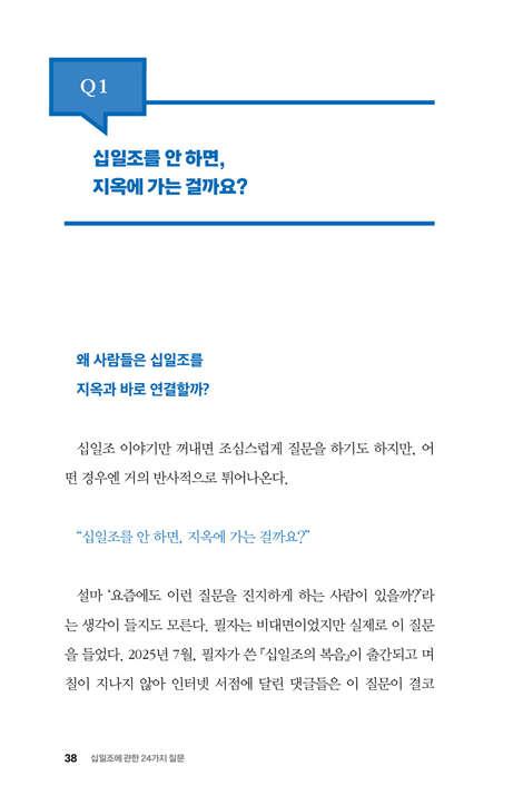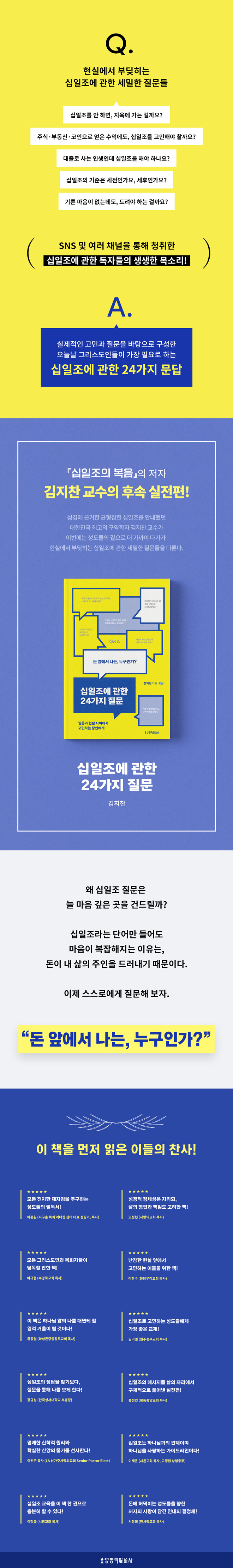 ¼ºµµµéÀÌ Á÷¸éÇÏ´Â ½ÇÁ¦Àû Áú¹®¿¡ ¼º°æÀû ÀÀ´äÀ» ³ª´©´Â ¹æ½ÄÀ¸·Î ½ÊÀÏÁ¶¸¦ ¾È³»ÇÏ´Â ¡º½ÊÀÏÁ¶¿¡ °üÇÑ 24°¡Áö Áú¹®¡» Ãâ°£ÀÌ ¹Ý°©´Ù. ÀúÀÚ´Â ¡º½ÊÀÏÁ¶ÀÇ º¹À½¡»À» ÅëÇØ ¼º°æÀÌ ¸»ÇÏ´Â ½ÊÀÏÁ¶´Â ½Å±¸¾à ¸ðµÎ Çϳª´Ô²² ±â»ÝÀ¸·Î µå¸± ¼ö ÀÖ´Â ±âȸ¸¦ Á¦°øÇϱ⿡ º¹À½À̸é¼, µ¿½Ã¿¡ ¿ø·¡ºÎÅÍ Çϳª´ÔÀÇ °ÍÀ̱⿡ µå·Á¾ß ÇϹǷΠÀ²¹ýÀÓÀ» È®½ÇÈ÷ Áõ¸íÇÏ¿©, ¼º°æ¿¡ ±Ù°ÅÇÑ ±ÕÇüÀâÈù ½ÊÀÏÁ¶¸¦ ¾È³»Çß´Ù.