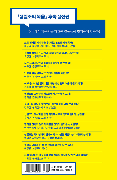 ½ÊÀÏÁ¶ÀÇ º¹À½À̶ó´Â ¸»À» ¼º°æ ÀÚü°¡ µé·ÁÁÖ´Â ¸ñ¼Ò¸®·Î Çѱ¹ ±³È¸ ¼ºµµµé¿¡°Ô ¼±¹°ÇØ ÁØ ÀúÀÚ´Â, ÀÌ Ã¥À» ÅëÇØ »îÀÇ ÇöÀå¿¡¼ ½ÊÀÏÁ¶¿¡ ´ëÇÑ Áú¹®¿¡ ¸íÄèÇÏ°Ô ´äº¯Çϰí ÀÖ´Ù. ½ÊÀÏÁ¶¿¡ ´ëÇÑ À߸øµÈ »ý°¢À» ¹Ù·Î Àâ¾Æ ÁÖ´Â ÇÐÀÚÀû °¡¸£Ä§À» º¸¿© ÁÖ´Â µ¿½Ã¿¡, ½ÊÀÏÁ¶¿¡ ´ëÇÑ Çö½ÇÀû °í¹ÎÀ» °¡Áø ºÐµé¿¡°Ô´Â µû½ºÇÑ ¸ñÀÚÀÇ ½ÉÁ¤À¸·Î ½Å·ÚÇÏ¸ç µû¶ó°¥ ¼ö ÀÖ´Â ÀÌÁ¤Ç¥¸¦ Á¦°øÇØ ÁØ´Ù.