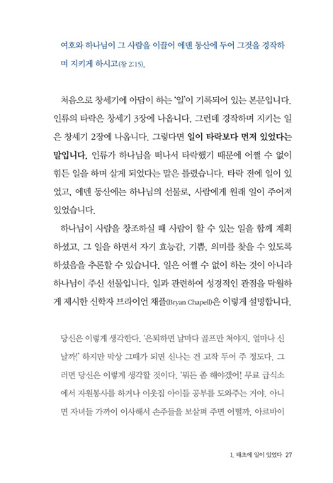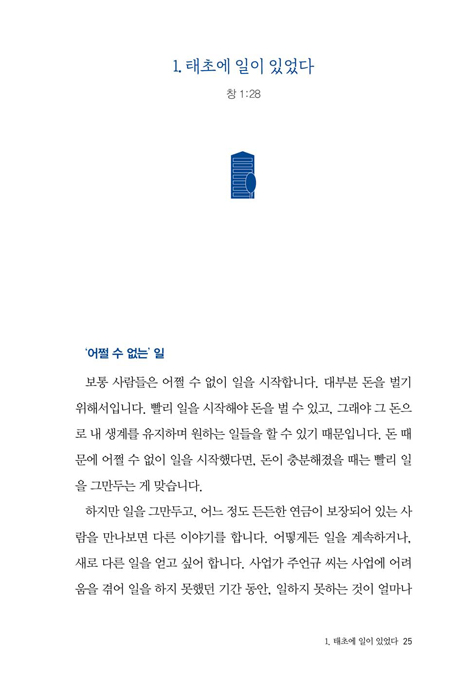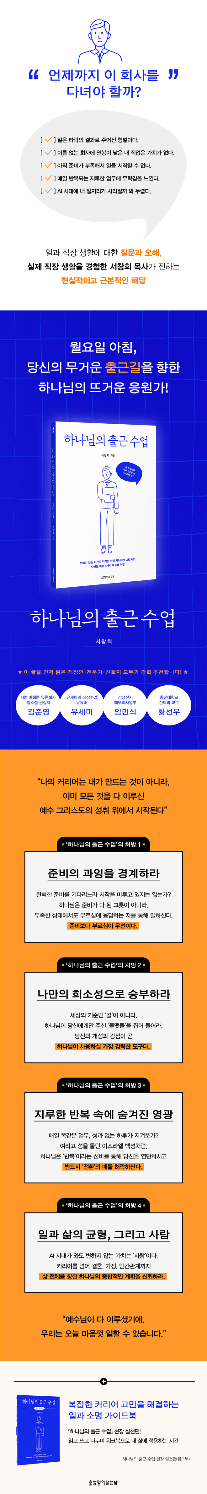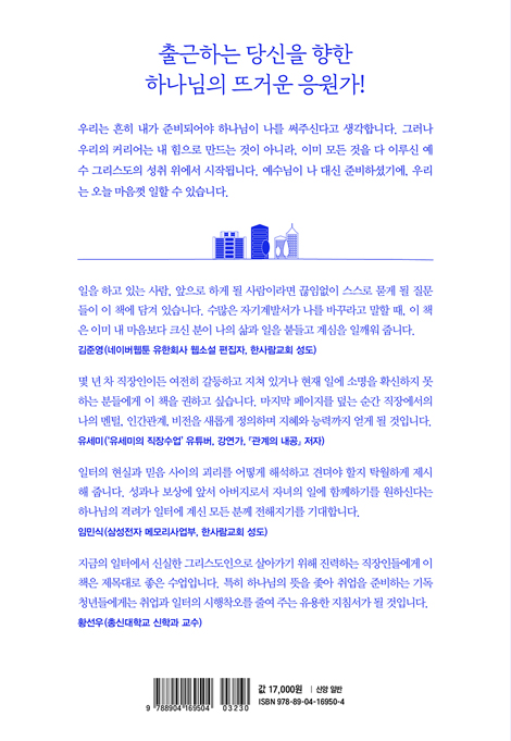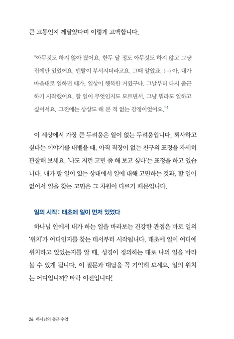 ¿ì¸®´Â ÈçÈ÷ ³»°¡ ÁغñµÇ¾î¾ß Çϳª´ÔÀÌ ³ª¸¦ ½áÁÖ½Å´Ù°í »ý°¢ÇÑ´Ù. ±×·¯³ª ¿ì¸®ÀÇ Ä¿¸®¾î´Â ³»°¡ ¸¸µå´Â °ÍÀÌ ¾Æ´Ï¶ó, ÀÌ¹Ì ¸ðµç °ÍÀ» ´Ù ÀÌ·ç½Å ¿¹¼ö ±×¸®½ºµµÀÇ ¼ºÃë À§¿¡¼ ½ÃÀ۵ȴÙ. ¡ºÇϳª´ÔÀÇ Ãâ±Ù ¼ö¾÷¡»Àº ¸·¿¬È÷ Å©¸®½ºÃµÀÇ ºñÀü°ú ÀÏÀÇ Àǹ̸¦ °Á¶ÇÏÁö ¾Ê´Â´Ù. ½ÇÁ¦ Àϻ󿡼 ºñÀüÀ» ã´Â ¡®°úÁ¤¡¯À» °Á¶Çϸç, ±× ÇÏ·çÇÏ·çÀÇ ¸ð½ÀÀ» º¸¿©ÁØ´Ù. ¸¹Àº ±×¸®½ºµµÀÎÀÌ ¡°°ÅâÇÑ ºñÀüÀÌ ¾øÀ¸¸é Áö±Ý ÇÏ´Â ÀÏÀº ¹«ÀǹÌÇѰ¡?¡± ȤÀº ¡°µ· ¶§¹®¿¡ ÇÏ´Â ³ëµ¿Àº ¼¼¼ÓÀûÀΰ¡?¡±¶ó´Â °í¹Î¿¡ ºüÁö°ï ÇÑ´Ù. ÀúÀÚ ¼Ã¢Èñ ¸ñ»ç´Â »ç±â¾÷ À繫½Ç¿¡¼ 3³â°£ ±Ù¹«Çß´ø ½ÇÁ¦ °æÇèÀ» ¹ÙÅÁÀ¸·Î, ¶á±¸¸§ Àâ´Â ÀÌ·ÐÀÌ ¾Æ´Ñ Áö±ØÈ÷ Çö½ÇÀûÀÌ°í ¼º°æÀûÀÎ ÇØ´äÀ» Á¦½ÃÇÑ´Ù. ÀÏÀº Ÿ¶ô ÀÌÀü ¿¡µ§µ¿»ê¿¡¼ºÎÅÍ ÁÖ¾îÁø Çϳª´ÔÀÇ ¡®¼±¹°¡¯ÀÓÀ» °Á¶Çϸç, °ÅâÇÑ ºñÀüÀ» ã±â Àü ¿À´Ã ÇϷ縦 Ä¡¿ÇÏ°Ô »ì¾Æ³»·Á´Â ¡®»ýÁ¸ÀÇ È°·Â(Vitality)¡¯ ÀÚü°¡ Çϳª´Ô ³ª¶óÀÇ ÀÏ¿¡ Âü¿©ÇÏ´Â À§´ëÇÑ ½ÃÀÛÀ̶ó°í ¿ª¼³ÇÑ´Ù.