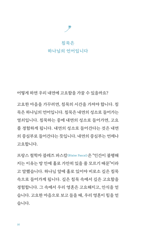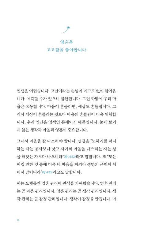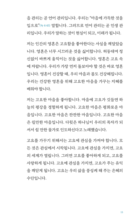 / 25-26ÂÊ ÁöÇý·Î¿î »ç¶÷Àº ³ª¹«°¡ »Ñ¸®¸¦ °¡²ÙµíÀÌ º¸ÀÌÁö ¾Ê´Â °ÍÀ» Àß °¡²Ù´Â »ç¶÷ÀÔ´Ï´Ù. °¡Àå °·ÂÇÑ ÈûÀº ¿ì¸® ³»¸é¿¡¼ ³ª¿É´Ï´Ù. ±×·± ±î´ß¿¡ ¿ì¸®´Â ¸¶À½ÀÇ ±ÙÀ°À» Àß Å°¿ìµµ·Ï ÇØ¾ß ÇÕ´Ï´Ù. ¸¶À½ÀÌ Èçµé¸®¸é, ÀλýÀÌ Èçµé¸³´Ï´Ù. ÇÏÁö¸¸ ¸¶À½ÀÌ °ß°íÇϸé, ¾î¶² ȯ°æ¿¡¼µµ °ß°íÈ÷ ¼³ ¼ö ÀÖ½À´Ï´Ù. ¸¶À½À» °¡²Ù±â¶õ ½¬¿î ÀÏÀÌ ¾Æ´Õ´Ï´Ù. ¸¶Ä¡ Á¤¿øÀ» °¡²ÙµíÀÌ ³¯¸¶´Ù Á¤¼ºÀ» ´ÙÇØ °¡²Ù¾î¾ß ÇÕ´Ï´Ù. ¸¶À½À» °¡²Ù¾î¾ß ÇÏ´Â ÀÌÀ¯´Â ¸¶À½ÀÌ Á¸ÀçÀÇ »Ñ¸®À̱⠶§¹®ÀÔ´Ï´Ù. / 87ÂÊ ¼Óµµ¸¦ ÁÙÀÌ´Â °ÍÀÌ ÁöÇýÀÔ´Ï´Ù. ¼¼»óÀº ºü¸¥ ¼ºÀåÀ» ¿ä±¸ÇÏÁö¸¸, ¼Óµµ°¡ »¡¶óÁú¼ö·Ï ¿µÈ¥Àº ºÒ¾ÈÇØÁý´Ï´Ù. ¸ðµç »ý¸íÀº ÀÛ°Ô ½ÃÀÛÇØ¼ ¼¼È÷ ÀÚ¶ó³³´Ï´Ù. ¾ÆÀÌ´Â ¾ö¸¶ÀÇ Àڱÿ¡¼ 10°³¿ù µ¿¾È ¼¼È÷ ÀÚ¶ø´Ï´Ù. Å« ³ª¹«µµ ÀÛÀº ¾¾¾Ñ¿¡¼ ¼¼È÷ ¼ºÀåÇÕ´Ï´Ù. ¼µÎ¸§Àº ¿µÈ¥À» À§Ãà½Ã۰í, ¼º±ÞÇÔÀº ¿µÈ¥À» ÇÇÆóÇÏ°Ô ¸¸µì´Ï´Ù. ¼Óµµ¸¦ ÁÙ¿©¾ß Çϳª´ÔÀÇ À½¼ºÀÌ µé¸³´Ï´Ù. ¸»¾¸ ¾Õ¿¡ °í¿äÈ÷ ¸Ó¹° ¶§ ¸»¾¸ÀÇ »ý¼ö°¡ ¿µÈ¥À» Àû½Ê´Ï´Ù. / 96ÂÊ ÄªÂùÀº ¿µÈ¥ÀÇ »ê¼ÒÀÔ´Ï´Ù. ĪÂùÀº µû¶æÇÑ ¾ð¾îÀÔ´Ï´Ù. ¹Ý¸é¿¡ ºñ³Àº Â÷°¡¿î ¾ð¾îÀÔ´Ï´Ù. ºñ³Àº »ç¶÷ÀÇ ¿µÈ¥À» Áú½Ä½ÃŰ´Â ¸Å¿¬°úµµ °°½À´Ï´Ù. ĪÂùÀº ĪÂùÀ» ³º½À´Ï´Ù. ĪÂùÀº ¾¾¾Ñ°ú °°½À´Ï´Ù. ĪÂùÇϸé ĪÂùÀ» °ÅµÎ°Ô µË´Ï´Ù. ĪÂùÀº ¸Þ¾Æ¸®¿Í °°½À´Ï´Ù. ¿ì¸®°¡ ´©±º°¡¸¦ ĪÂùÇÏ¸é °°Àº ĪÂùÀ» ¹Þ°Ô µË´Ï´Ù. / 125ÂÊ ¿½ÉÈ÷ ÀÏÇ쵂 ¼µÎ¸£Áö ¸¶½Ê½Ã¿À. Áß¿äÇÑ °ÍÀº õõÈ÷ ²ÙÁØÈ÷ °É¾î°¡´Â °ÍÀÔ´Ï´Ù. ´Ù´Ï¿¤¿¡°Ô¼ ¹è¿ì½Ê½Ã¿À. ±×´Â ÇÏ·ç¿¡ ¼¼ ¹ø¾¿ ¹«¸À» ²Ý°í ±âµµÇß½À´Ï´Ù. ±×´Â õõÈ÷ ²ÙÁØÈ÷ ¹«¸À¸·Î ÀüÁøÇß½À´Ï´Ù. Çϳª´Ôº¸´Ù ¾Õ¼Áö ¾Ê¾Ò½À´Ï´Ù. ±âµµº¸´Ù ¾Õ¼Áö ¾Ê¾Ò½À´Ï´Ù. ¶ÇÇÑ ÀÏ»óÀÇ »î¿¡ ¼º½ÇÇß½À´Ï´Ù. Çϳª´ÔÀº ¼º°øÀûÀÎ »ç¶÷º¸´Ù ¼º½ÇÇÑ »ç¶÷À» ãÀ¸½Ê´Ï´Ù. ¿Ö³ÄÇÏ¸é ¼º½Ç ¼Ó¿¡ ÁøÁ¤ÇÑ ¼º°øÀÌ ´ã°Ü Àֱ⠶§¹®ÀÔ´Ï´Ù. ¿ì¸® ÇÔ²² õõÈ÷ ±×¸®°í ²ÙÁØÈ÷ Á¤ÁøÇսôÙ. / 183ÂÊ »óó¸¦ Çϳª´Ô²² ¸Ã±â½Ê½Ã¿À. »óó°¡ ³¡ÀÌ ¾Æ´Õ´Ï´Ù. Àΰ£Àº ¿¬¾àÇÏÁö¸¸, »ý°¢º¸´Ù Áú±é´Ï´Ù. ÀλýÀº »óó·Î ¹«³ÊÁöÁö ¾Ê½À´Ï´Ù. ¿ÀÈ÷·Á ±× »óó°¡ »õ·Î¿î ±æÀ» ¿¾î ÁÝ´Ï´Ù. »óó¸¦ ¹«Á¶°Ç ¹ÌÈÇÏ·Á´Â °ÍÀÌ ¾Æ´Õ´Ï´Ù. ±×·¯³ª ¼¼»ó¸¸»ç¿¡´Â ¾ç¸é¼ºÀÌ ÀÖ½À´Ï´Ù. ±èÁ¤È£ ½ÃÀÎÀº ½Ã¸¦ ÅëÇØ ¡°¼¼»ó¿¡ »óó ¾Æ´Ñ ²ÉÀÌ ¾ø½À´Ï´Ù¡±¶ó°í ¸»Çß½À´Ï´Ù. ¾Æ¸§´Ù¿î ²ÉÀº »óó¿Í ÇÔ²² ÇǾ´Ï´Ù. ¿¹¼ö´Ôµµ ½ÊÀÚ°¡¿¡¼ ±íÀº »óó¸¦ ¹ÞÀ¸¼Ì½À´Ï´Ù. ±×·¯³ª ¹Ù·Î ±× »óó À§¿¡ ºÎȰÀÇ ´É·ÂÀÌ ÀÓÇß½À´Ï´Ù. / 199-200ÂÊ °ü·Ã À̹ÌÁö
