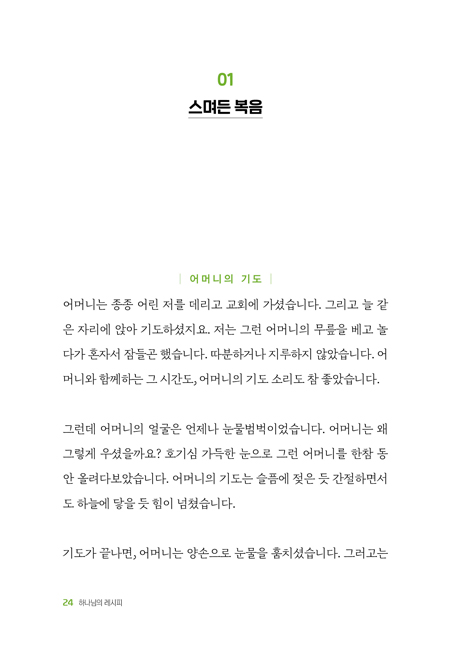 ![]() ¼¼¿òºÏ½º ¡®°£ÁõÀÇ Àç¹ß°ß ½Ã¸®Á ¿ ¹øÂ° Ã¥! ¡¶Çϳª´ÔÀÇ ·¹½ÃÇÇ¡· ±¦Âú¾Æ º¸ÀÌÁö¸¸ ±¦ÂúÁö ¾ÊÀº ´ç½Å¿¡°Ô ÀüÇÏ´Â À̾߱⠡°¿ì¸® »îÀÇ ±× ¹«¾ùµµ ¹ö¸®Áö ¾ÊÀ¸½Ê´Ï´Ù.¡± ¡°¿ì¸®ÀÇ ¸ðµç Èñ·Î¾Ö¶ôÀº Çϳª´ÔÀÇ °¡Àå Æ¯º°ÇÑ ·¹½ÃÇÇ!¡± ⚫ °³Ã´ ±³È¸ ¸ñ»ç ¾Æµé, ¿Áž¹æ, ÀÏÇÏ´Â ¸ñȸÀÚ·Î »ì¾Æ¿Â »îÀÇ Èñ·Î¾Ö¶ô ⚫ »îÀÇ ÇÑ ÀÚ¶ôÀÌ¶óµµ Çϳª´ÔÀ» ´à¾Æ º¸·Á ¹ß¹öµÕ Ä£ »ç¶÷ÀÇ À̾߱â ⚫ °¡Àå Æ¯º°ÇÑ ¿ä¸®¸¦ ¸¸µé¾î ³»½Ã´Â ±×ºÐÀÇ µû¶æÇÑ ¼Õ¸ÀÀ» ´À²¸ º¸¼¼¿ä! ¡¶Çϳª´ÔÀÇ ·¹½ÃÇÇ¡·´Â ¿ì¸®°¡ °Þ´Â ¸ðµç °í³°ú ½ÇÆÐ, ¾àÁ¡°ú ºÎ´ãÀÌ °áÄÚ ¿ì¸® Àλý¿¡ ÇêµÇÁö ¾ÊÀ½À» µû¶æÇÏ°Ô Áõ¾ðÇÏ´Â °£ÁõÁýÀÌ´Ù. ¡®ÀÏÇÏ´Â ¸ñȸÀÚ¡¯·Î¼ ¹¬¹¬È÷ °É¾î¿Â ÀúÀÚ ¹ÎÂù¾ç ¸ñ»ç´Â ÀÚ½ÅÀÇ »îÀ» ÇϳªÀÇ ¿ä¸® °úÁ¤¿¡ ºñÀ¯Çϸç, Çϳª´Ô²²¼ ¾î¶»°Ô ¿ì¸®ÀÇ ÀλýÀ» °¡Àå ¿Ïº®ÇÑ ¿ä¸®·Î ¸¸µé¾î °¡½Ã´ÂÁö Áø¼ÖÇÏ°Ô Ç®¾î³½´Ù. ÀÌ Ã¥Àº ´Ü¼øÈ÷ ÇÑ °³ÀÎÀÇ À̾߱⿡ ¸Ó¹°Áö ¾Ê´Â´Ù. ÀúÀÚ´Â ÀÚ½ÅÀÇ °¨Á¤°ú ¿å±¸°¡ ¿ì¼±½ÃµÇ´Â ½Ã´ë ¼Ó¿¡¼, Çϳª´ÔÀ» ´à¾Æ º¸·Á ¹ß¹öµÕ Ä¡´Â Áø½ÇÇÑ »îÀ» ´ã´ãÇÏ°Ô °í¹éÇÑ´Ù. ¿Áž¹æ ½ÅÈ¥ »ýȰ, ¹ÝÁöÇÏ Àü¼ÂÁý¿¡¼ÀÇ ¾î·Á¿ò, ¾ÆÇ ¸öÀ» À̲ø°í °¨´çÇß´ø »ç¿ª µî, »îÀÇ Èñ·Î¾Ö¶ôÀÌ °í½º¶õÈ÷ ´ã°Ü ÀÖ´Ù. µ¶ÀÚµéÀº ÀÌ Ã¥À» ÅëÇØ ¶§·Î´Â ¸À¾ø´Ù°í ÅõÁ¤ ºÎ·È´ø ÀλýÀÇ ¼ø°£µéÀÌ »ç½ÇÀº Çϳª´ÔÀÇ °¡Àå ±ÍÇÑ Àç·á¿´À½À» ±ú´Ý°Ô µÉ °ÍÀÌ´Ù. ¶ÇÇÑ, ÀúÀÚÀÇ °í¹é¿¡ ±íÀÌ °ø°¨Çϸç, ¿ì¸®ÀÇ »î ¼Ó¿¡¼ °Þ¾î¿Â ¸ðµç ½Ã°£ÀÌ Çϳª´ÔÀÇ ¼±ÇϽаèȹ ¾È¿¡ ÀÖ¾úÀ½À» ¹ß°ßÇÏ°Ô µÉ °ÍÀÌ´Ù. ÀÌ Ã¥Àº »îÀÇ ¹æÇâÀ» ÀÒ°í Çì¸Å´Â ¸ðµç À̵鿡°Ô °¡Àå µû¶æÇÏ°í ¸ÀÀÖ´Â À§·Î¸¦ ÀüÇÏ´Â, Çϳª´ÔÀÇ »ç¶ûÀÌ °¡µæ ´ã±ä ·¹½ÃÇÇ´Ù. [ÇÁ·Ñ·Î±×] (¡¦Àü·«¡¦) Á¦ À̾߱⸦ ±Û·Î Ç®¾î³½´Ù´Â °Í, Á¦ ½Ã°£À» Á¾ÀÌ¿¡ ´ã¾Æ³½´Ù´Â °ÍÀº ¿ª½Ã³ª ½±Áö ¾Ê¾Ò½À´Ï´Ù. ¾Ö½á ¿Ü¸éÇß´ø °¨Á¤µé°ú ¸¶ÁÖÇÒ ¶§´Â °íÅ뽺·´±â±îÁö Çß½À´Ï´Ù. ÇÏÁö¸¸ µ¹¾Æº¸´Ï, ±× ¸ðµç Èñ·Î¾Ö¶ô¿¡ ÁÖ´Ô²²¼ ÇÔ²² °è¼Ì½À´Ï´Ù. º»¹® Àå Á¦¸ñ¿¡ ÀÖ´Â ¡®Prep(ÇÁ·¾)¡¯Àº ¡®ÁغñÇÏ´Ù¡¯¶ó´Â ÀǹÌÀÇ ¿µ¾î ´Ü¾î ¡®prepare¡¯ÀÇ ÁÙÀÓ¸»ÀÔ´Ï´Ù. ƯÈ÷ ¿ä¸®¸¦ ½ÃÀÛÇϱâ Àü¿¡ ½ÄÀç·á¸¦ ¹Ì¸® ¼ÕÁúÇϸç ÁغñÇÏ´Â °úÁ¤À» ÀǹÌÇÏ´Â ¸»·Îµµ ¾²ÀÔ´Ï´Ù. Á¤¸»ÀÌÁö Çϳª´Ô²²¼´Â ¿ì¸® °¢ÀÚ¸¦ À§ÇØ °¡Àå ÁÁÀº ·¹½ÃÇÇ(recipe)¸¦ °¡Áö°í °è½Ã¸ç, ±× Ưº°ÇÑ ·¹½ÃÇÇ¿¡ ¾î¿ï¸®´Â Àç·áµéÀ» Á¤È®ÇÏ°Ô »ç¿ëÇϽʴϴÙ. ±× ¿ÏÀüÇϽм·¸® °¡¿îµ¥¼ ¿ì¸® »îÀÇ ±× ¹«¾ùµµ ¹ö¸®Áö ¾ÊÀ¸½Ê´Ï´Ù. Áö±ØÈ÷ Æò¹üÇÏ°í °³ÀÎÀûÀÎ °£ÁõÀ̱⿡, ½Ã°£ÀÇ ¼ø¼º¸´Ù´Â °ø°¨ÇÒ ¼ö ÀÖ´Â ¸î °¡Áö ÁÖÁ¦µé·Î ±¸ºÐÇÏ¿© À̾߱⸦ Ç®¾î°¬½À´Ï´Ù. Áö³ªÄ£ ÇØ¼®À̳ª °³ÀÔµµ ÃÖ¼ÒÈÇß½À´Ï´Ù. »ç°ÇÀ» °´°üÈÇÏ·Á°í ³ë·ÂÇß°í, Çʿ信 µû¶ó¼´Â Ãà¼ÒÇϰųª »ý·«Çϱ⵵ Çß½À´Ï´Ù. Á¦ À̾߱âÀÌÁö¸¸ Á¦°¡ ¾Æ´Ñ Çϳª´Ô²²¼ µå·¯³ª½Ã¸é ÁÁ°Ú´Ù°í »ý°¢Çß½À´Ï´Ù. (¡¦Áß·«¡¦) ºÎµð ÆäÀÌÁö¸¦ ³Ñ±â´Â ¿©·¯ºÐÀÇ ¼Õ³¡¿¡ ¿¹¼ö´ÔÀÇ Çâ±â¸¸ £°Ô ¹è¾î³ª±â¸¦ ¼Ò¸ÁÇϸç, ÁÖ´Ô ¾È¿¡¼ ÀÏ»óÀ» »ì¾Æ ³»´Â ¸ðµç ºÐ°ú ¿ì¸®ÀÇ ÇÏ´Ã ¾Æ¹öÁö²² ÀÌ Ã¥À» ¹ÙĨ´Ï´Ù. ÀúÀÚ ¹× ¿ªÀÚ ¼Ò°³