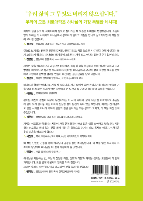 _±è¹Îö (ÇѼֱ³È¸ ´ãÀÓ ¸ñ»ç, ¡º¼ºµµ´Â ¿ì¸® °¡Á·»ÓÀÔ´Ï´Ù¡» ÀúÀÚ) ÀÌ Ã¥Àº ³¡±îÁö ÀÐ¾î ºÁ¾ß ÇÕ´Ï´Ù. °ÑÀ¸·Î º¸±â¿¡´Â Æò¹üÇÑ °£ÁõÁý °°Áö¸¸, ³¡±îÁö Àаí Ã¥À» µ¤À¸¸é, ³ª ÀÚ½ÅÀÌ ¾î¶»°Ô »ì¾Æ¾ß ÇÒÁö °í¹ÎÇÏ°Ô µË´Ï´Ù. ¡®Çϳª´ÔÀÇ ·¹½ÃÇÇ¡¯¿¡ ¾²ÀÓ¹Þ´Â ÀÚ°¡ µÇ°í ½Í´Ù´Â °ÇÑ ¿å±¸°¡ ÀϾ´Ï´Ù. °ç¿¡ ÀúÀÚ¿Í °°Àº Çϳª´ÔÀÇ »ç¶÷ÀÌ ÀÖ¾î¼ °¨»çÇϰí ÇູÇÕ´Ï´Ù. ¶Ñ¹÷¶Ñ¹÷ ÁÖ´Ô²²¼ °¡½Å ±æÀ» °È´Â ÀúÀÚ¿Í ±× °¡Á¤, ±×¸®°í ±³È¸¿¡ ¹Ú¼ö¸¦ º¸³À´Ï´Ù. ÀÌ Ã¥À» ÅëÇØ ¡®Çϳª´ÔÀÇ ·¹½ÃÇÇ¡¯°¡ ´õ¿í dz¼ºÇØÁú °ÍÀ» ¹Ï½À´Ï´Ù. _±è¿µÇÑ (ǰ´Â±³È¸ ´ãÀÓ ¸ñ»ç, Next ¼¼´ë Ministry ´ëÇ¥) ÀúÀÚ´Â »îÀ» ÇϳªÀÇ ¿ä¸® °úÁ¤À¸·Î ºñÀ¯Çϸç, ƯÁ¤ À½½ÄÀ» ¿Ï¼ºÇϱâ À§ÇØ ÇÊ¿äÇÑ Àç·á¿Í Á¶¸® ¹æ¹ýÀ» ü°èÀûÀ¸·Î Á¤¸®ÇÑ ·¹½ÃÇÇ(Recipe)ó·³, Çϳª´Ô²²¼ ¿ì¸®ÀÇ »î¿¡ ÀûÇÕÇÑ Àç·á¸¦ ¼±ÅÃÇϰí Á¶ÇÕÇÏ¿© ¿Ïº®ÇÑ °á°ú¸¦ ¸¸µé¾î ³»½Å´Ù´Â ±íÀº ÀºÀ¯¸¦ ´ã°í ÀÖ½À´Ï´Ù. ÀÌ Ã¥Àº ½Å¾ÓÀÌ Àϻ󿡼 ¾î¶»°Ô ½ÇõµÉ ¼ö ÀÖ´ÂÁö ½Å¾Ó°ú »îÀÇ ±ÕÇüÀ» °í¹ÎÇÏ´Â ¸ðµç ±×¸®½ºµµÀε鿡°Ô À¯ÀÍÇÕ´Ï´Ù. µû¶ó¼ »î ¼Ó¿¡¼ Çϳª´ÔÀÇ ¼·¸®¸¦ üÇèÇϰíÀÚ ÇÏ´Â ¸ðµç À̵鿡°Ô º»¼ÀÇ Àϵ¶À» ±ÇÇÕ´Ï´Ù. _±èÀºÈ£ (¹é·Éµµ ¿¬Áö±³È¸ ´ãÀÓ ¸ñ»ç, îñ Çѱ¹¼º¼´ëÇб³ ±³¼ö) º»¼´Â ÀÚ½ÅÀÇ °¨Á¤°ú ¿å±¸°¡ ¿ì¼±½ÃµÇ´Â ÀÌ ½Ã´ë ¼Ó¿¡¼, »îÀÇ ÀÛÀº ÇÑ ÀÚ¶ôÀÌ¶óµµ ÁÖ´ÔÀ» ´õ ´à¾Æ º¸·Á ¹ß¹öµÕ Ä¡´Â ÀúÀÚÀÇ Áø½ÇÇÑ »îÀÌ ¿ÂÀüÈ÷ ³ì¾Æ Àִ åÀÔ´Ï´Ù. ´«¹°°ú ±â»Ý, ¾ÆÇİú ¿Ü·Î¿ò, ½ÇÆÐ¿Í ȸº¹ÀÇ ¸ðµç ¼ø°£Àº Çϳª´ÔÀÇ À̾߱⸦ ÆîÃÄ ³ª°¡´Â ¼ÒÁßÇÑ Àç·á°¡ µÇ¾ú°í, ¼±ÇϽŠÇϳª´ÔÀº ±×ÀÇ »îÀ» °¡Àå ¾Æ¸§´Ù¿î ·¹½ÃÇÇ·Î ¿«¾î ÃÖ°íÀÇ ¿µ±¤À» ¹ÞÀ¸¼ÌÀ½À» °í¹éÇÏ°Ô ÇÕ´Ï´Ù. ¶§·Î´Â ±ä Åͳΰúµµ °°Àº ½Ã±â¸¦ Áö³ª¸ç ¹¬¹¬È÷ ¹ÏÀ½ÀÇ ±æÀ» °É¾î°¡´Â ¸ðµç ¼ºµµ¿Í ±³È¸¿¡, ÀÌ Ã¥À» ÀڽŠÀÖ°Ô ÃßõÇÕ´Ï´Ù. _±èÇöÁ¤ (ÇູÇѱ³È¸ ´ãÀÓ ¸ñ»ç, ¸®½ºÅÜ ¹Ì´Ï½ºÆ®¸® °øµ¿´ëÇ¥) ¿©±â ¹Ùº¸ ¸ñ»ç°¡ Çϳª ÀÖ½À´Ï´Ù. ¸¹Àº ±³È¸¿¡¼ ¹Ùº¸ ¸ñ»ç¸¦ µ¥·Á°¡°í ½Í¾î Çß½À´Ï´Ù. ÁÁÀº ûºù Á¦¾ÈµéÀ» ÀúÀÚ´Â ´Ù °ÅÀýÇß½À´Ï´Ù. °¡³ÇÏ°í ¾î·Á¿ïÁö¶óµµ ¼ºµµµé°ú ÇÔ²²ÇÏ´Â »îÀ» ÅÃÇß½À´Ï´Ù. ÀúÀÚ´Â ¼ºµµµé°ú ÇÔ²²ÇÏ´Â ½Ã°£ÀÌ °¡Àå ÇູÇÏ´Ù¸ç ¹Ùº¸ °°Àº »îÀ» »ì¾Æ°¡°í ÀÖ½À´Ï´Ù. »ç¶ûÇÏ´Â ¼ºµµµé°ú ÇÔ²² ÀÖ´Â °ÍÀ» ¼¼»ó °¡Àå Å« ÇູÀ¸·Î ¿©±â´Â ¹Ùº¸ ¸ñ»çÀÇ À̾߱Ⱑ Â÷°¡¿î ¿ì¸® ¸¶À½À» µû½ºÇÏ°Ô ÇÕ´Ï´Ù. _¼Áø±³ (¸ñ»ç, ÀÛÀº¿¹¼ö¼±±³È¸ ´ëÇ¥, ¡¶¼±ÇÑ »ç¸¶¸®¾ÆÀÎÀÇ ¸ñÀûÁö¡· ÀúÀÚ) ³»ÀÏÀÌ ºÒÈ®½ÇÇÑ È¥µ·ÀÇ ½Ã´ë¿¡ ÇÑ »ç¶÷ÀÇ ÀλýÀ» ½á ³»·Á°¡´Â ¿©Á¤ÀÌ ³Ê¹«³ª ¾Æ¸§´ä½À´Ï´Ù. ¼¼¿ùÀÇ ³ªÀÌÅ׸¦ ±×¸®¸ç ´«¹°·Î Áö³ª¿Â ±× ±æÀÌ Âù¼ÛÀ¸·Î ¹Ù²î´Â ³î¶ó¿î ÀºÇýÀÇ ¼ø°£µé·Î °£ÁõÀÌ µÇ¾î °í½º¶õÈ÷ ´ã°Ü ÀÖ½À´Ï´Ù. ¼¼»óÀÌ ÁÖ´Â ¸¸Á·Àº ¼ø°£ÀûÀÌÁö¸¸ Çϳª´Ô²²¼ Áֽô ¸¸Á·Àº ¿µ¿øÇÕ´Ï´Ù. ÀÌ Áø¸®°¡ ÀúÀÚÀÇ ÀλýÀ» ÅëÇØ »ì¾Æ ¼û ½¬µí Áõ¾ðµÇ°í ÀÖ½À´Ï´Ù. ÀÌ Ã¥Àº ´Ü¼øÇÑ °£ÁõÀ» ³Ñ¾î Çϳª´ÔÀÇ ¿µ±¤À» ÇâÇÑ ÃÊ´ëÀåÀÔ´Ï´Ù. ÀÌ Ã¥À» Àд µ¶ÀÚ¸¶´Ù ±× ÃÊ´ë¿¡ ÀÀ´äÇϸç Çϳª´ÔÀ» ´õ ±íÀÌ »ç¶ûÇÏ°Ô µÉ °ÍÀÔ´Ï´Ù. _À念½Ä (¼¿ï ¿¥¸¶¿À±³È¸ ´ãÀÓ ¸ñ»ç) ±×´Â ÀÛ°í ¼Ò¹ÚÇÑ ¿ì¸® ¼±±³È¸¿¡¼ ¸ñ»ç ¾È¼ö¸¦ ¹Þ°í¼ ÁÖ´ÔÀ» ´àÀº ¸ð½ÀÀ¸·Î ¸ñȸÇÏ¿´½À´Ï´Ù. ±×ÀÇ ¾ð¾î, ǰ¼º, ¼¶±è°ú Çå½ÅÀº ¸ðµÎÀÇ »ç¶û°ú Á¸°æÀ» ¹Þ±â¿¡ ³Ë³ËÇÏ¿´½À´Ï´Ù. ±×´Â Á¤¸» ¸À±ò³ª´Â ¸ñ»çÀÔ´Ï´Ù. ¸¶Ä¡ ¼ûÀº ¸ÀÁý°ú °°½À´Ï´Ù. Çϳª´ÔÀ» »ç¶ûÇÏ´Â ¹ý, ÁÖ´ÔÀÇ ÁøÁ¤ÇÑ ¸¶À½, ¼ºµµ¿Í ÀÌ¿ô°ú °¡Á·À» ¼¶±â´Â ¸ðµ¨µéÀÌ ÀÌ Ã¥ ¾È¿¡ °¡µæÇÕ´Ï´Ù. ¸ðµç ºÐ¿¡°Ô º»¼ÀÇ Àϵ¶À» Àû±Ø ±ÇÇÕ´Ï´Ù. ±×·¯¸é ¿ì¸®µµ ¶ÇÇÑ ¡®Çϳª´ÔÀÇ ·¹½ÃÇÇ¡¯ÀÎ °ÍÀ» ¾Ë°Ô µÉ °ÍÀÔ´Ï´Ù. _ÇöÈñö (Áß¾Ó¼º¼±³È¸ °ø·Î ¸ñ»ç, Çѱ¹¼º¼¼±±³È¸ ÀÌ»çÀå) ¸ñÂ÷