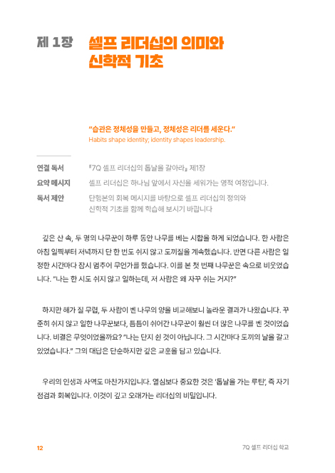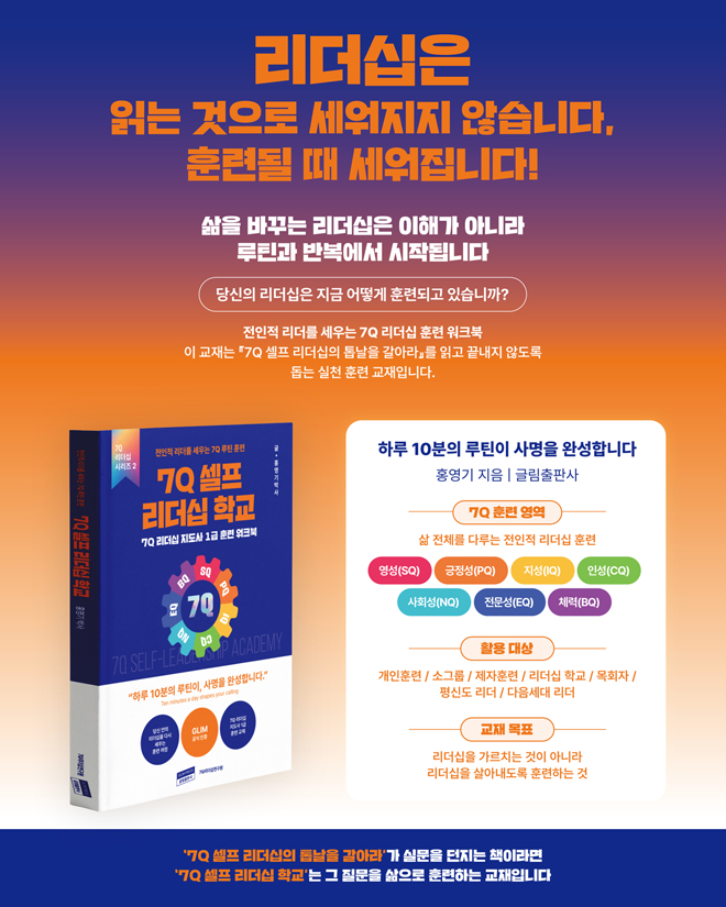 ¡º7Q ¼¿ÇÁ ¸®´õ½Ê Çб³¡» ¡°¸®´õ½ÊÀº ´ÜÁö ¹æÇâÀÌ ¾Æ´Ï¶ó, ¸ÅÀÏ ÈÆ·ÃµÇ´Â ¡®·çƾ¡¯ÀÌ´Ù.¡± ºÎÁ¦: ÀüÀÎÀû ¸®´õ¸¦ ¼¼¿ì´Â 7Q ·çƾ ÈÆ·Ã (7Q ¸®´õ½Ê Áöµµ»ç 1±Þ ÈÆ·Ã ¿öÅ©ºÏ) ¡á ¸ØÃßÁö ¸øÇÏ´Â ¸®´õµéÀÇ ½Ã´ë ¿À´ÃÀÇ ¸®´õµéÀº ½¬Áö ¾Ê°í ´Þ¸®°í ÀÖ½À´Ï´Ù. »ç¿ªÀÚ´Â »ç¿ª¿¡, Á÷ÀåÀÎÀº ¼º°ú¿¡, ºÎ¸ð´Â Ã¥ÀÓ¿¡, ¸ðµÎ°¡ ÃÖ¼±À» ´ÙÇØ »ì°í ÀÖ½À´Ï´Ù. ±×·¯³ª ¾î´À ¼ø°£, ¡°¿Ö ÀÌ·¸°Ô ÁöÄ¡Áö?¡± ¡°ºÐ¸í ÀßÇϰí Àִµ¥, ¿Ö °øÇãÇÏÁö?¡± ¶ó´Â Áú¹® ¾Õ¿¡ ¸ØÃç ¼°Ô µË´Ï´Ù. ¹®Á¦´Â ´õ ¿½ÉÈ÷ »ìÁö ¾Ê¾Æ¼°¡ ¾Æ´Ï¶ó, ³»¸éÀ» Á¤ºñÇÏ´Â ±¸Á¶¿Í ÈÆ·ÃÀÇ ºÎÀçÀÔ´Ï´Ù. ¡º7Q ¼¿ÇÁ ¸®´õ½Ê Çб³¡»´Â ¹Ù·Î ÀÌ ÁöÁ¡¿¡¼ ¸®´õ¿¡°Ô ¹¯½À´Ï´Ù. ¡°´ç½ÅÀº Áö±Ýµµ ´Þ¸®°í ÀÖ½À´Ï±î, ¾Æ´Ï¸é ´ç½ÅÀÇ »îÀ» ´Ù½Ã ¼¼¿ì°í ÀÖ½À´Ï±î?¡± ¡á ¡®ÀÐ°í ³¡³ª´Â Ã¥¡¯ÀÌ ¾Æ´Ñ, ¡®»ì¾Æ³»´Â ±³À硯 ÀÌ ±³Àç´Â ´Ü¼øÇÑ ÀÚ±â°è¹ß¼µµ, ÀÌ·Ð Á᫐ ±³Àçµµ ¾Æ´Õ´Ï´Ù. ÀÌ Ã¥Àº ÈÆ·Ã ¸Å´º¾óÀ̸ç, »îÀÇ À籸Á¶È µµ±¸ÀÔ´Ï´Ù. ÇÏ·ç 10ºÐ, ¸»¾¸°ú ±âµµ °¨»ç¿Í ±àÁ¤ »ç°í¿Í ¼ºÂû ¼ºÇ°°ú °ü°è ¼Ò¸í°ú ½ÇÇà ¸ö°ú ȸº¹ ÀÌ ÀÛÀº ·çƾµéÀÌ ½×¿© ÀλýÀÇ ¹æÇâÀ» ¹Ù²Ù´Â ±¸Á¶°¡ µÇµµ·Ï ¼³°èµÇ¾î ÀÖ½À´Ï´Ù. ÀÌ ±³Àç´Â ¡°ÀÌ°Ç ÁÁÀº ¸»ÀÌ´Ù¡±°¡ ¾Æ´Ï¶ó, ¡°ÀÌ°Ç ¿À´ÃºÎÅÍ ÇÒ ¼ö ÀÖ°Ú´Ù¡±´Â °í¹éÀ» ²ø¾î³À´Ï´Ù. ¡á ´ÜÇົ¿¡¼ Çб³·Î: ¸Þ½ÃÁö¿¡¼ ¡®ÈÆ·Ã ½Ã½ºÅÛ¡¯À¸·Î ¡º7Q ¼¿ÇÁ ¸®´õ½Ê Çб³¡»´Â ¸¹Àº µ¶ÀÚµéÀÇ °ø°¨À» À̲ø¾î³½ ¡º7Q ¼¿ÇÁ ¸®´õ½ÊÀÇ Å鳯À» °¥¾Æ¶ó¡»ÀÇ ¸Þ½ÃÁö¸¦ ½ÇÁ¦ ÈÆ·Ã ±¸Á¶·Î ¿Ï¼ºÇÑ °ø½Ä ¿öÅ©ºÏÀÔ´Ï´Ù. ---------------------------------------------------- ±¸ºÐ | ´ÜÇົ | ±³Àç ÃÊÁ¡ | ±ú´ÞÀ½ | ½Çõ ¹æÇâ | ÅëÂû | ÈÆ·Ã Áú¹® | ¿Ö ¹Ù²î¾î¾ß Çϴ°¡? | ¾î¶»°Ô ¹Ù²Ü °ÍÀΰ¡? °á°ú | °á´Ü | º¯È ---------------------------------------------------- ÀÌÁ¦ µ¶ÀÚ´Â ´õ ÀÌ»ó °¨µ¿¸¸ ¹Þ´Â »ç¶÷ÀÌ ¾Æ´Ï¶ó, ÈÆ·Ã¹Þ´Â Á¦ÀÚ, ´Ù½Ã ¼¼¿öÁö´Â ¸®´õ°¡ µË´Ï´Ù. ¡á 7Q ÀüÀÎÀû ·çƾ: »î Àüü¸¦ Àç¼³°èÇÏ´Ù ¡º7Q ¼¿ÇÁ ¸®´õ½Ê Çб³¡»´Â ¿µ¼º¿¡¼ ü·Â±îÁö, »î Àüü¸¦ Á¡°ËÇÏ´Â 7´ë ÀüÀÎÀû ·çƾ ±¸Á¶¸¦ Á¦½ÃÇÕ´Ï´Ù. SQ(¿µ¼º) – »îÀÇ ÀÇ¹Ì¿Í Çϳª´Ô°úÀÇ ¿¬°á PQ(±àÁ¤¼º) – Àý¸ÁÀ» ÇØ¼®ÇÏ´Â ¹ÏÀ½ IQ(Áö¼º) – ¹è¿ì°í, ¹¯°í, »ý°¢ÇÏ´Â Èû°ú ÅëÂû CQ(Àμº) – ¼ºÇ°°ú Ã¥ÀÓ NQ(»çȸ¼º) – °ü°è ȸº¹°ú °øµ¿Ã¼ EQ(Àü¹®¼º) – ¼Ò¸í À§¿¡ ¼¼¿î ½Ç·Â BQ(ü·Â) – ¸öÀ» ÅëÇÑ Áö¼Ó °¡´ÉÇÑ ¿¡³ÊÁö¿Í »ç¸í ÀÌ Àϰö ¿µ¿ªÀº µû·Î Á¸ÀçÇÏÁö ¾Ê½À´Ï´Ù. Çϳª¶óµµ ¹«³ÊÁö¸é Àüü ¸®´õ½ÊÀÌ Èçµé¸®´Â, ÇϳªÀÇ ¿£ÁøÀ̸ç ÇϳªÀÇ Å鳯ÀÔ´Ï´Ù. ¡á »îÀ» ¹Ù²Ù´Â 5´Ü°è ÈÆ·Ã ±¸Á¶ ÀÌ ±³Àç´Â ´ÙÀ½ÀÇ 5´Ü°è ·çƾ ÈÆ·Ã »çÀÌŬ·Î ±¸¼ºµÇ¾î ÀÖ½À´Ï´Ù. µµÀÔ ¿¹È – ¸¶À½À» ¿©´Â ½ºÅ丮 ÇÙ½É ¸Þ½ÃÁö – »îÀÇ ¹æÇâÀ» ¼¼¿ì´Â ±âÁØ Àû¿ë Á¤¸® – »îÀÇ ÀçÇØ¼® ·çƾ ½Çõ – ¿À´ÃÀÇ ÀÛÀº ÈÆ·Ã ¼±¾ð°ú ³ª´® – º¯ÈÀÇ È®Àå ±×·¡¼ ÀÌ Ã¥Àº È¥ÀÚ¼µµ, ÇÔ²²µµ »ç¿ëÇÒ ¼ö ÀÖ´Â ÀüÀÎÀû ÈÆ·Ã µµ±¸ÀÔ´Ï´Ù. ¡á ÀÌ ±³Àç°¡ µ¶ÀÚ¿¡°Ô ³²±â´Â Áú¹® ¡°Áö±Ý, ´ç½ÅÀÇ »îÀº ¾î´À Q¿¡¼ °¡Àå ¹«µ®Á® ÀÖ½À´Ï±î?¡± ¡°¿À´Ã ´ç½ÅÀÌ ´Ù½Ã ¼¼¿ö¾ß ÇÒ ·çƾÀº ¹«¾ùÀԴϱî?¡± ¡º7Q ¼¿ÇÁ ¸®´õ½Ê Çб³¡»´Â ¸®´õ½ÊÀ» ±â¼úÀÌ ¾Æ´Ï¶ó »îÀÇ ¹æ½ÄÀ¸·Î ȸº¹½ÃŰ´Â ¿©Á¤ÀÔ´Ï´Ù. ÀúÀÚ ¹× ¿ªÀÚ ¼Ò°³