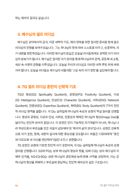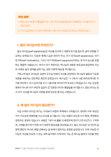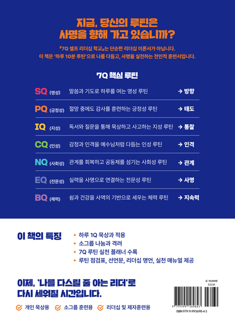 Á¦ 1Àå ¼¿ÇÁ ¸®´õ½ÊÀÇ ÀÇ¹Ì¿Í ½ÅÇÐÀû ±âÃÊ 12p • ÀÏ»ó ¼Ó ·çƾÀ» ÅëÇØ ¡®Å鳯À» °¡´Â ¸®´õ½Ê¡¯À» ½ÇõÇÏ´Â ½Ã´ëÀû ¿ä±¸ • ¼º·É ¾È¿¡¼ ÀÚ½ÅÀ» ÈÆ·ÃÇϰí, ³»¸éÀ» ´Ùµë´Â ÀüÀÎÀû ¸®´õ½Ê ±â¹Ý Á¦ 2Àå 7Q ¼¿ÇÁ ¸®´õ½ÊÀÇ ±¸Á¶¿Í ½ÇÁ¦ Àû¿ë 19p • 7Q¶õ ¹«¾ùÀΰ¡? SQ–BQ±îÁöÀÇ ÀüÀÎÀû ±¸¼º • °¢ QÀÇ ÅëÇÕÀû ÀÛµ¿°ú ·çƾÈÀÇ Á߿伺 PART 2. 7Q ·çƾ ÈÆ·Ã – °¢ Qº° ÀÇ¹Ì¿Í ½Çõ 29p Á¦ 3Àå SQ – ¿µ¼º ·çƾ: Çϳª´Ô°úÀÇ ¿¬°á ¿©Á¤ 30p • 4Â÷¿ø ¿µ¼ºÀ» ÅëÇÑ ³»¸é ÈÆ·Ã°ú Çϳª´ÔÀÇ ÀÓÀç ÈÆ·Ã • Çϳª´ÔÀÇ À½¼ºÀ» µè´Â ·çƾ°ú ¿¹¾ðÀû »îÀÇ ½Çõ Á¦ 4Àå PQ – ±àÁ¤¼º ·çƾ: Àý¸ÁÀ» ÇØ¼®ÇÏ´Â ¹ÏÀ½ÀÇ ¾ð¾î ÈÆ·Ã 37p • Àý´ë±àÁ¤°ú ¿ÀÁß±àÁ¤À» ÅëÇÑ ½Å¾ÓÀû ÇØ¼® ÈÆ·Ã • ȸº¹Åº·Â¼º°ú ±àÁ¤ ¼±¾ð ·çƾÀ» ÅëÇÑ °øµ¿Ã¼ ¸®´õ½Ê ½Çõ Á¦ 5Àå IQ – Áö¼º ·çƾ: Çϳª´ÔÀ» °æ¿ÜÇÏ´Â ÅëÂûÀÇ Áö¼º ¼¼¿ì±â 44p • Çϳª´ÔÀ» °æ¿ÜÇÏ´Â Áö¼ºÀ¸·Î »îÀÇ ¹æÇ⠺к° • ¸»¾¸, Áú¹®, ¼ºÂûÀÇ ·çƾÀÌ °¡Á®¿À´Â ¸®´õÀÇ ÅëÂû Á¦ 6Àå CQ – Àμº ·çƾ:¼º·ÉÀÇ ¿¸Å·Î ¼ºÇ°À» ±æ·¯°¡´Â ¿©Á¤ 51p • Á¤Á÷, °â¼Õ, ¿ë¼ µî ÀÎ°Ý Çü¼ºÀ» À§ÇÑ ·çƾ ½Çõ • ¿¹¼ö´ÔÀÇ ¼ºÇ°À» ´à¾Æ°¡´Â Àμº ¼ºÀå°ú °øµ¿Ã¼ ¸®´õ½Ê ÈÆ·Ã Á¦ 7ÀåNQ – »çȸ¼º ·çƾ:°ü°èÀÇ ´Ù¸®¸¦ ³õ´Â ¸®´õ½Ê ÈÆ·Ã 58p • »ïÀ§ÀÏüÀû °ü°è¼º¿¡ ±âÃÊÇÑ °ø°¨°ú ȸº¹ÀÇ ¸®´õ½Ê ÈÆ·Ã • °¨Á¤ ÀνÄ, ȸº¹Àû ´ëÈ, °øµ¿Ã¼Àû ¿¬°áÀ» À§ÇÑ »çȸ¼º ·çƾ ½Çõ Á¦ 8Àå EQ – Àü¹®¼º ·çƾ:¼Ò¸íÀ» ½Ç·ÂÀ¸·Î, ½Ç·ÂÀ» Ź¿ùÇÔÀ¸·Î 66p • ¹Ýº¹ ÈÆ·ÃÀ» ÅëÇÑ Å¹¿ù¼º ±¸Ãà°ú °Á¡ ±â¹ÝÀÇ Àü¹®¼º °³¹ß • ¼Ò¸í, °Á¡, ¹è¿ò, ½ÇõÀ» ÅëÇÕÇÑ ½ÇÇà Á᫐ ¸®´õ½Ê ÈÆ·Ã Á¦ 9ÀåBQ – ü·Â ·çƾ:¸öÀ» ´Ù½º¸®´Â °Å·èÇÑ ÀÚ±â°ü¸® 74p • ¼ö¸é, ½Ä»ç, ¿îµ¿, ȸº¹À» ÅëÇÑ ÀüÀÎÀû ÀÚ±â°ü¸® ÈÆ·Ã • ¿¹¹èÀû ·çƾÀ» ÅëÇÑ Ã¼·Â ȸº¹°ú Áö¼Ó °¡´ÉÇÑ ¸®´õ½Ê ±¸Çö PART 3. 7Q »ç¸í ½Çõ°ú °øµ¿Ã¼ ¸®´õ½Ê 83p Á¦ 10Àå 7Q Áø´Ü°ú ·çƾ ½Çõ ¿©Á¤ 84p • 7QÀÚ±â Á¡°ËÀ» ÅëÇÑ ¸®´õ½Ê Áø´Ü • ÀÏ»ó ·çƾÀ» ÅëÇÑ »ç¸íÀÇ È¸º¹ Á¦ 11Àå 7Q ¸®´õÀÇ ÆÄ¼Û°ú °øµ¿Ã¼ ¸®´õ½ÊÀÇ ¼º¼÷ 95p • ÇÔ²² ½ÇõÇÏ´Â ·çƾ, ÇÔ²² ÀÌ·ç´Â »ç¸í • °øµ¿Ã¼ ¼Ó¿¡¼ °ËÁõµÇ°í ÆÄ¼ÛµÇ´Â ¸®´õÀÇ ¿©Á¤ PART 4. »ç¸íÀ» »ì¾Æ³»´Â 7Q Á¦ÀÚ ¸®´õ½Ê 103p Á¦ 12Àå 7Q ·çƾ¿¡¼ »ç¸íÀÚÀÇ ¸®´õ½ÊÀ¸·Î 104p • ¼¿ÇÁ ¸®´õ¿¡¼ »ç¸í ¸®´õ·ÎÀÇ Àüȯ ¿©Á¤ • ÀüÀÎÀû ·çƾÀ¸·Î ¿Ï¼ºµÇ´Â ¼Ò¸í Á᫐ ¸®´õ½Ê Á¦ 13Àå ÇöÀå¿¡¼ »ì¾Æ³»´Â 7Q Á¦ÀÚµµ 113p • 7Q Á¦ÀÚµµÀÇ °³³ä°ú ½ÇÁ¦ Àû¿ë • ½ÇõÀ¸·Î °ËÁõµÇ´Â ÀüÀÎÀû Á¦ÀÚµµ Ã¥ ¼ÓÀ¸·Î